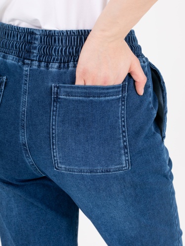 Джинсы «Basic» с завышенной талией длиной до щиколотки с имитацией гульфика без застежки. Джинсы слегка зауженные книзу, с легким варёным эффектом. На передних половинках расположены два кармана с отрезным бочком. На задних половинках два накладных кармана. Верх брюк обработан поясом на резинке со шнуром и металлическими наконечниками.