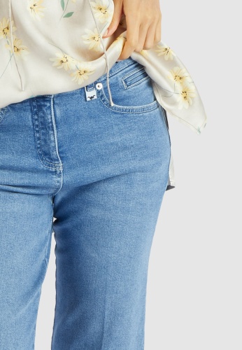 Укороченные расклешенные джинсы облегающего кроя из высококачественного денима с долей эластичности удобно прилегают к коже. Накладные задние карманы с эффектом пуш-ап оптимально подчеркивают изгибы. Джинсы имеют модную дополнительную длину с расклешенной ногой, которая характеризует расклешенный образ. Дизайн с 5 карманами структурирует джинсы и расставляет акценты.