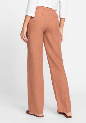 Брюки с передним и задним эластичным поясом, передними прорезными карманами и задними прорезными карманами. Изготовлено из любимого сезоном натурального волокна, чистого льна, обеспечивающего роскошный, дышащий комфорт и долговечность. Свободная посадка на бедре и посадка на естественной линии талии для эффекта удлинения ног.