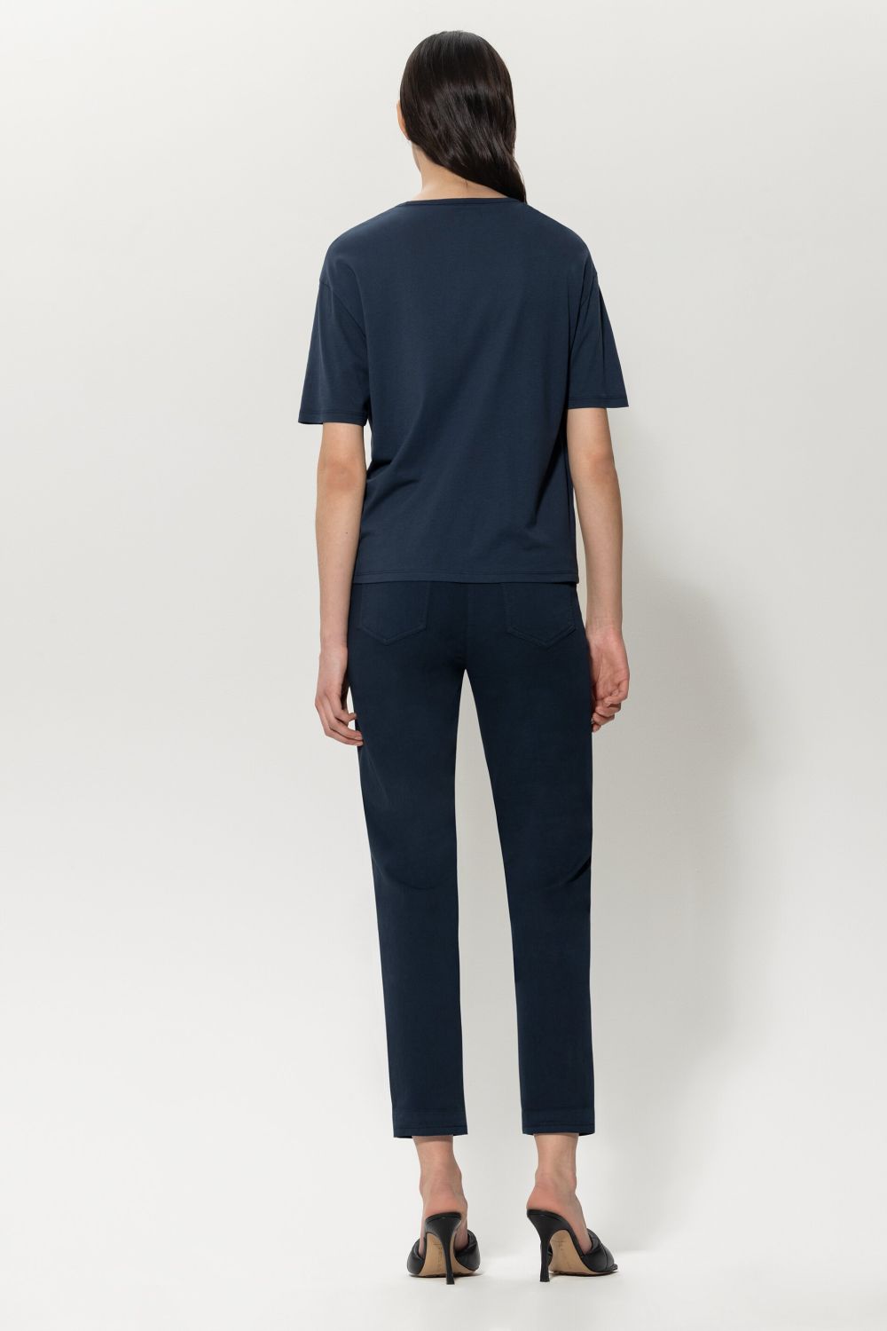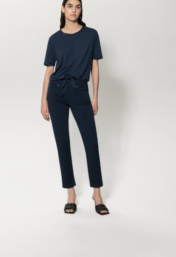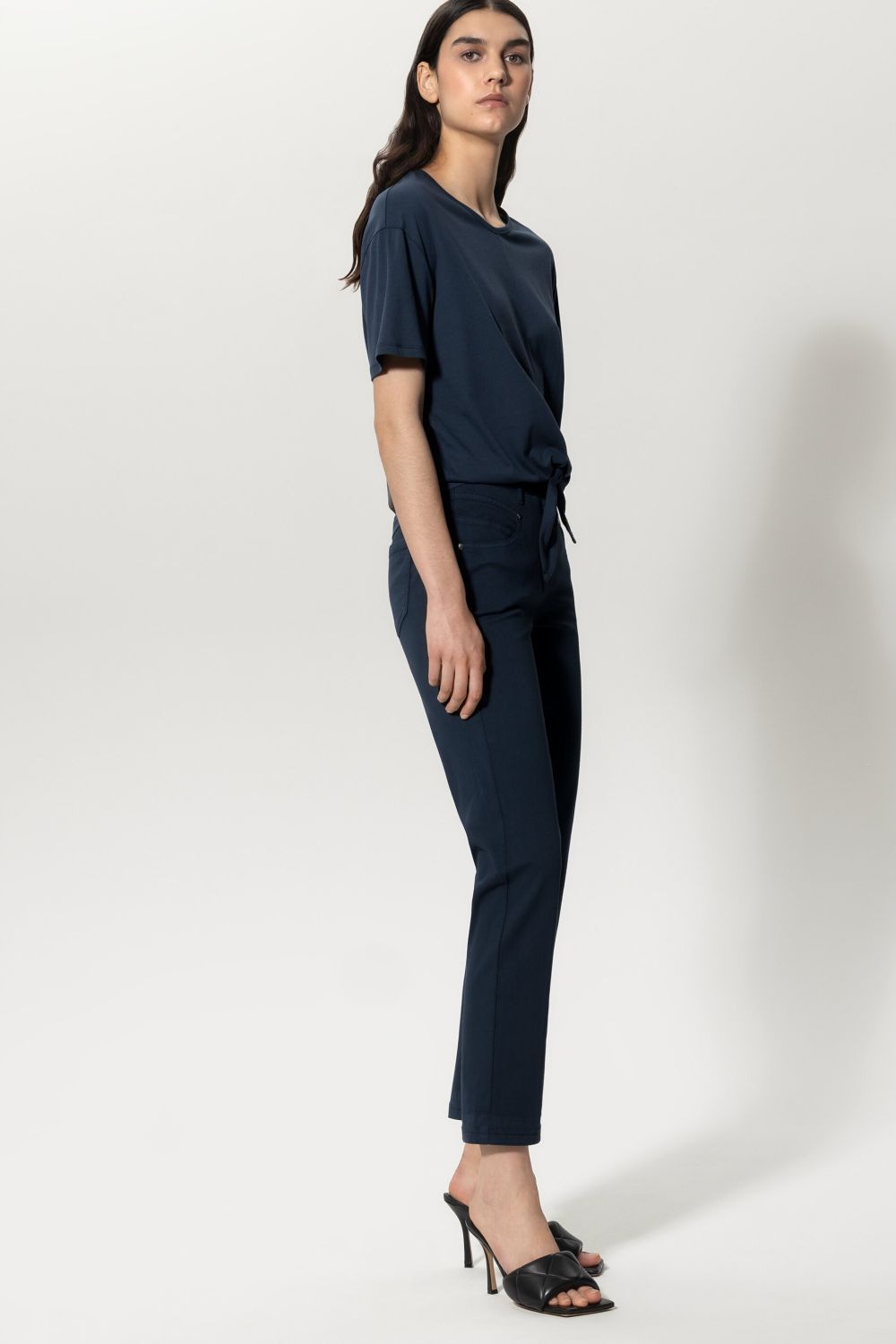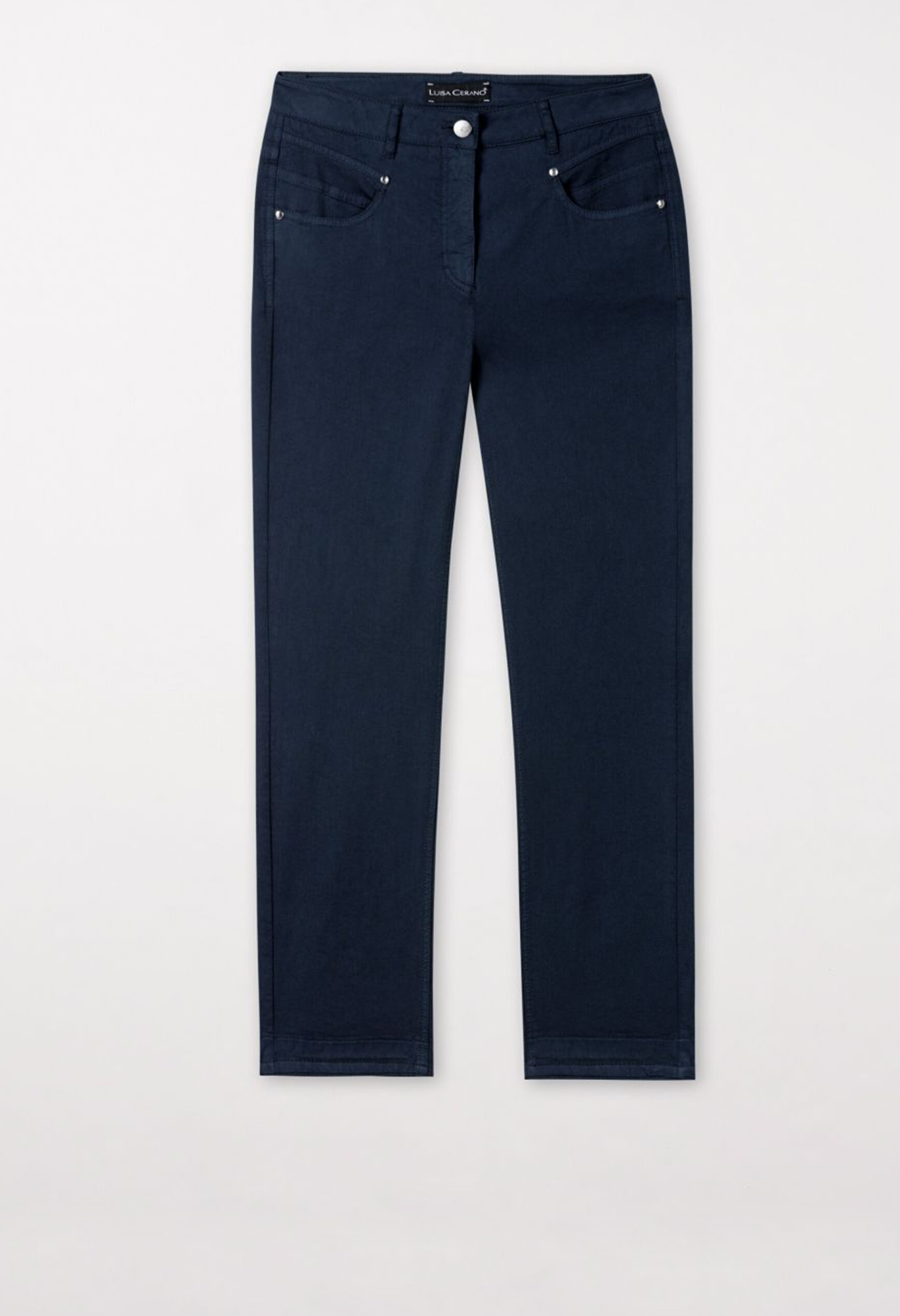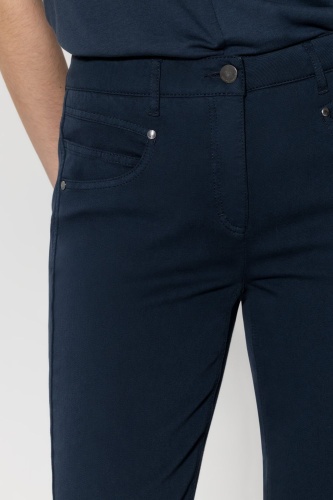 Укороченные брюки из легкого и мягкого денима RFD с элементами стрейч. Особенно бросается в глаза характерный дизайн диагонального кармана. Застежка на пуговицу и молнию. Два врезных кармана, один карман для монет и два набедренных кармана.