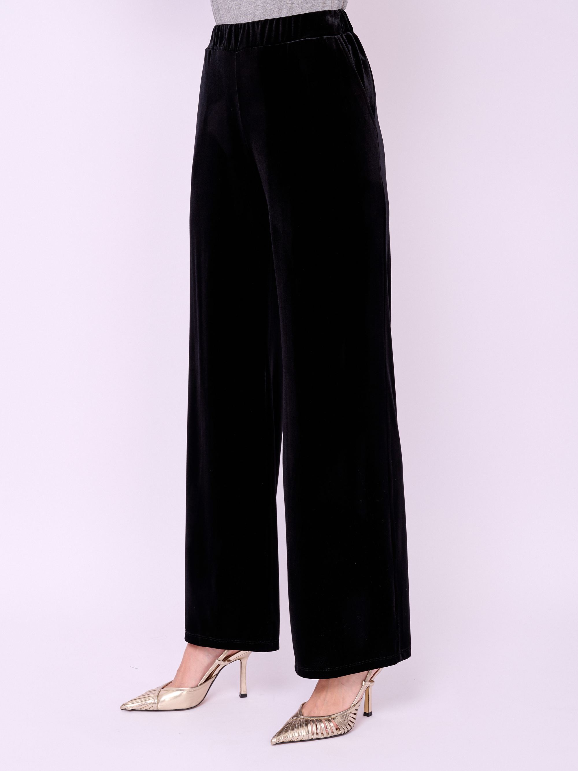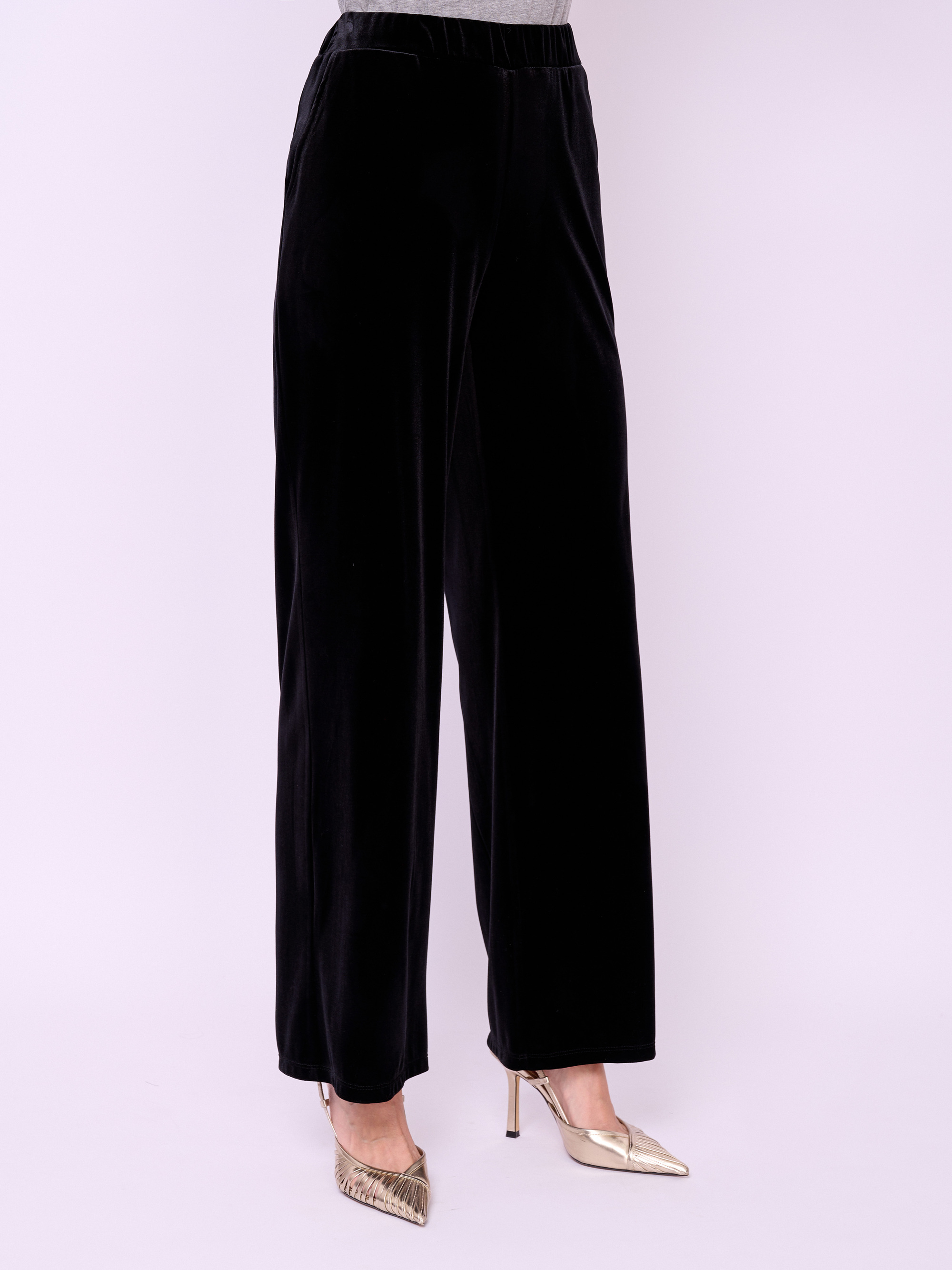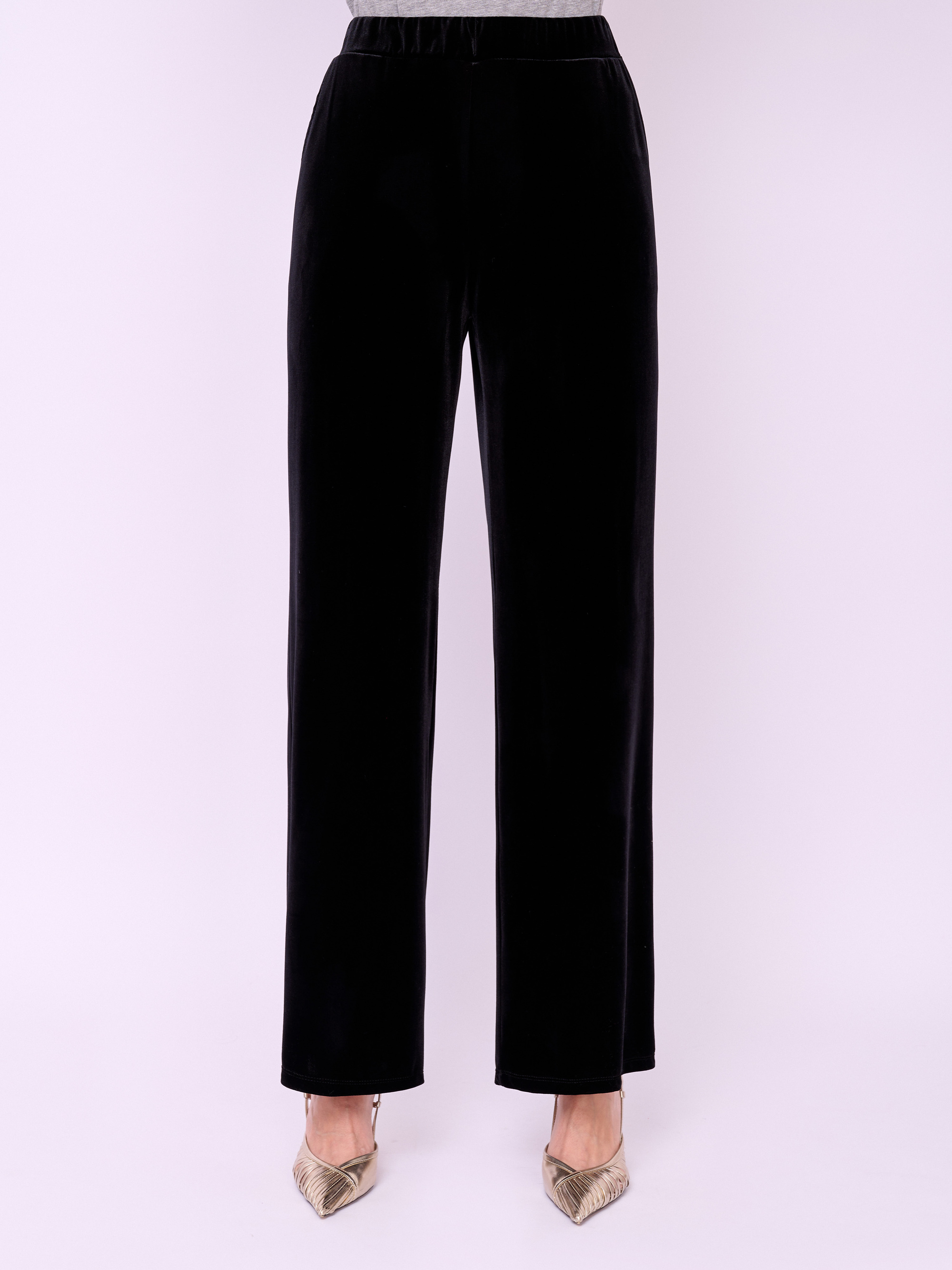 Прямые брюки из бархатного трикотажа на резинке с косыми карманами. Длина брючин: 82 см