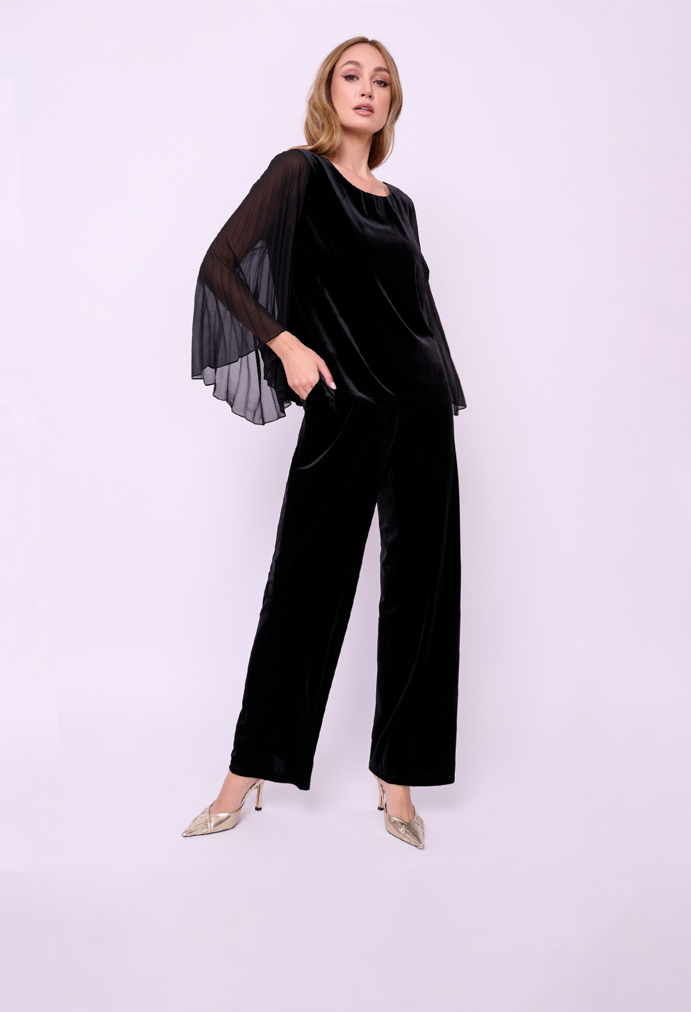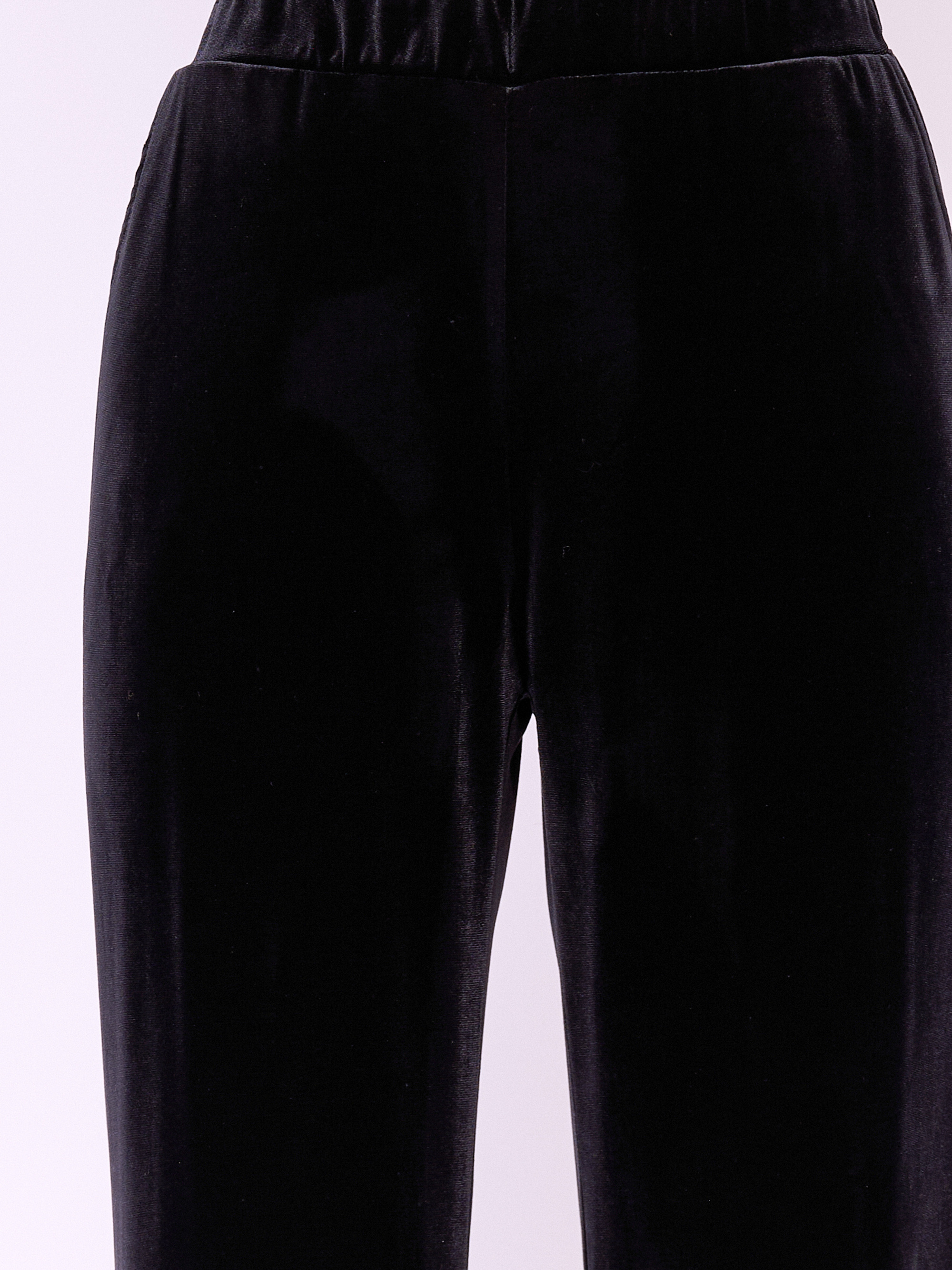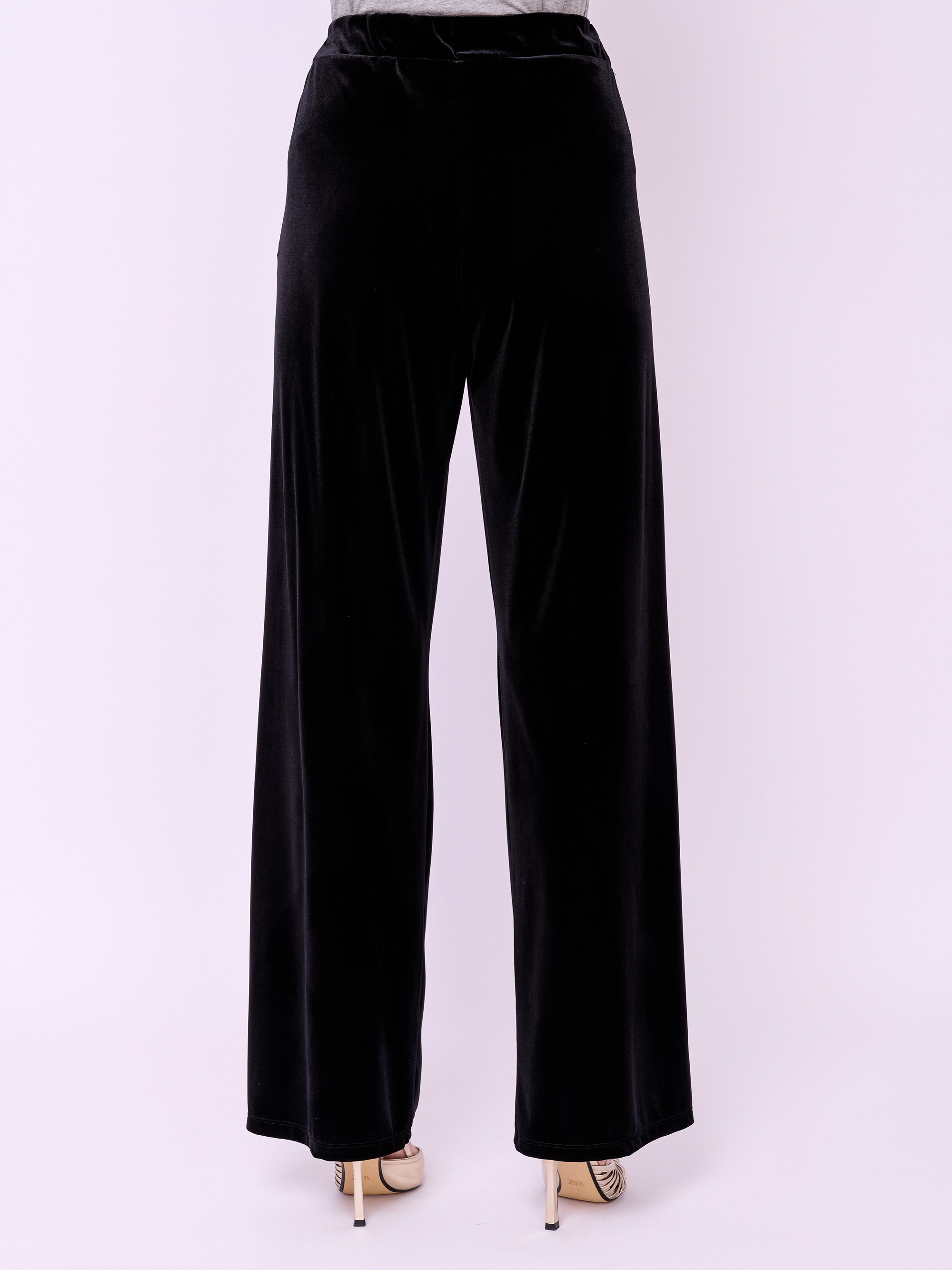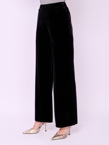 Прямые брюки из бархатного трикотажа на резинке с косыми карманами. Длина брючин: 82 см