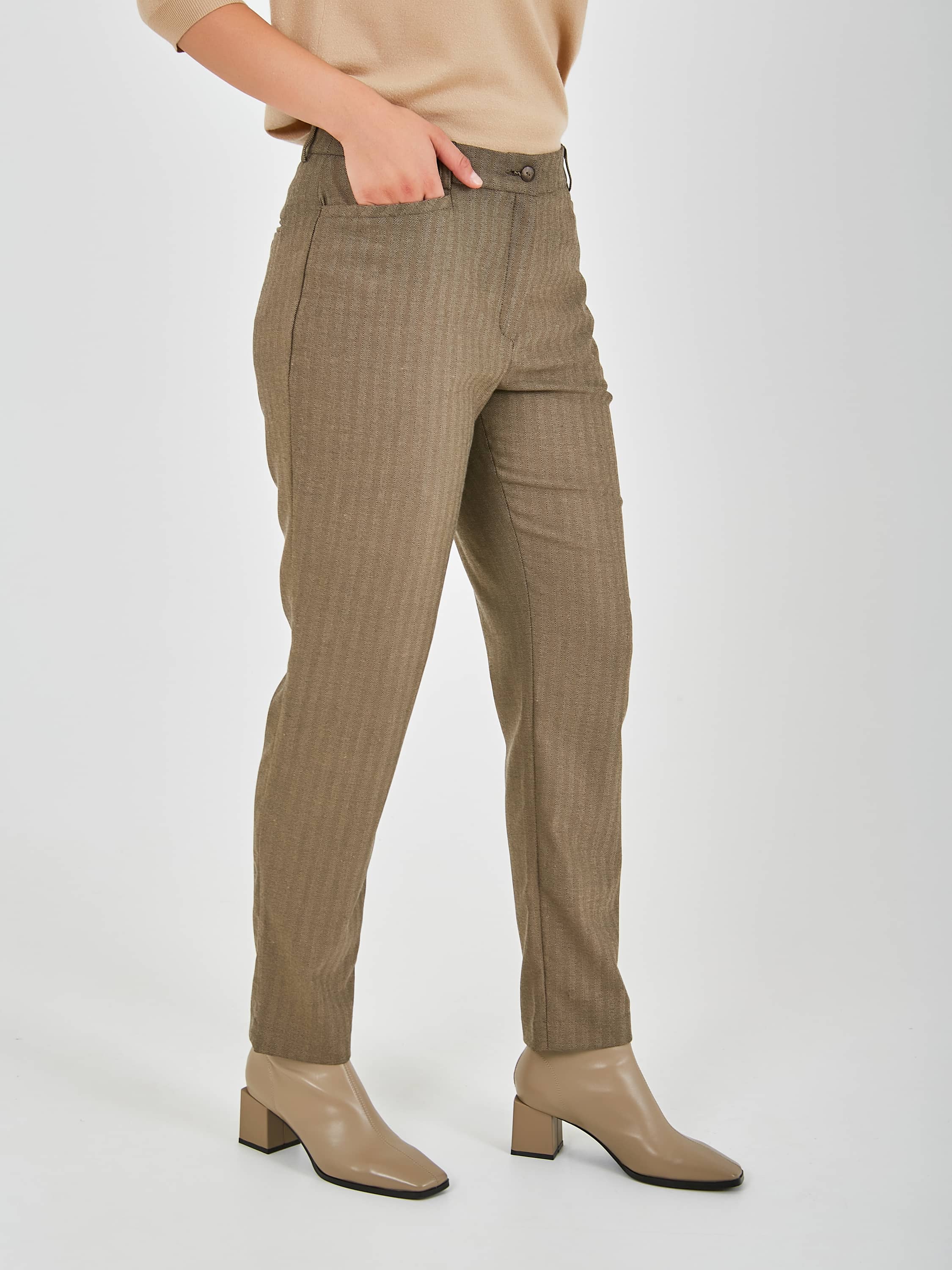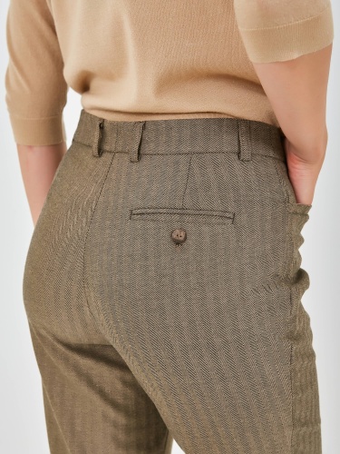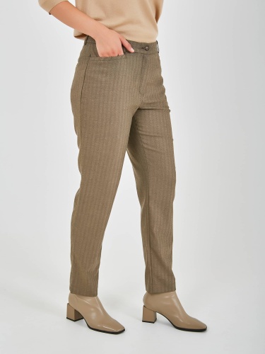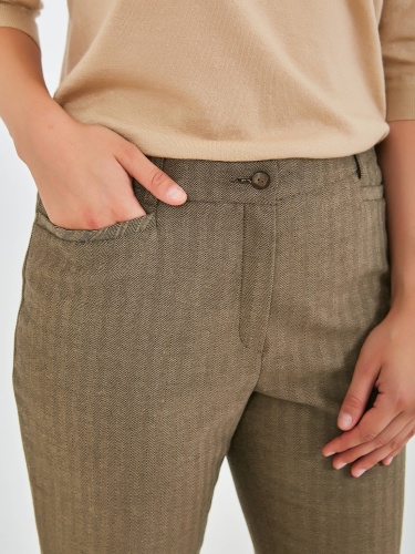 Длинные прямые брюки, с застежкой на молнию и одну пуговицу, дизайнерская особенность модели - рисунок "ёлочка". Брюки зауженные книзу. На передних половинках расположены два кармана с отрезным бочком и листочкой. На задних половинках также расположены два кармана с листочкой. Верх брюк обработан поясом и шлевками.