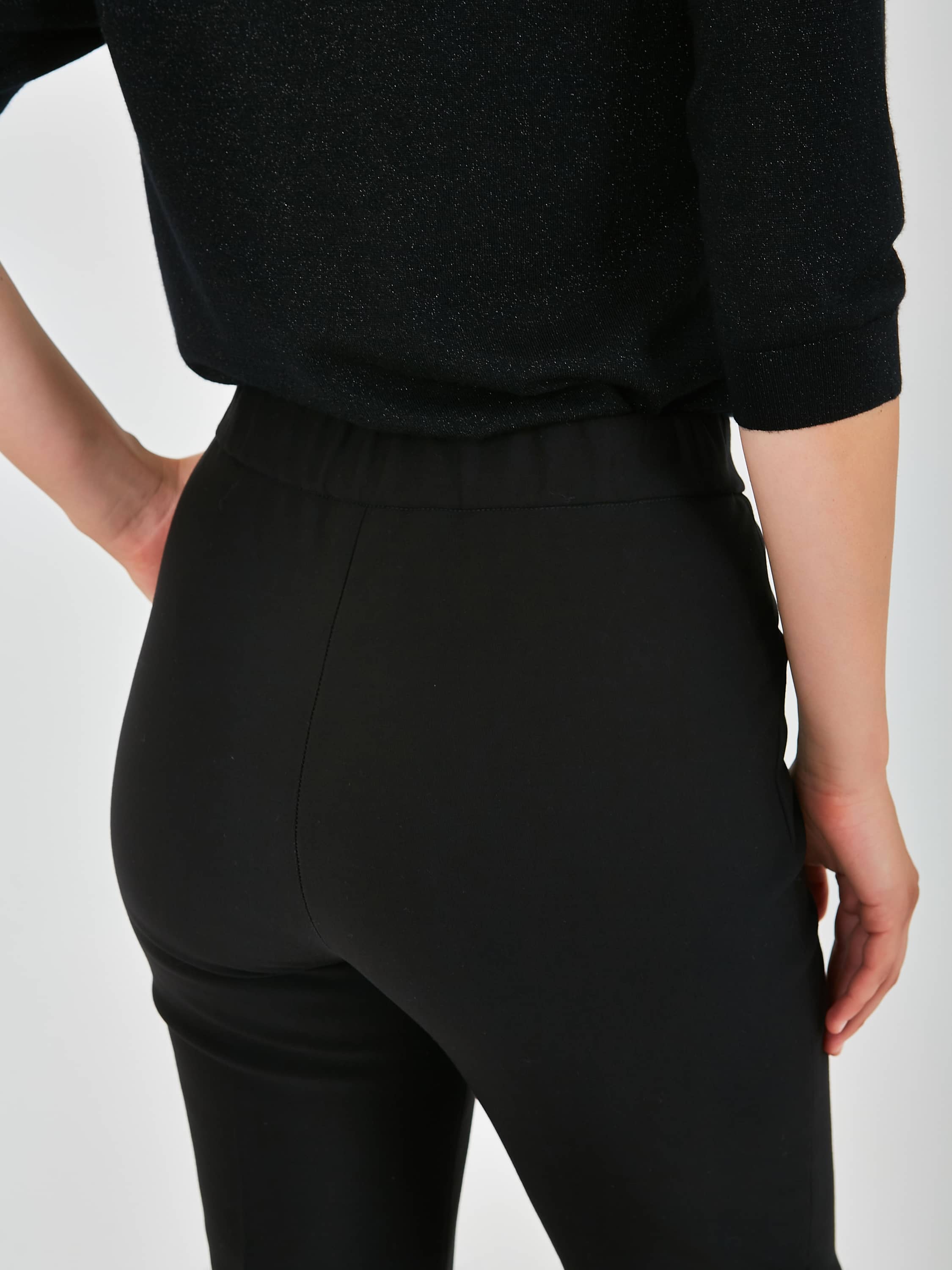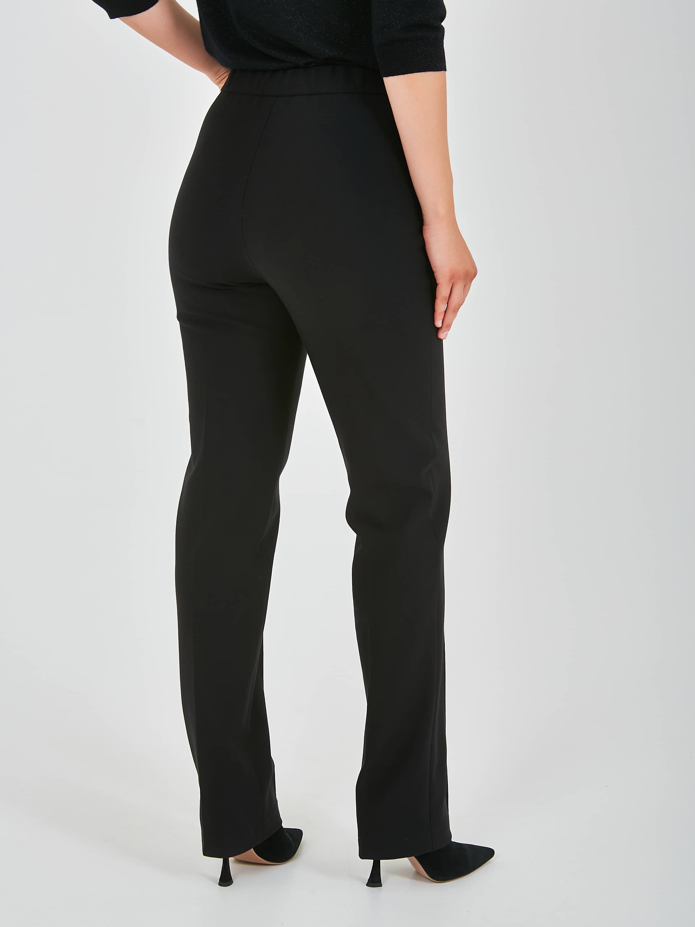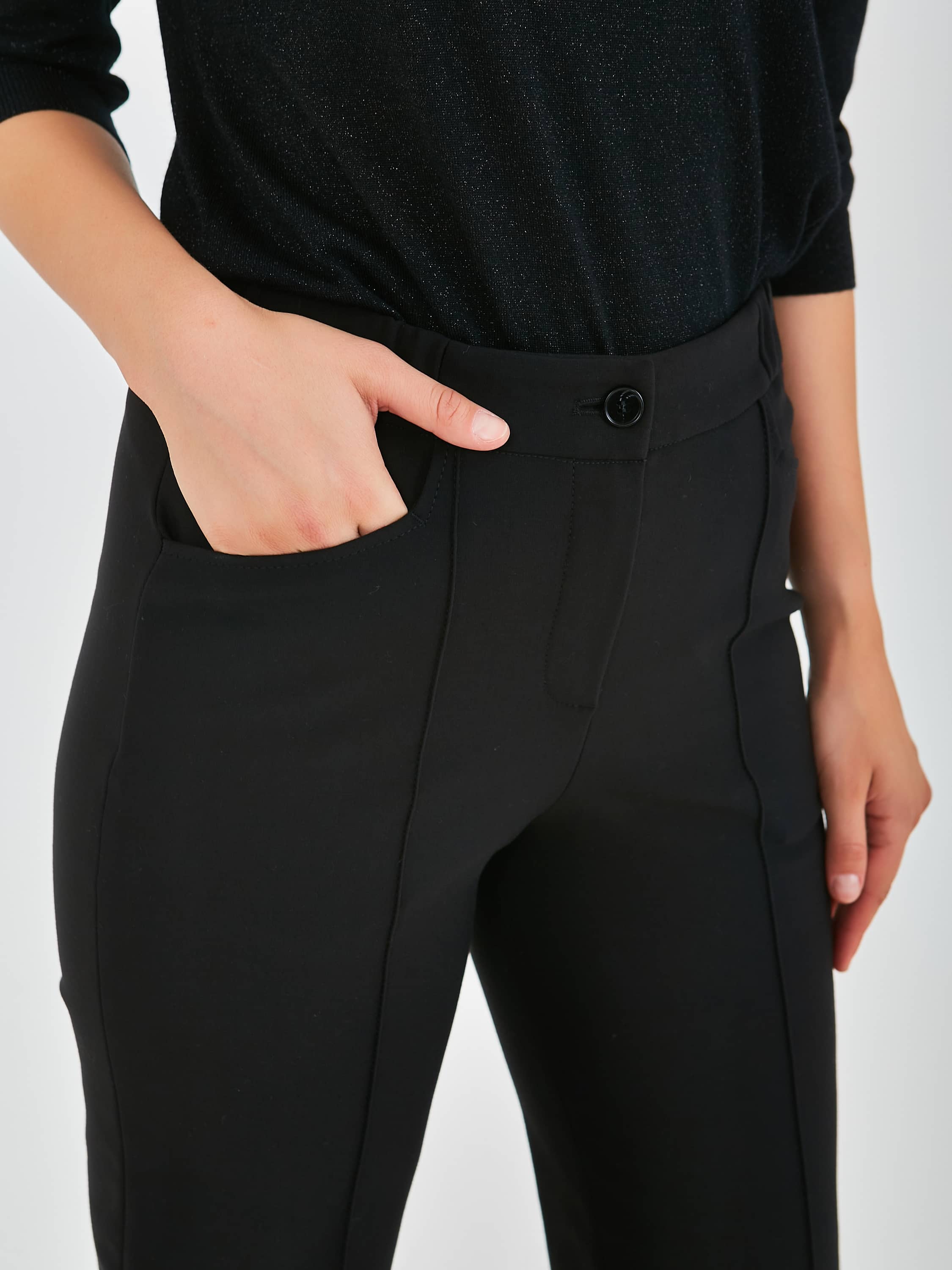 Длинные прямые брюки, с застежкой на молнию и одну пуговицу. Брюки, слегка зауженные книзу. На передних половинках расположены два кармана с отрезным бочком, а также декоративные швы, имитирующие стрелки, по всей длине брючины. Верх брюк обработан поясом на резинке.