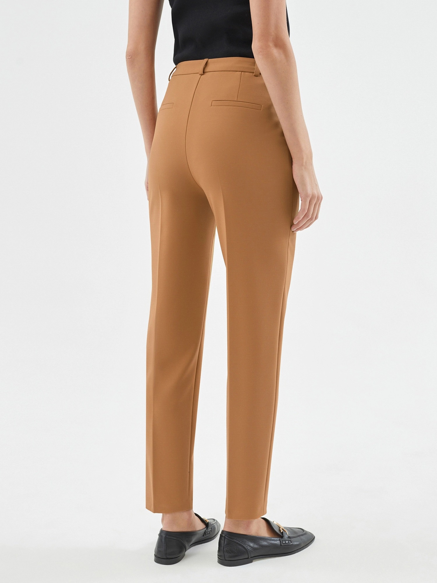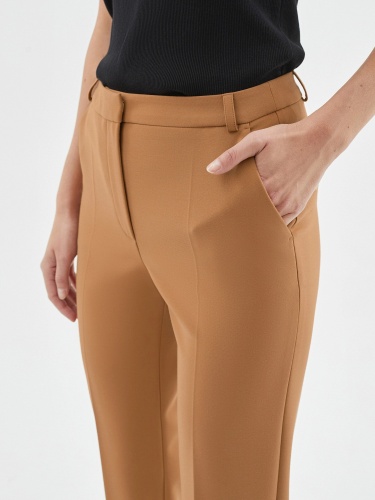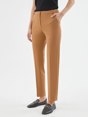 Брюки со стрелками из костюмной ткани зауженного к низу силуэта на притачном поясе со шлевками. Спереди рабочие боковые карманы и застежка на молнию и крючок.