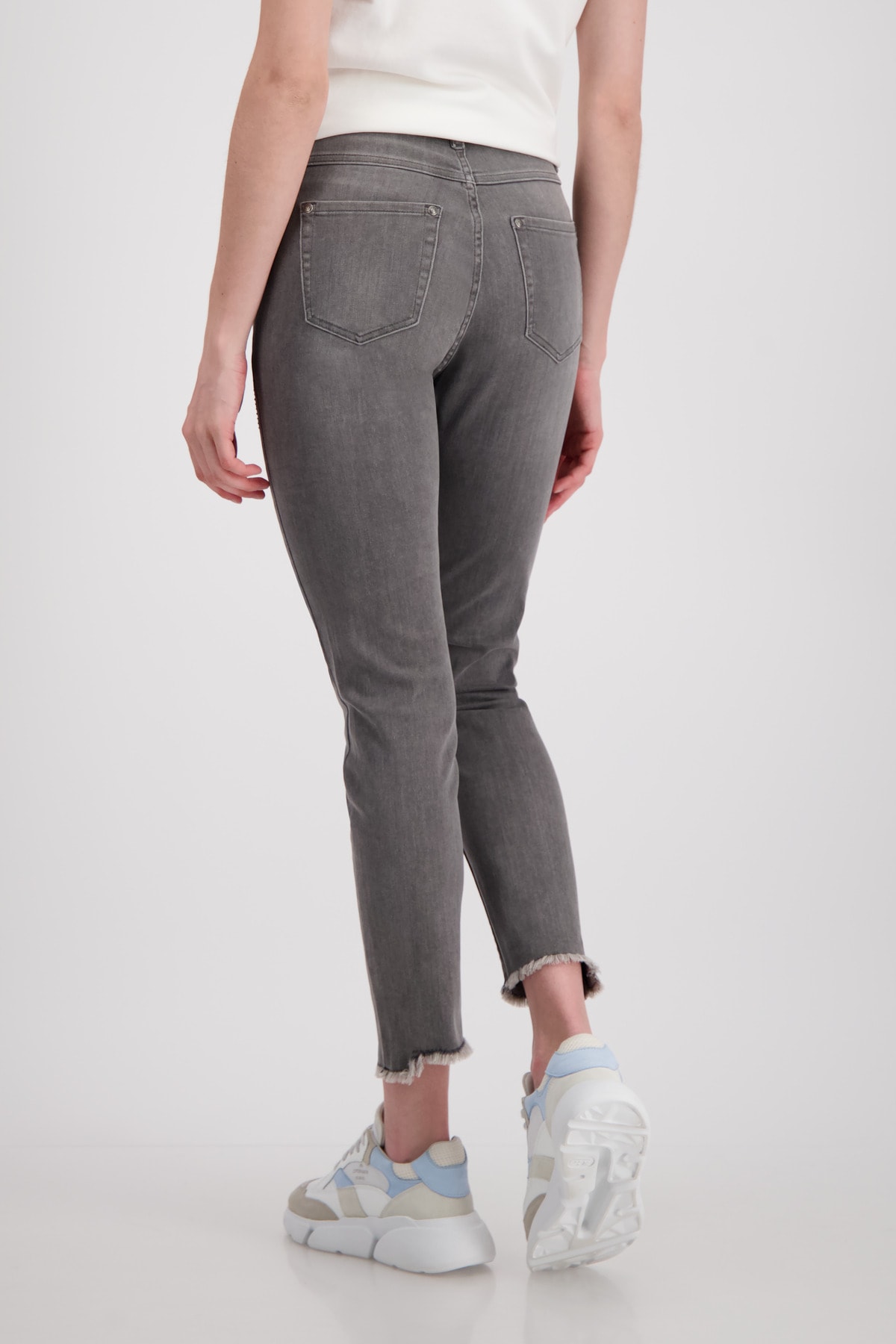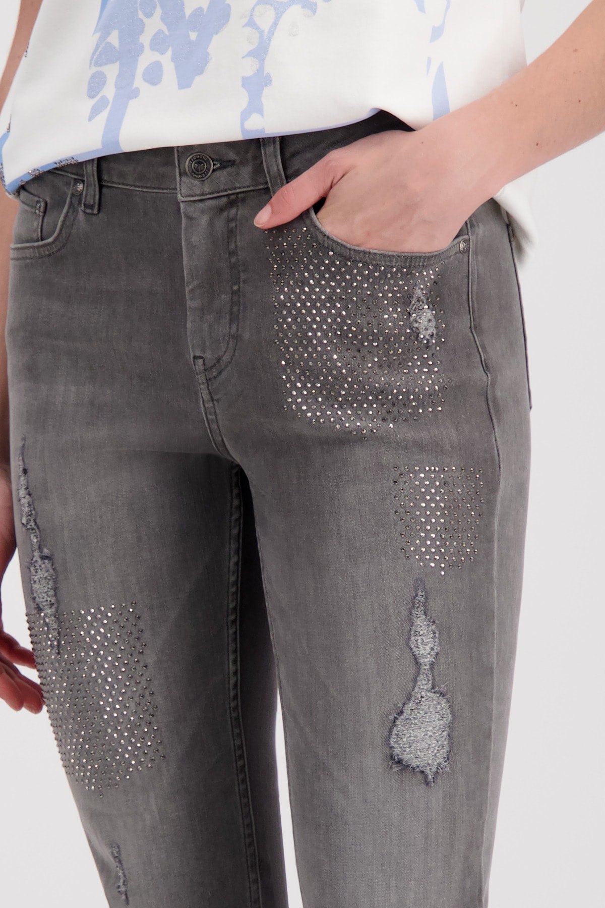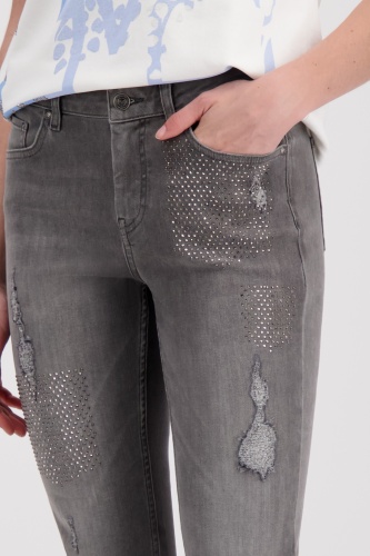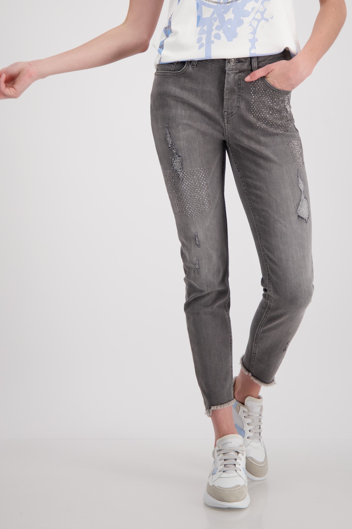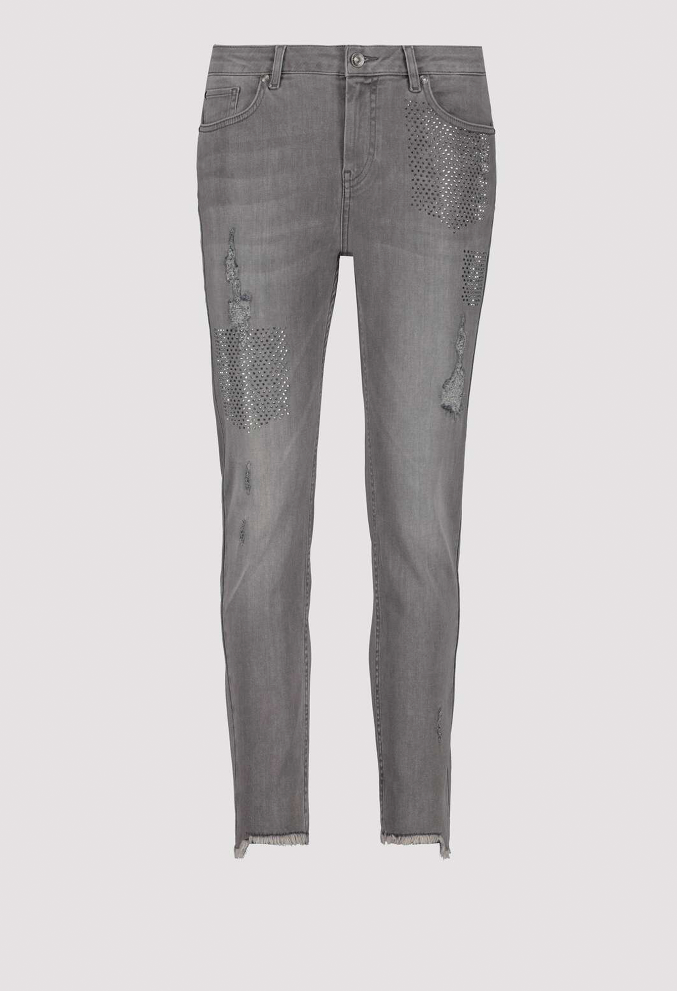 Джинсы узкого кроя имеют особые изюминки, такие как потрепанные детали со стразами и бахрома на отдельных манжетах. Высокое содержание хлопка и легкая эластичность гарантируют идеальную посадку. Длина внутренней штанины для всех размеров 70 см.