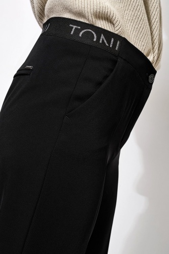 Деловые брюки с широкими штанинами, резинкой, заутюженными складками и из немнущегося материала.
