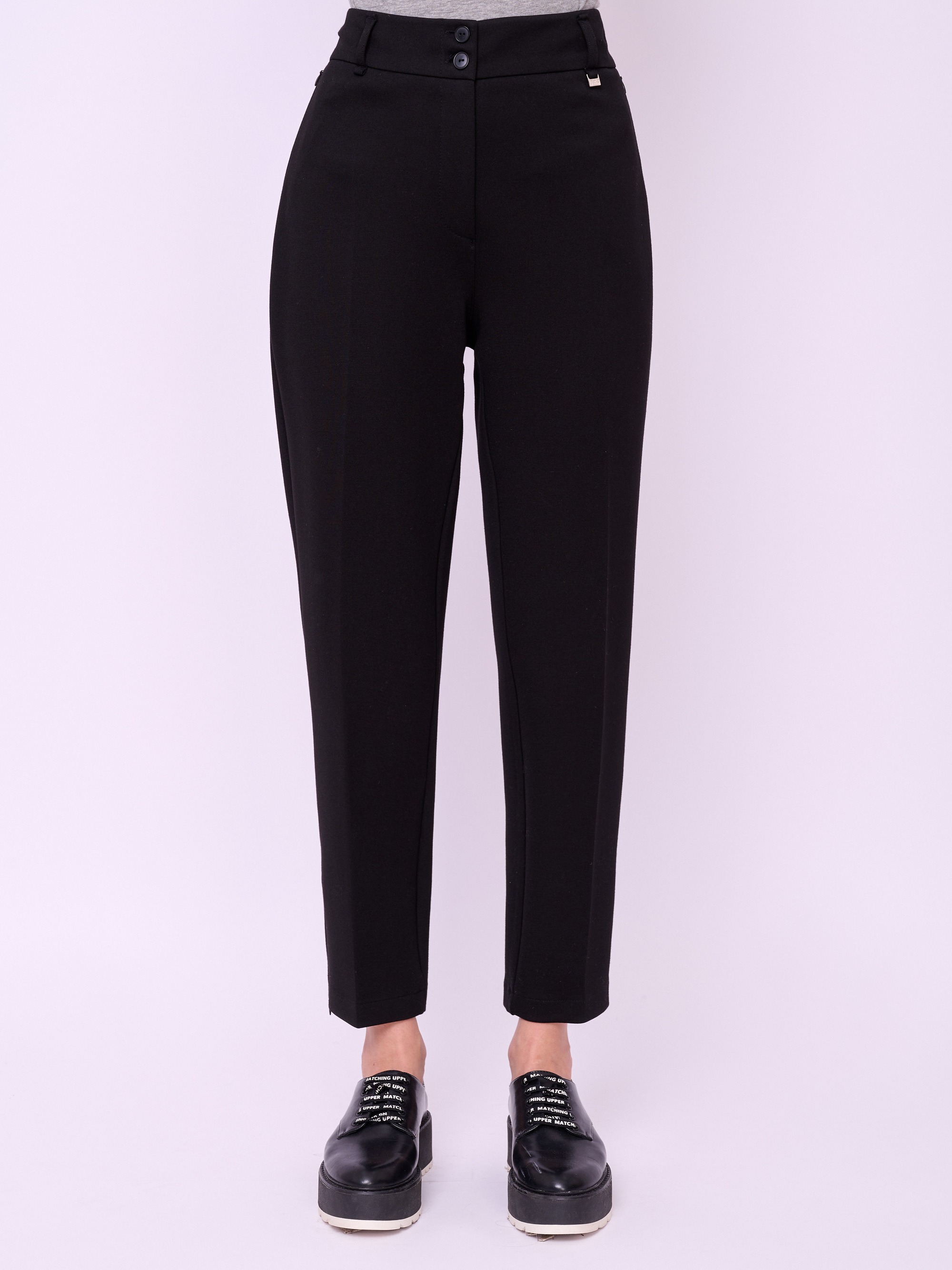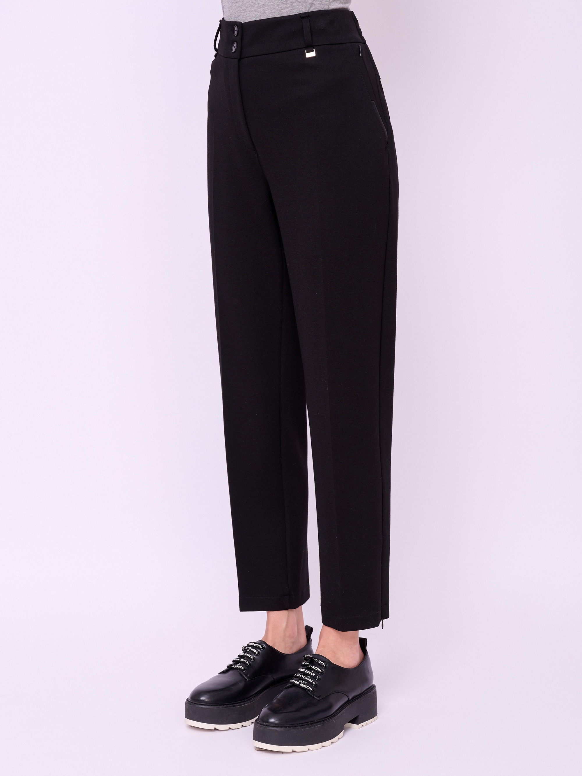 Зауженные брюки из плотного, тяжелого трикотажа на молнии и резинке с прорезными карманами на молнии, стрелками и боковыми разрезами на молнии. Длина брючин: 76 см.