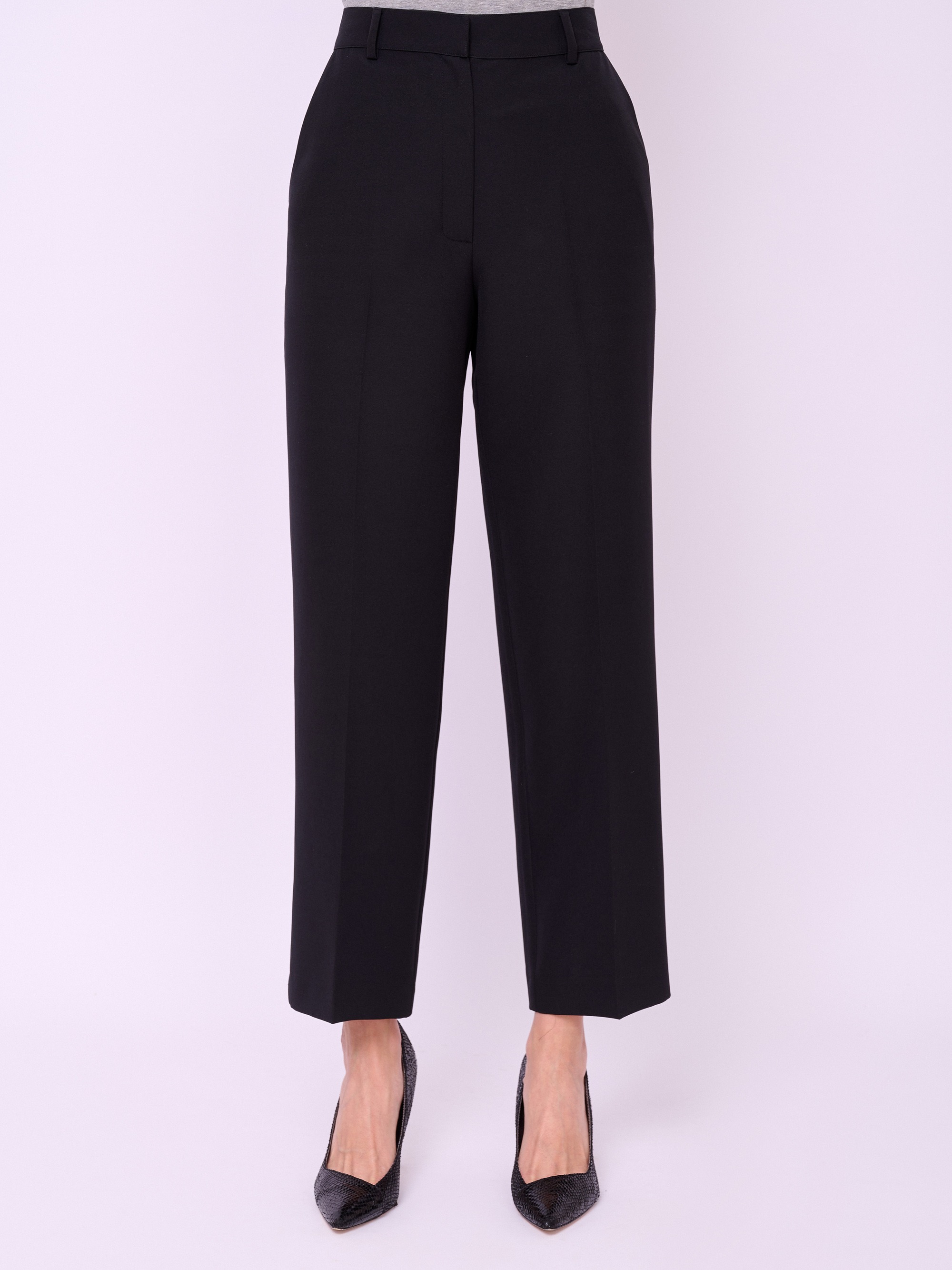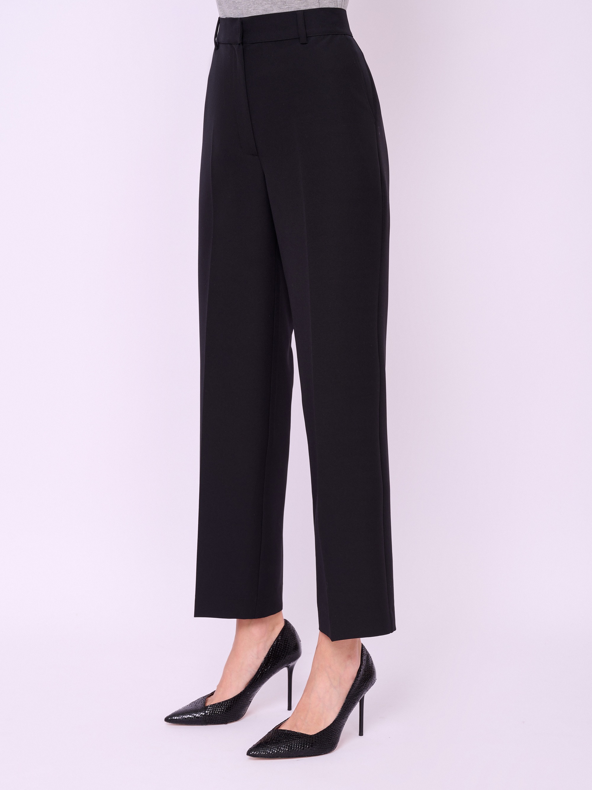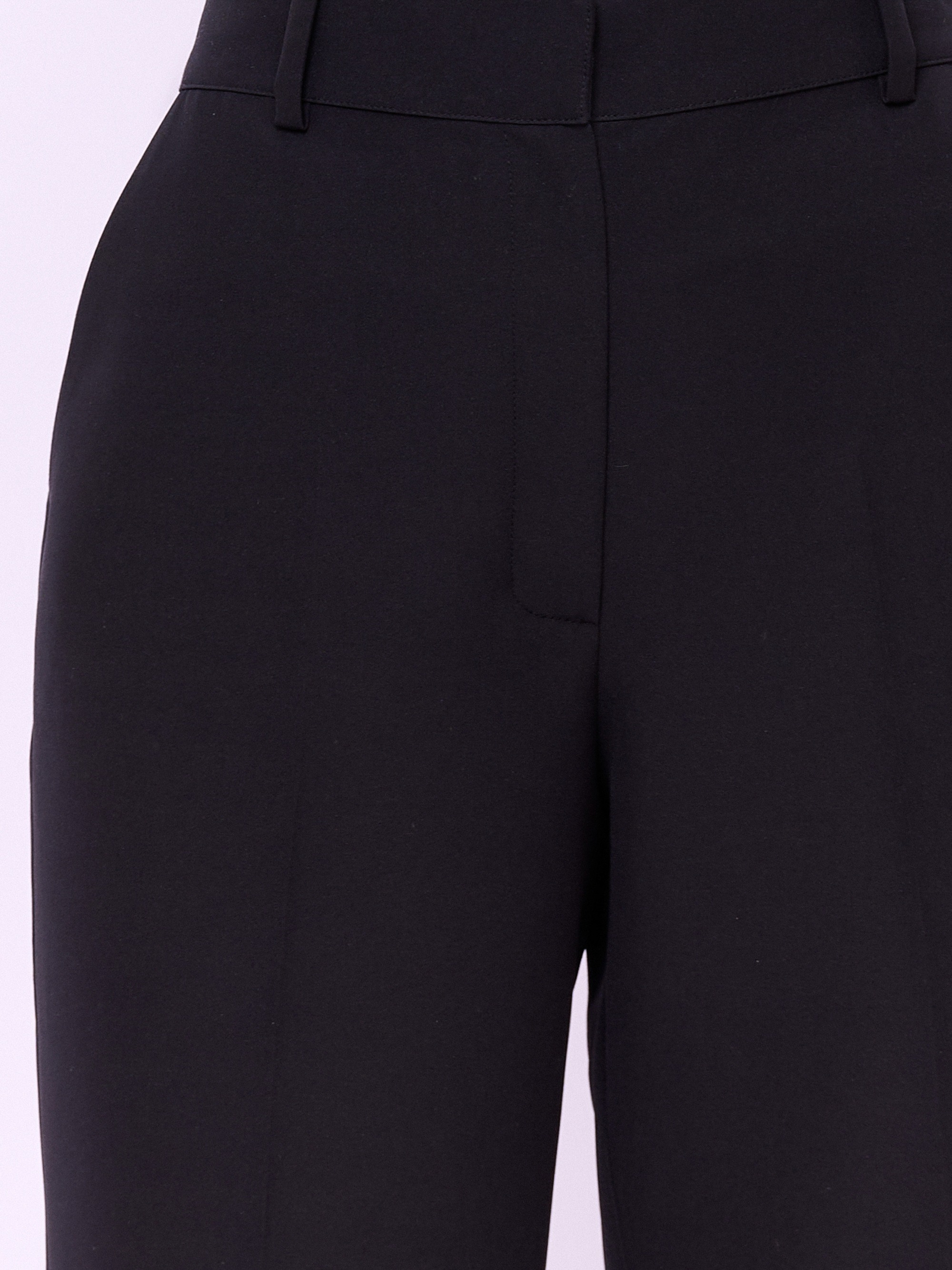 Зауженные костюмные брюки на молнии с косыми карманами, шлевками на поясе и стрелками. Длина брючин: 76 см.