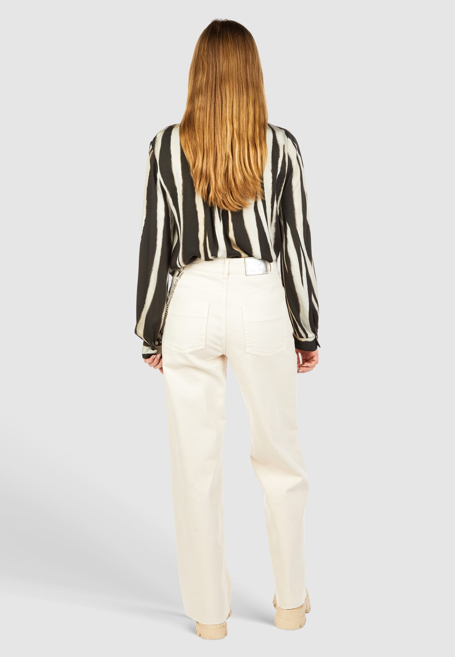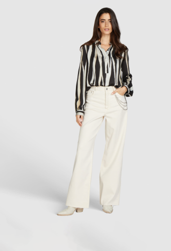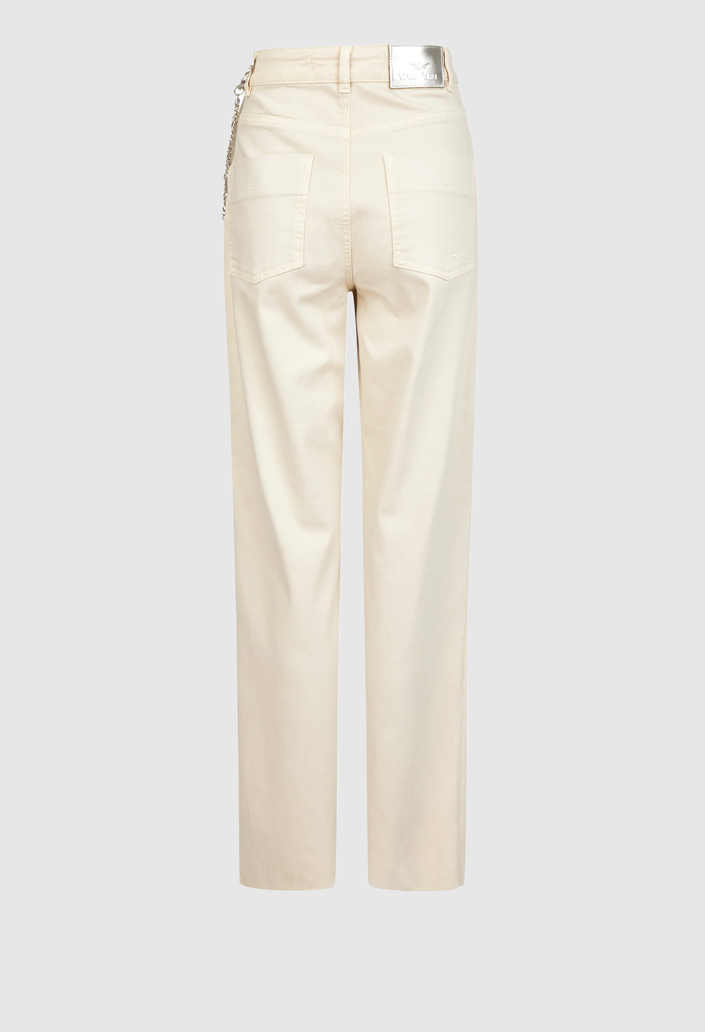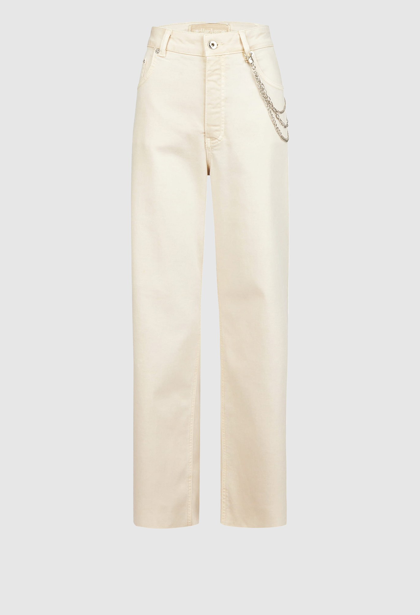 Брюки с высокой талией изготовлены из экологически чистой смеси хлопка и лиоцелла с добавлением стрейча. Свободный крой с широкими штанинами прекрасно дополняется открытым подолом, создавая непринужденный стиль. Серебряная съемная ювелирная цепочка также привлекает внимание.
