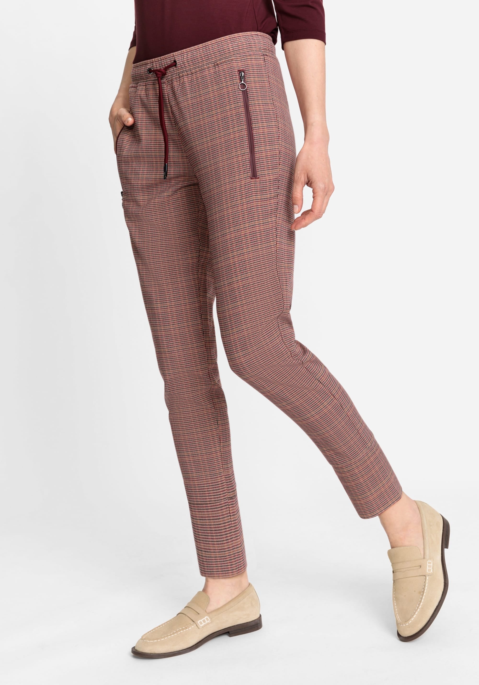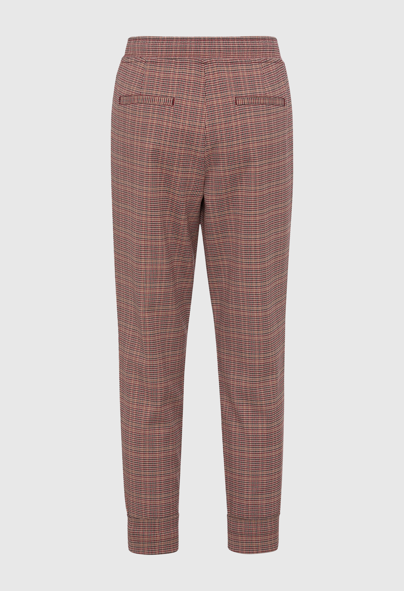 Брюки в стиле джоггеров украшены классическим рисунком «гусиные лапки» по всей поверхности. Талия на шнурке, задние прорезные карманы и боковые карманы на молнии. Подол можно застегнуть или завернуть в манжеты. Посадка расслаблена в бедрах и сидит немного ниже естественной линии талии для комфорта.