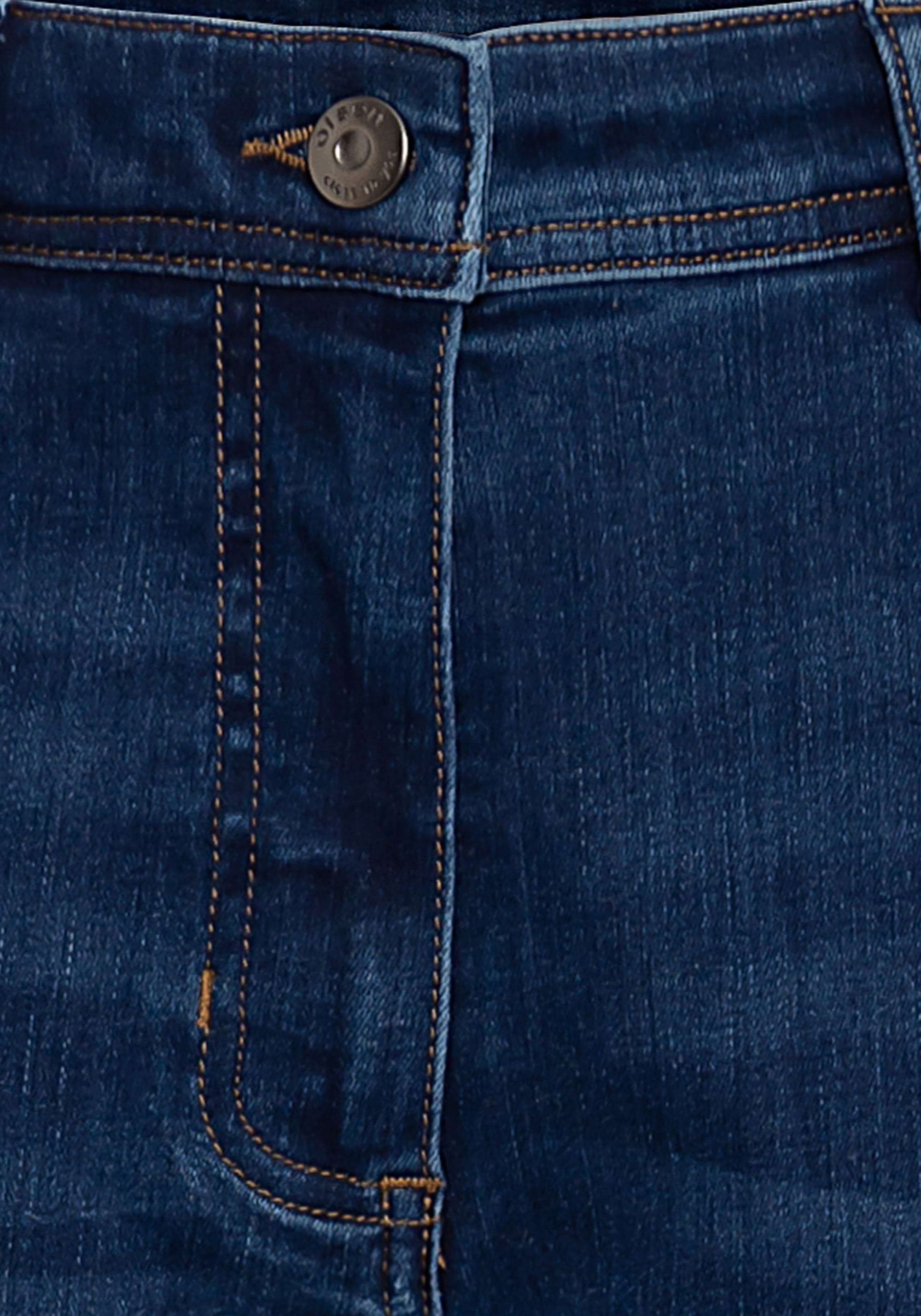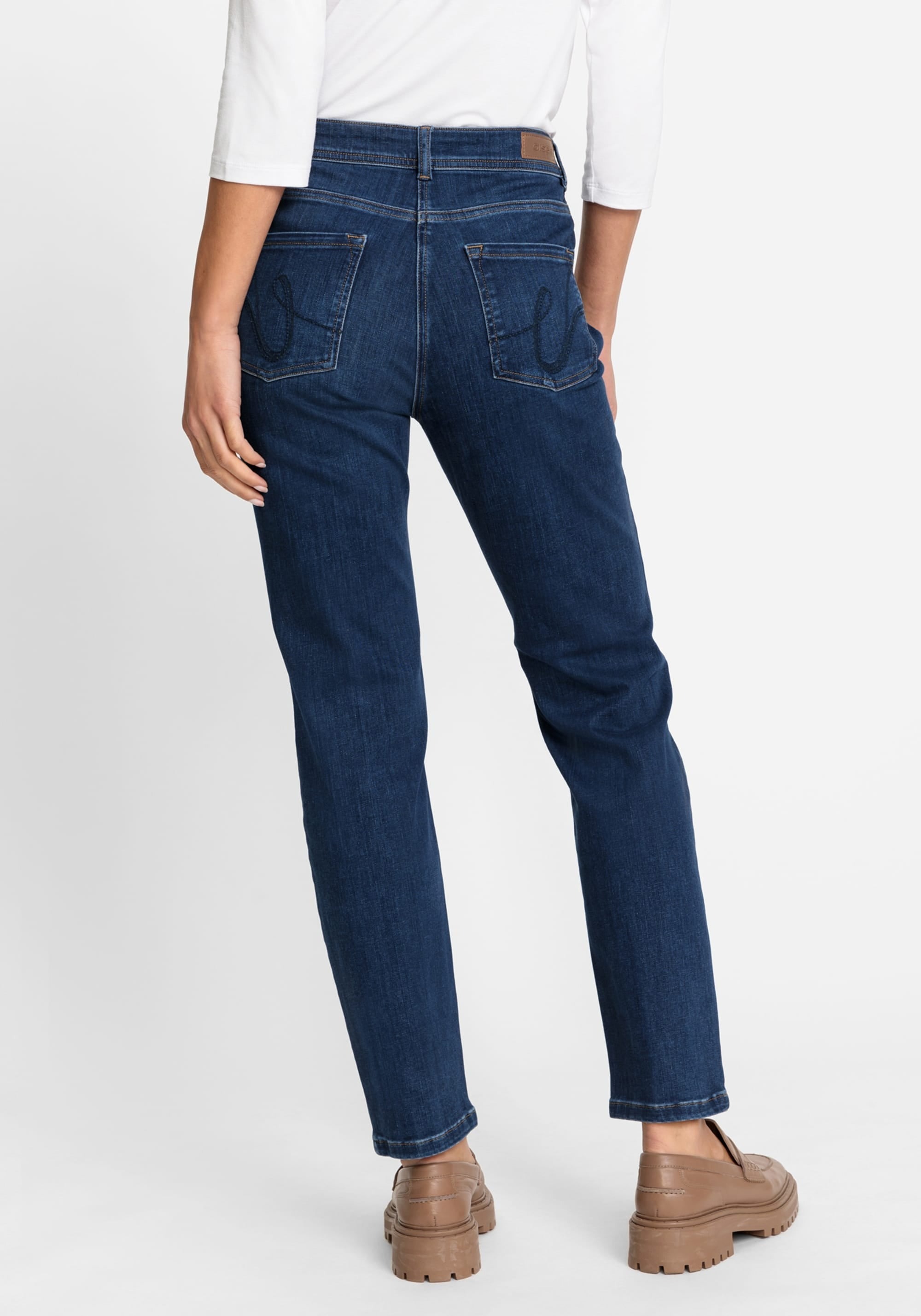 Джинсы из темного денима с легким эффектом стирки имеют классический джинсовый дизайн с пятью карманами и вышитыми задними карманами. Они сидят прямо на естественной линии талии, удлиняя ноги и обеспечивая свободную посадку в области бедер.