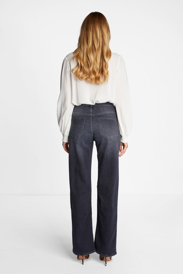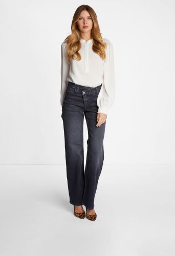 Джинсы оснащены диагональной молнией и V-образным поясом. Они также впечатляют сочетанием материалов с органическим хлопком. Широкая штанина удобна в ношении. Длина для размера 42: 82 см.