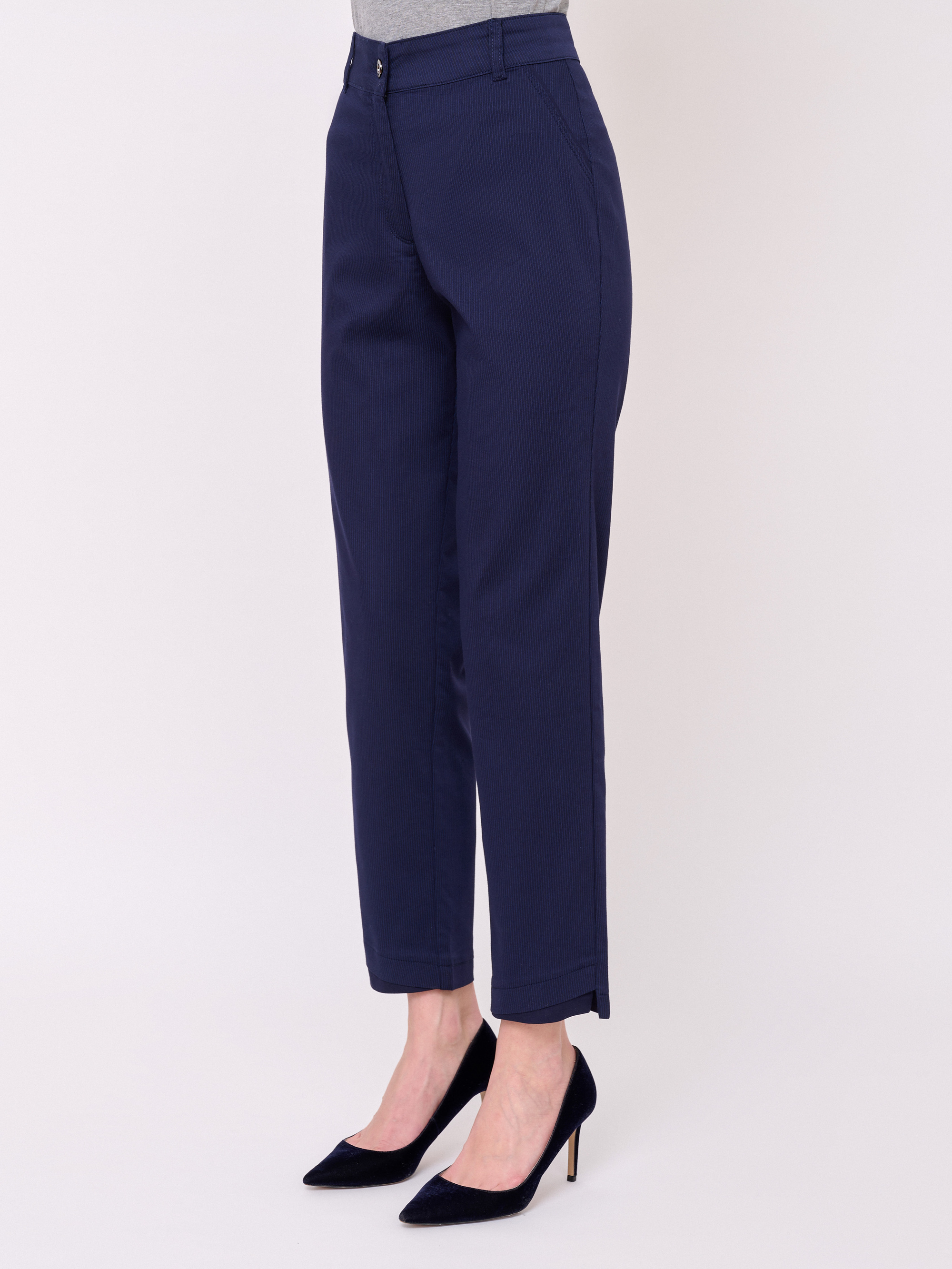 Застежка молния, рисунок полоска, карманы косые, крой брючин прямой, посадка средняя, боковые разрезы. Длина брючин: 70 см.