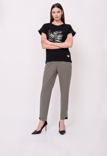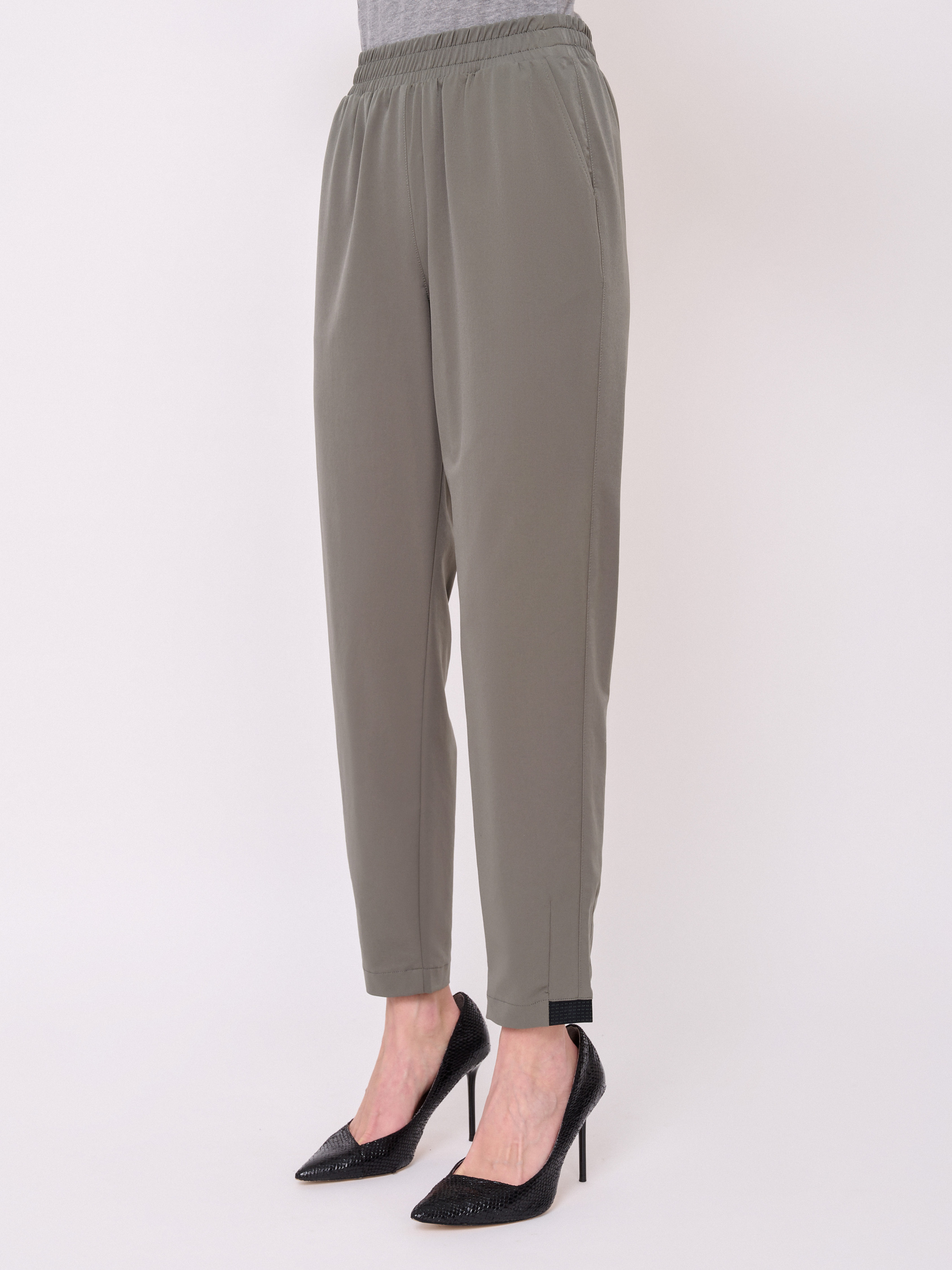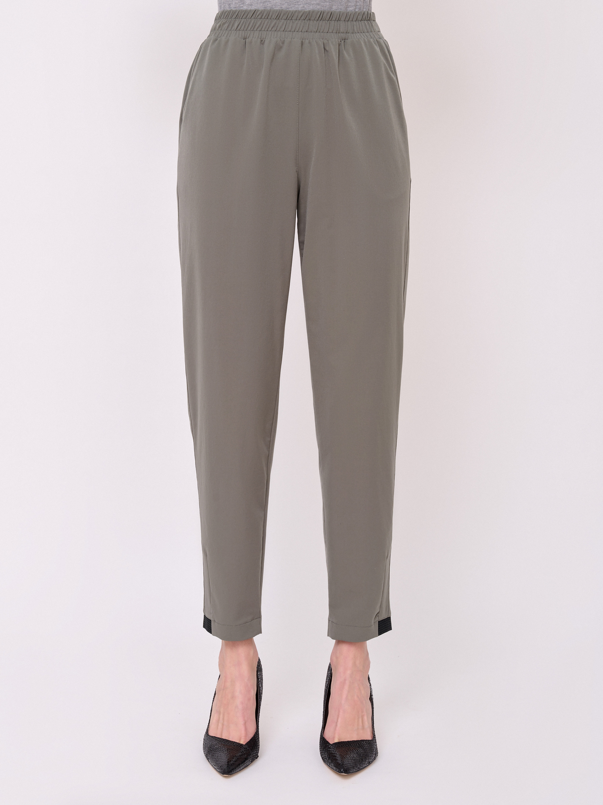 Застежка резинка, без рисунка, карманы косые, крой брючин зауженный, посадка средняя, эластичные вставки по низу брючин. Длина брючин: 72 см.