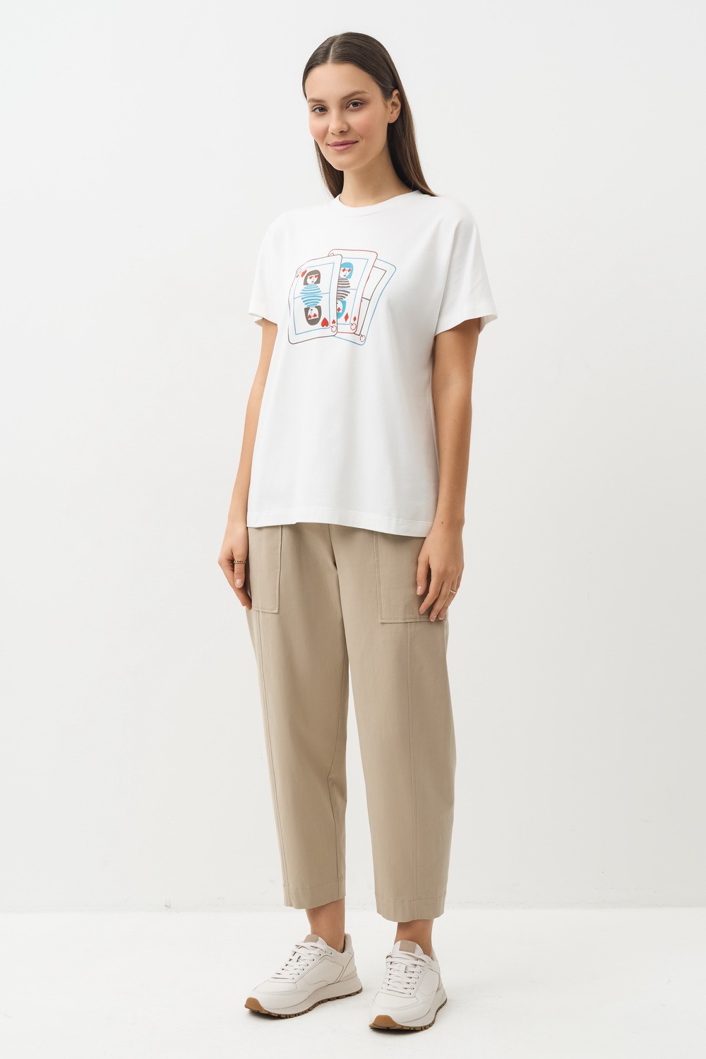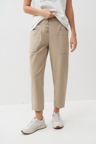 Брюки зауженные к низу, длиной 7/8. Застежка, гульфик, на четыре пуговицы и прорезные (под углом) петли. Боковой накладной карман. Правая задняя половинка брюк, в области пояса, декорирована термопринтом.