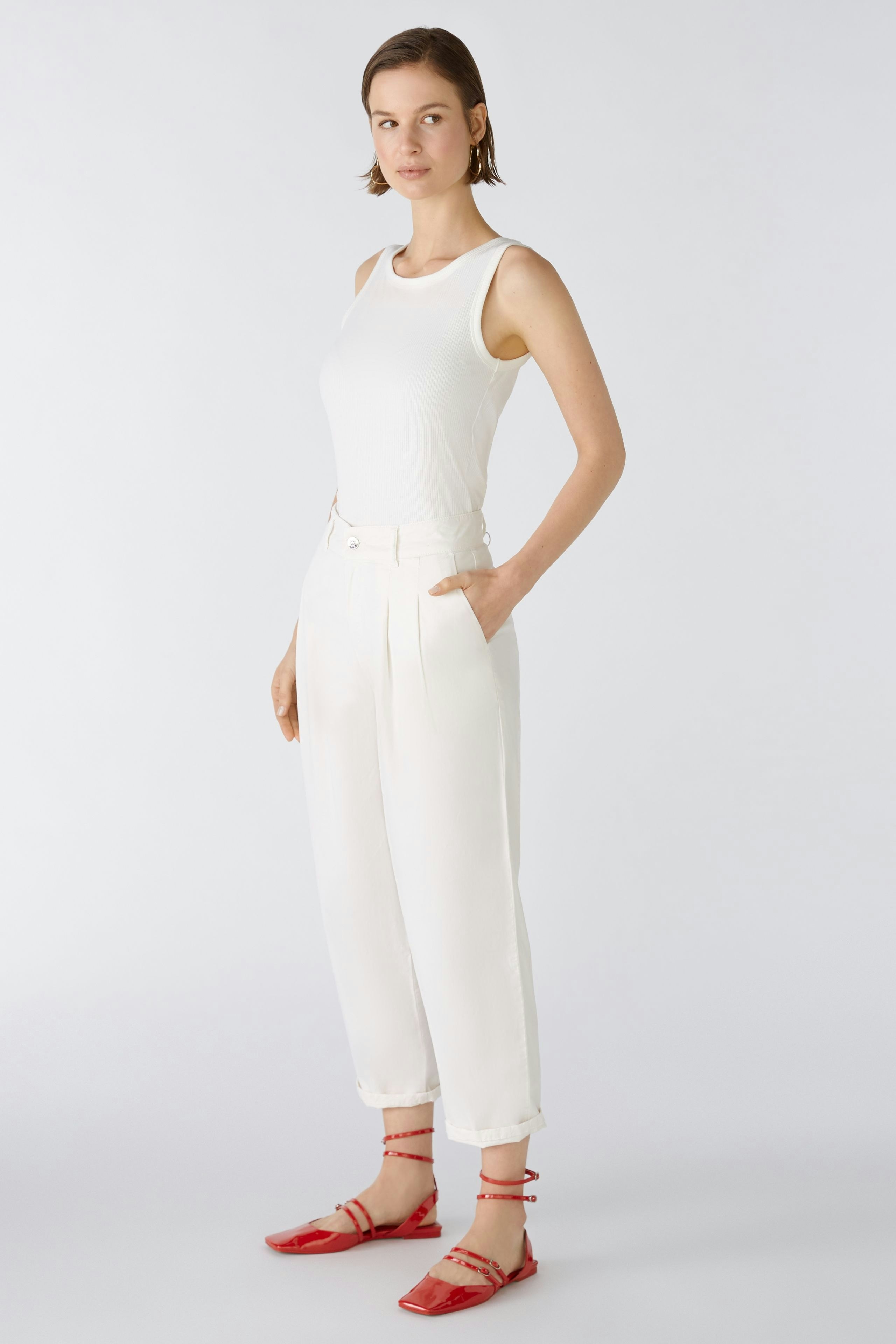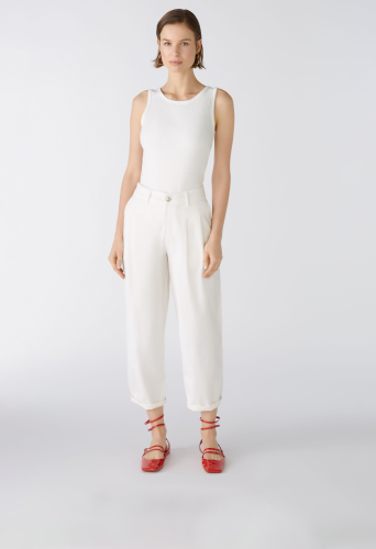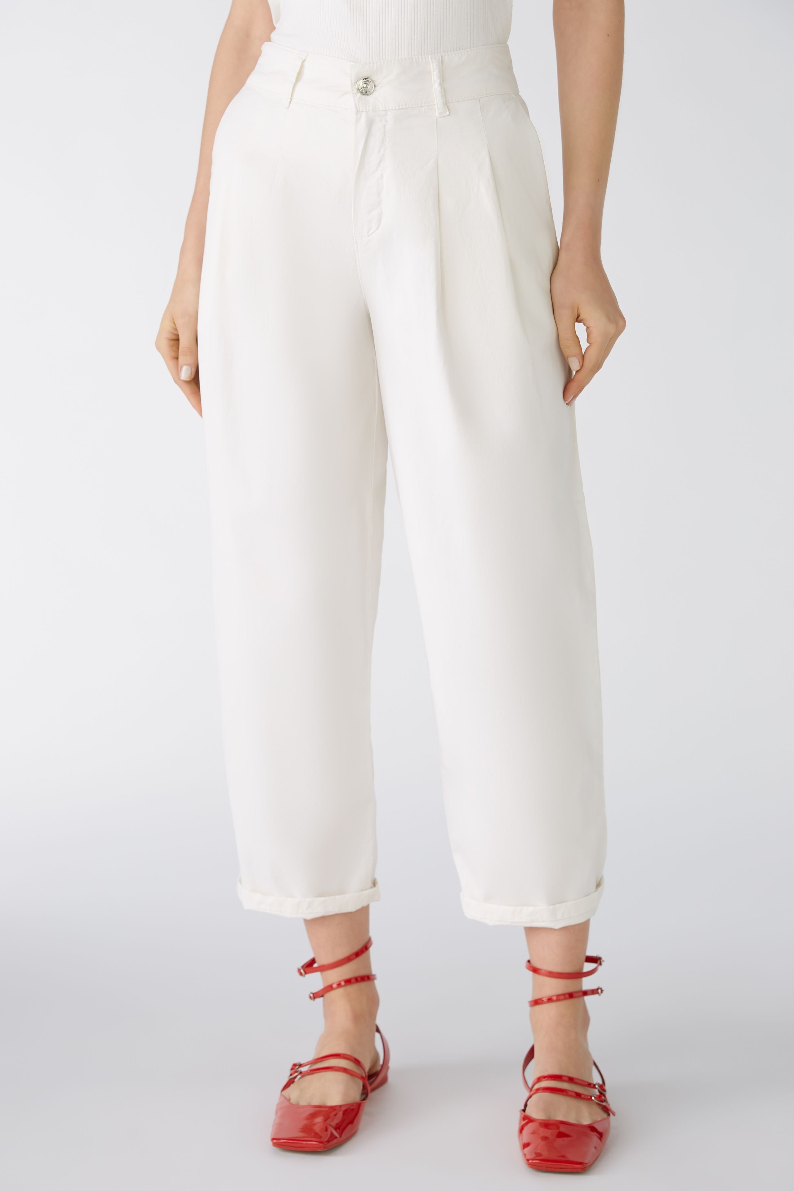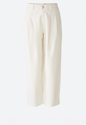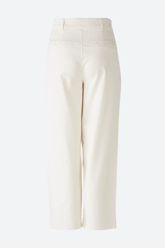 Повседневные брюки из смеси эластичных натуральных материалов - смесь хлопка-лиоцелла с эластаном. Талия средней высоты, штанины сужаются к низу, укороченная длина. С молнией и пуговицей с логотипом, петлями для ремня. Боковые карманы, ложные прорезные карманы сзади. Длина для размера 42: 68 см.