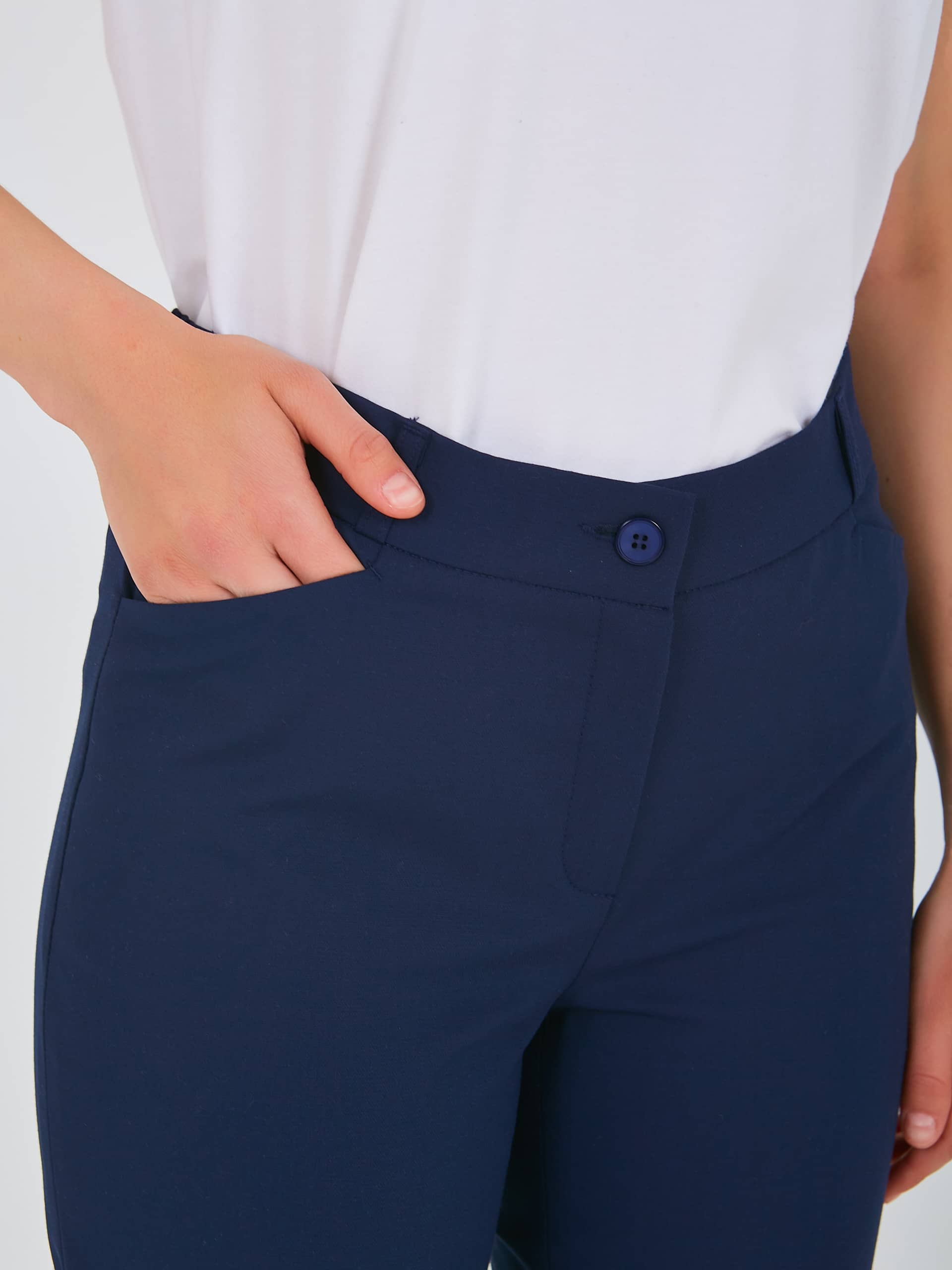 Прямые брюки с завышенной талией, длина 7/8, с застежкой на молнию и 1 пуговицу. Брюки слегка зауженные книзу. На передних половинках расположены два кармана с отрезным бочком. Вверх брюк обработан поясом на резинке со шлевками.