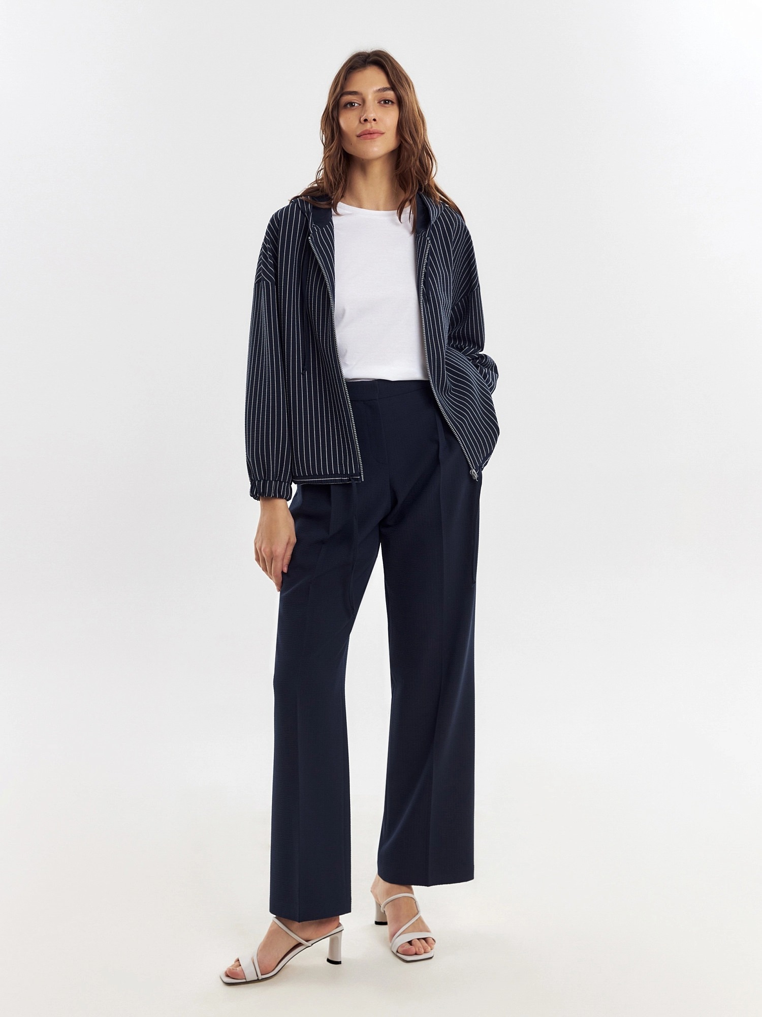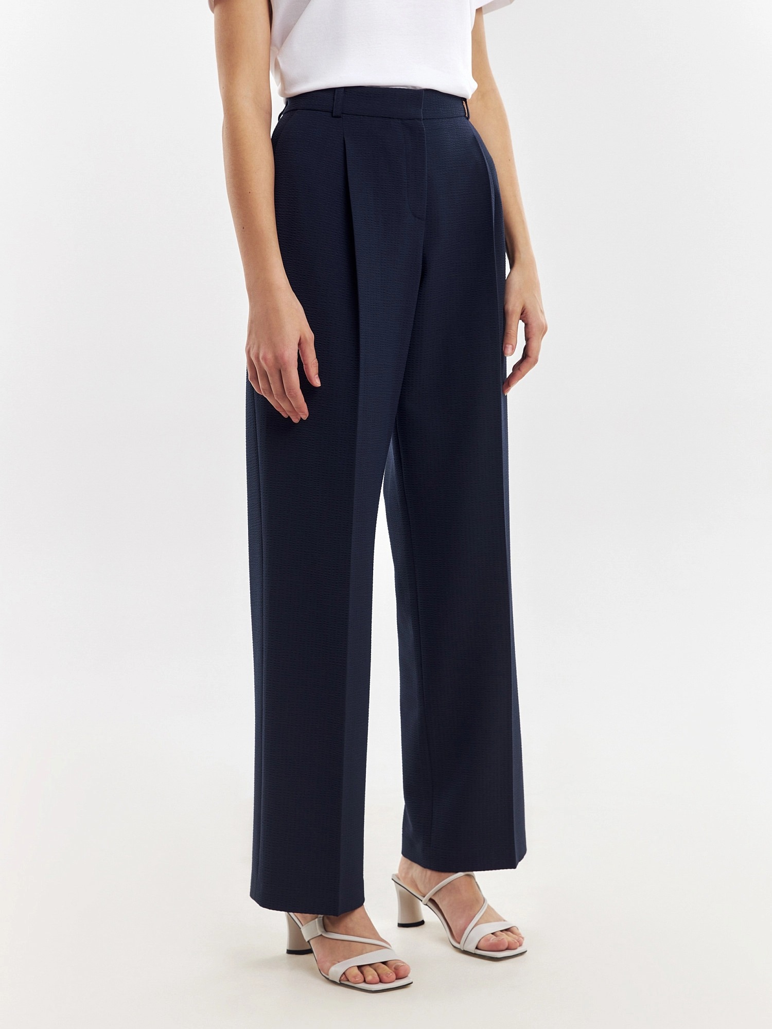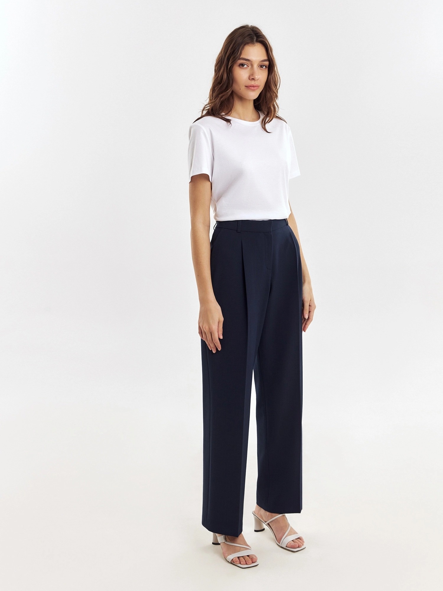 Стильные широкие брюки прямого силуэта из фактурной вискозной ткани темно-синего цвета, на притачном поясе с резинкой на спинке и шлевками. Застежка спереди на молнию, пуговицу и крючок. Карманы рабочие в боковых швах.