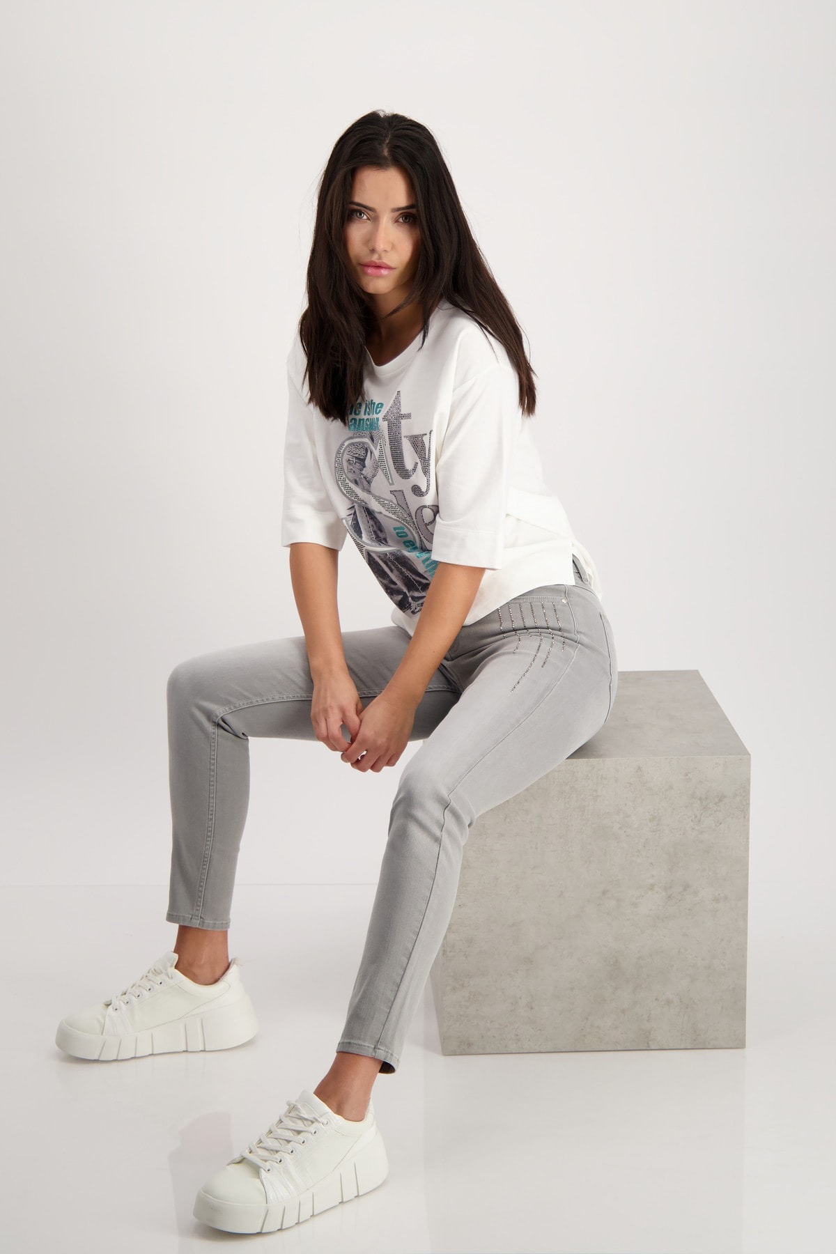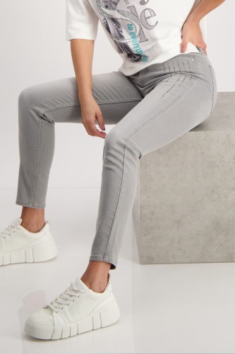 Элегантные джинсы с полосками со стразами. Эластичная смесь хлопка. Нормальная высота талии. 5-карманный стиль. Длина внутренней штанины для всех размеров 74 см.