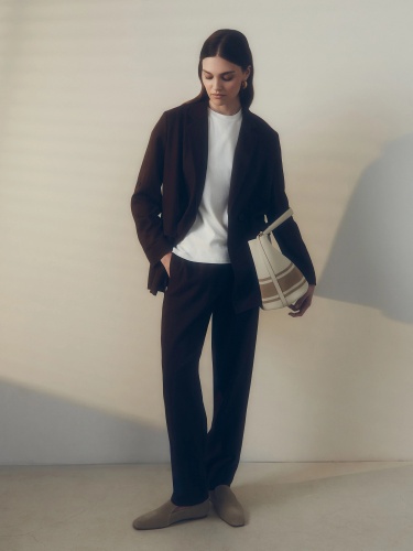 Прямые брюки из льняной ткани в благородном шоколадном цвете на притачном поясе с резинкой и имитацией гульфика. Рабочие карманы в боковых швах и один накладной карман на спинке. Модель идеально подходит для создания ансамбля с жакетом из аналогичной ткани.