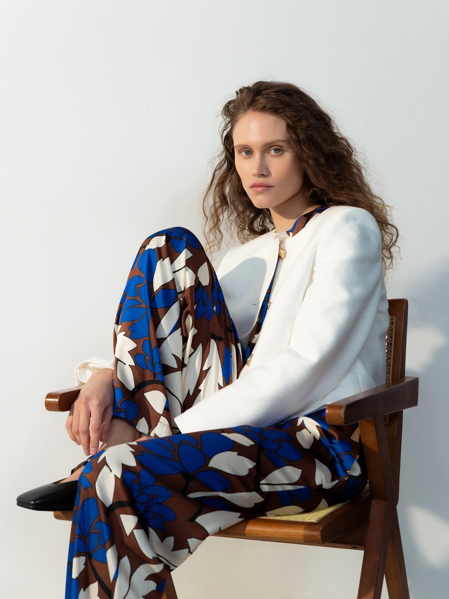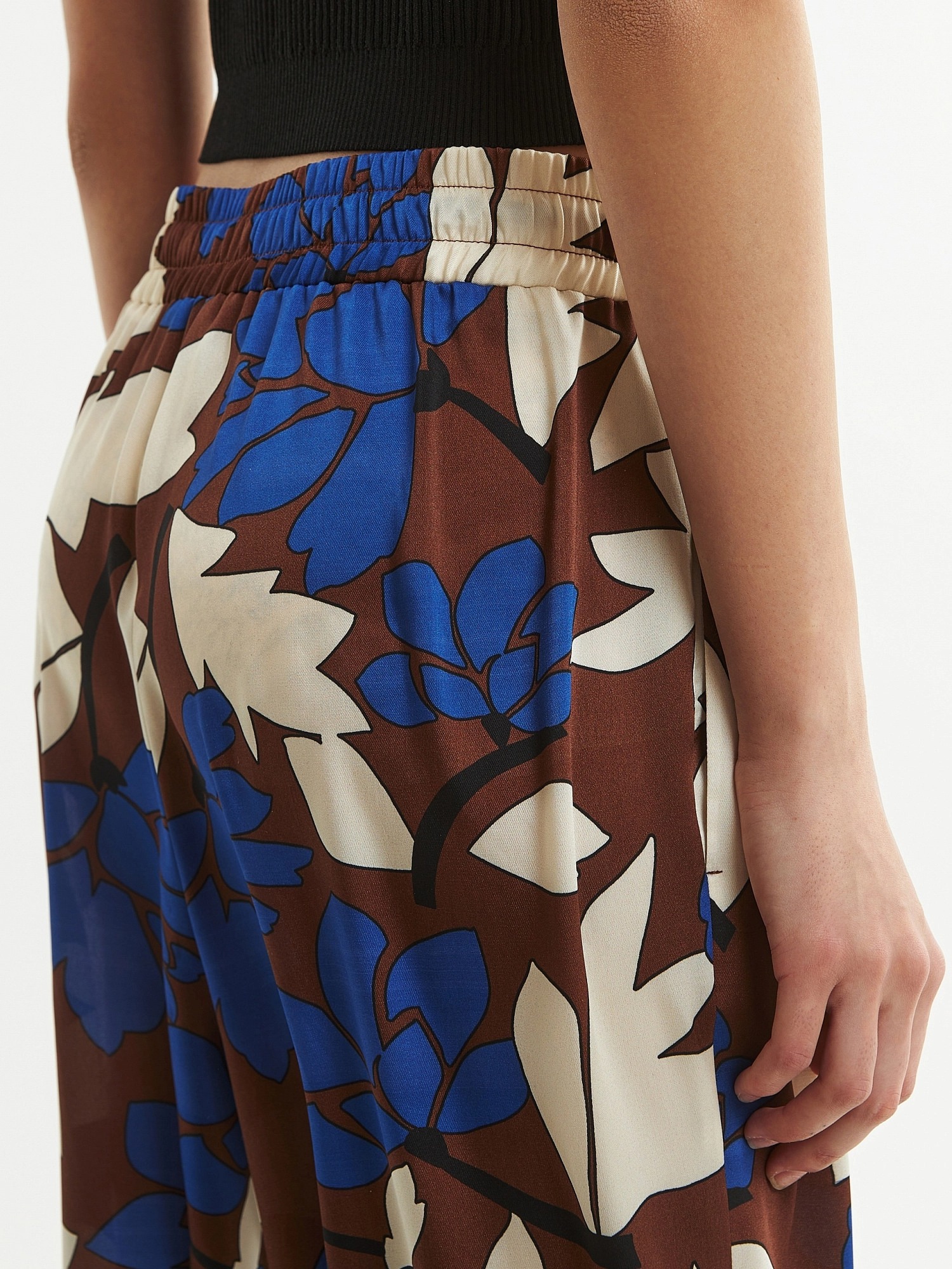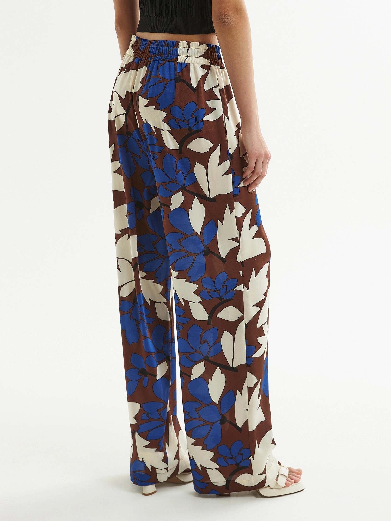 Брюки полной длины, из плательной ткани с крупным цветочным притом, свободной формы, на поясе. В пояс вставлена резинка и кулиcка для лучшей фиксации.
