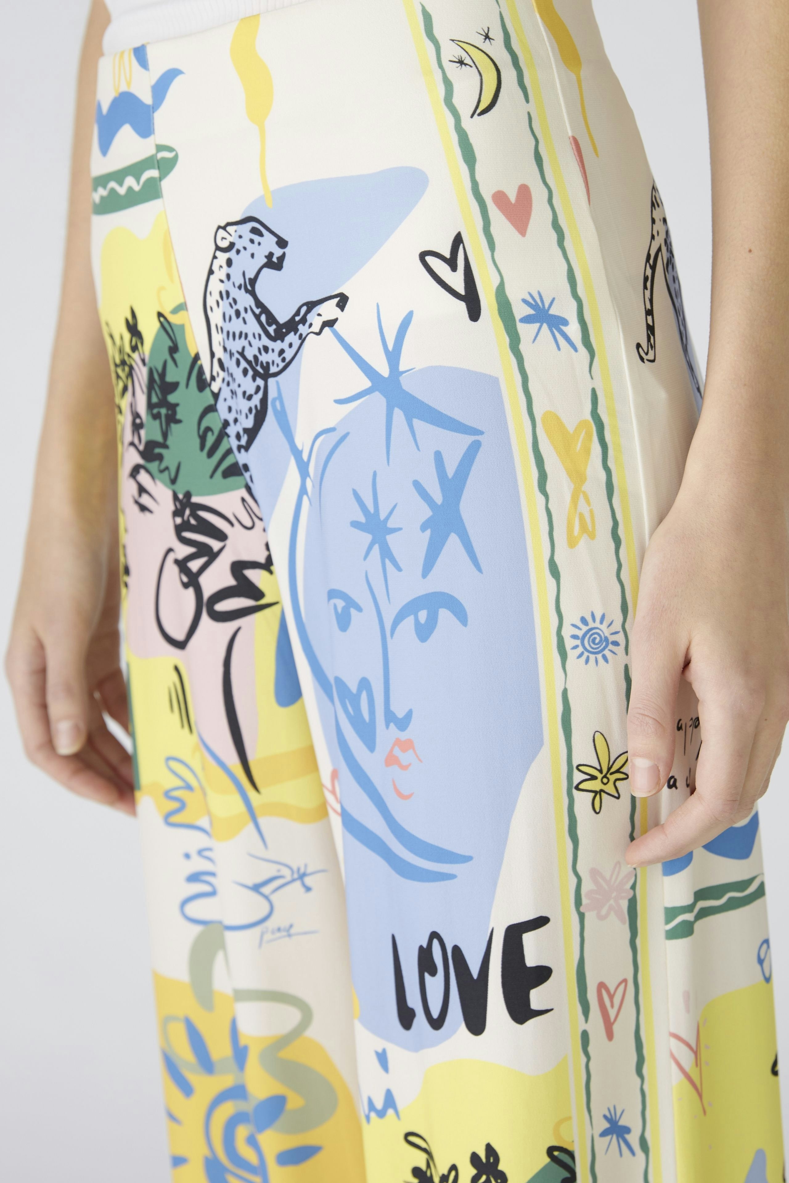 Высокоэластичный материал Silky Touch с принтом по всей поверхности и эластичными полосками по бокам. Повседневный крой с длинными штанинами. Максимальный комфорт благодаря скрытому эластичному поясу. Очень удобный, без застежек, легко надевается. Брюки не мнутся, не требуют глажки. Длина для размера 42: 78 см.