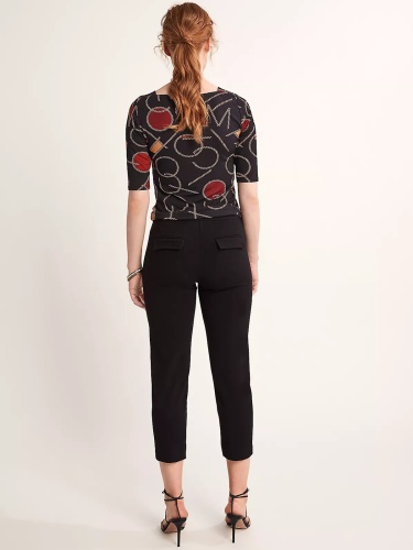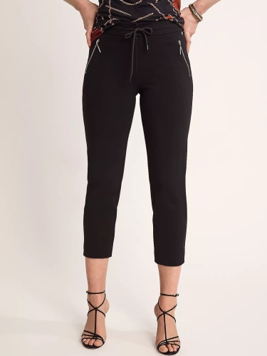 Укороченные однотонные брюки силуэта slim. Комфортная высокая посадка, притачной пояс с кулиской, застежка на скрытую молнию. Боковые косые карманы на молнии.