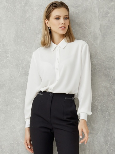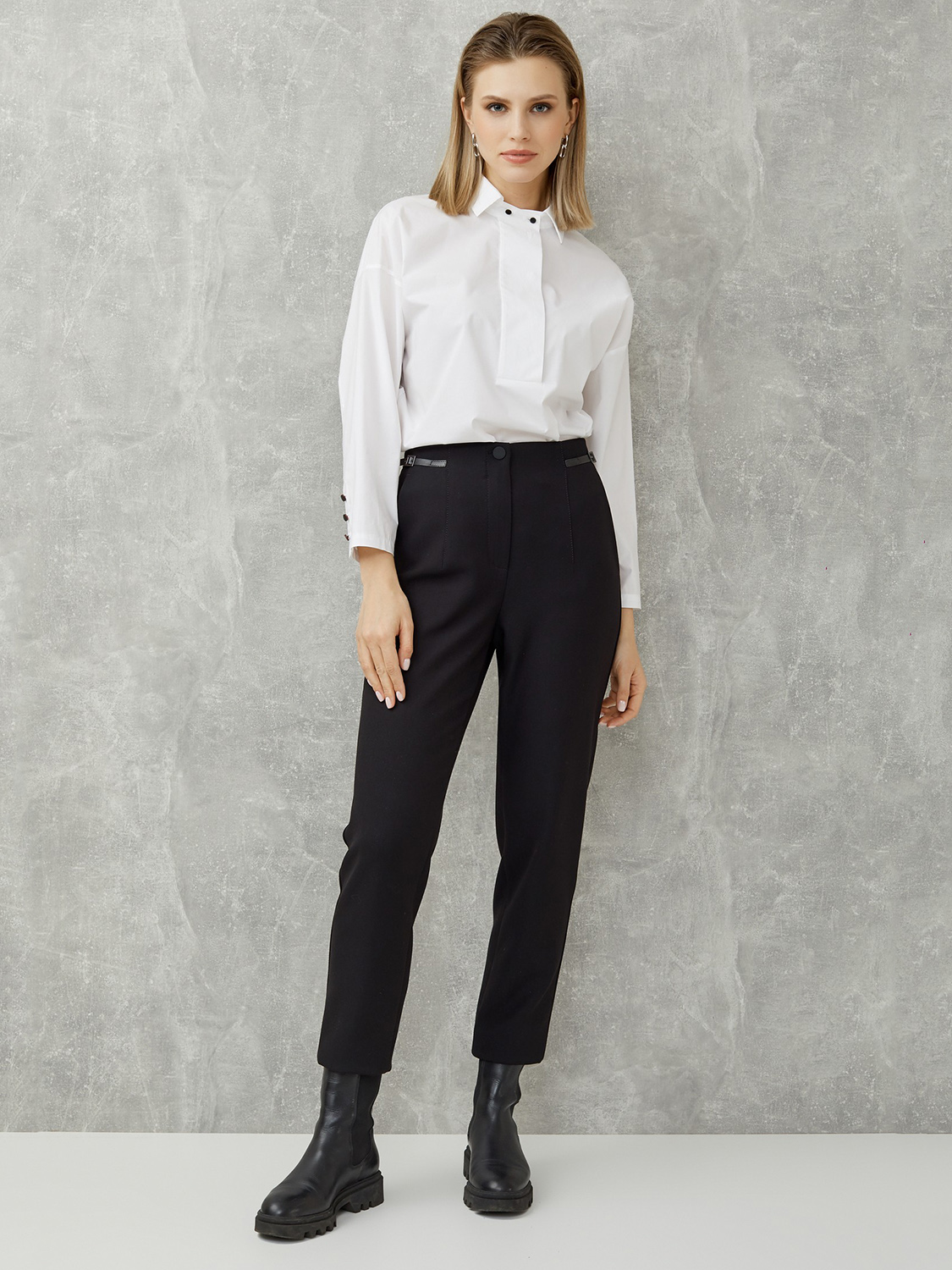 Укороченные однотонные брюки с высокой посадкой. Вариант низа для делового образа. Притачной пояс украшают ремешки из экокожи. Застежка на пуговицу и скрытую молнию.