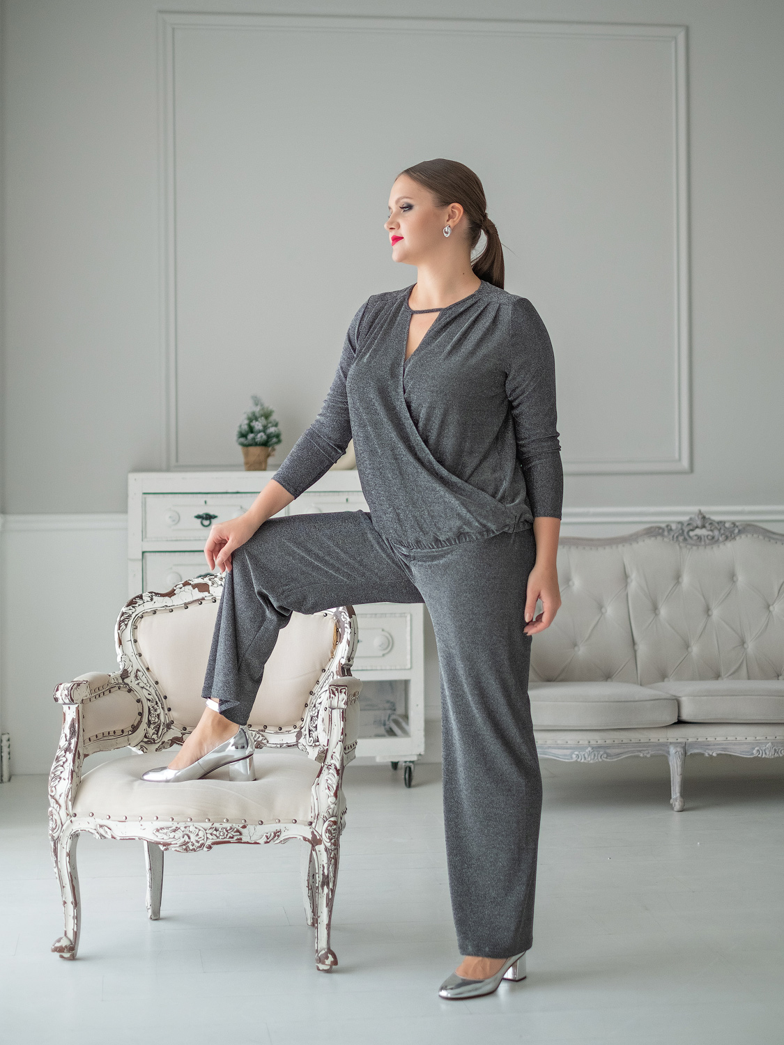 Стильные брюки свободного кроя с нитью люрекса в составе можно сочетать с джемпером из того же материала для создания сияющего образа на любом торжественном мероприятии!