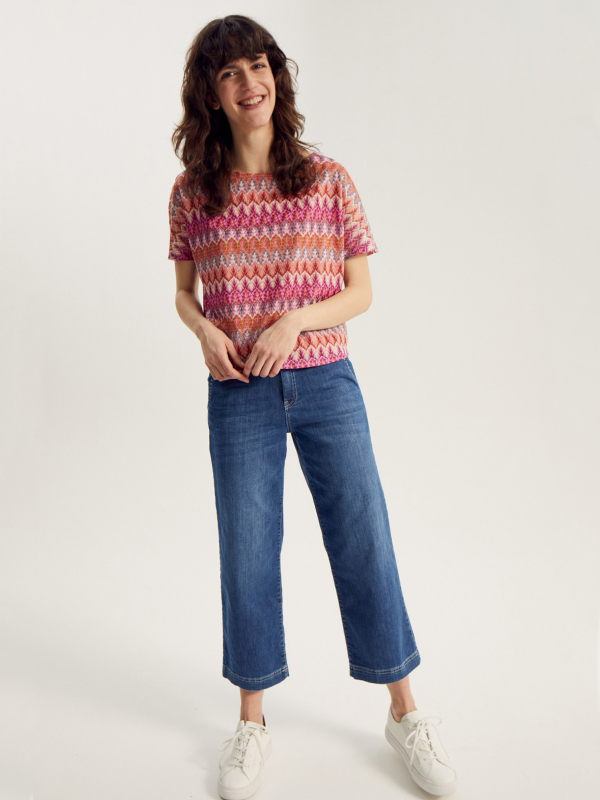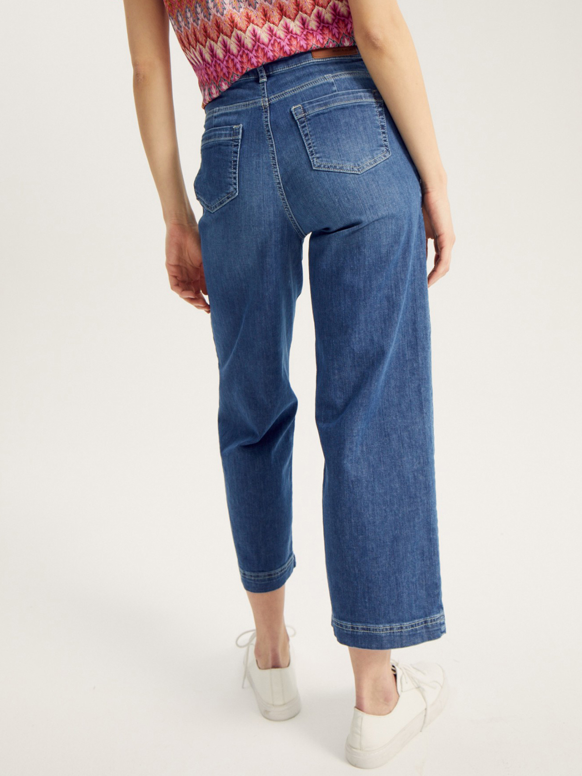 Расклешенные кюлоты несомненный тренд этого сезона! Кюлоты украшены декоративными потертостями и складками, а также декоративной строчкой по низу штанин. Застежка на скрытую молнию и пуговицу. Притачной пояс со шлевками для фиксации ремня.