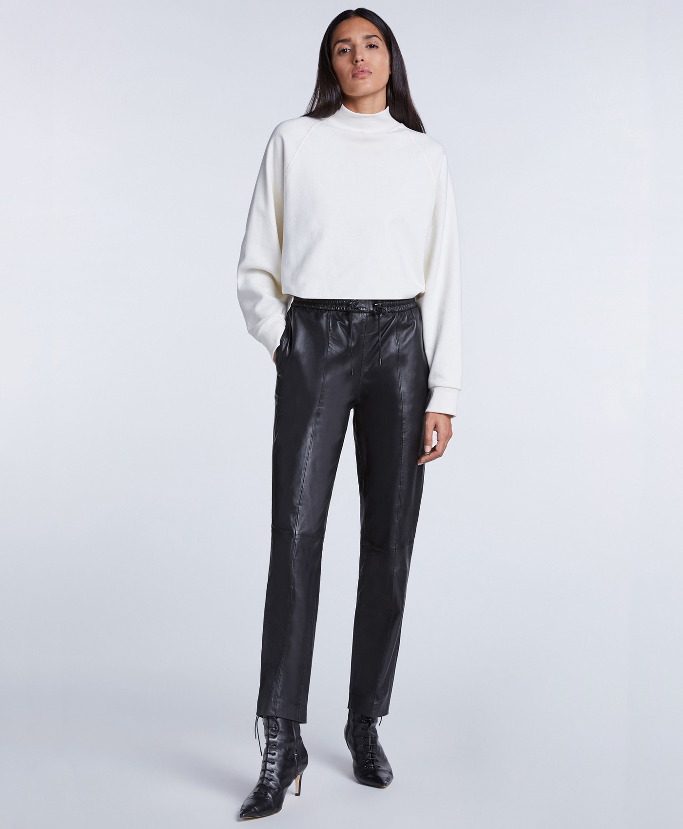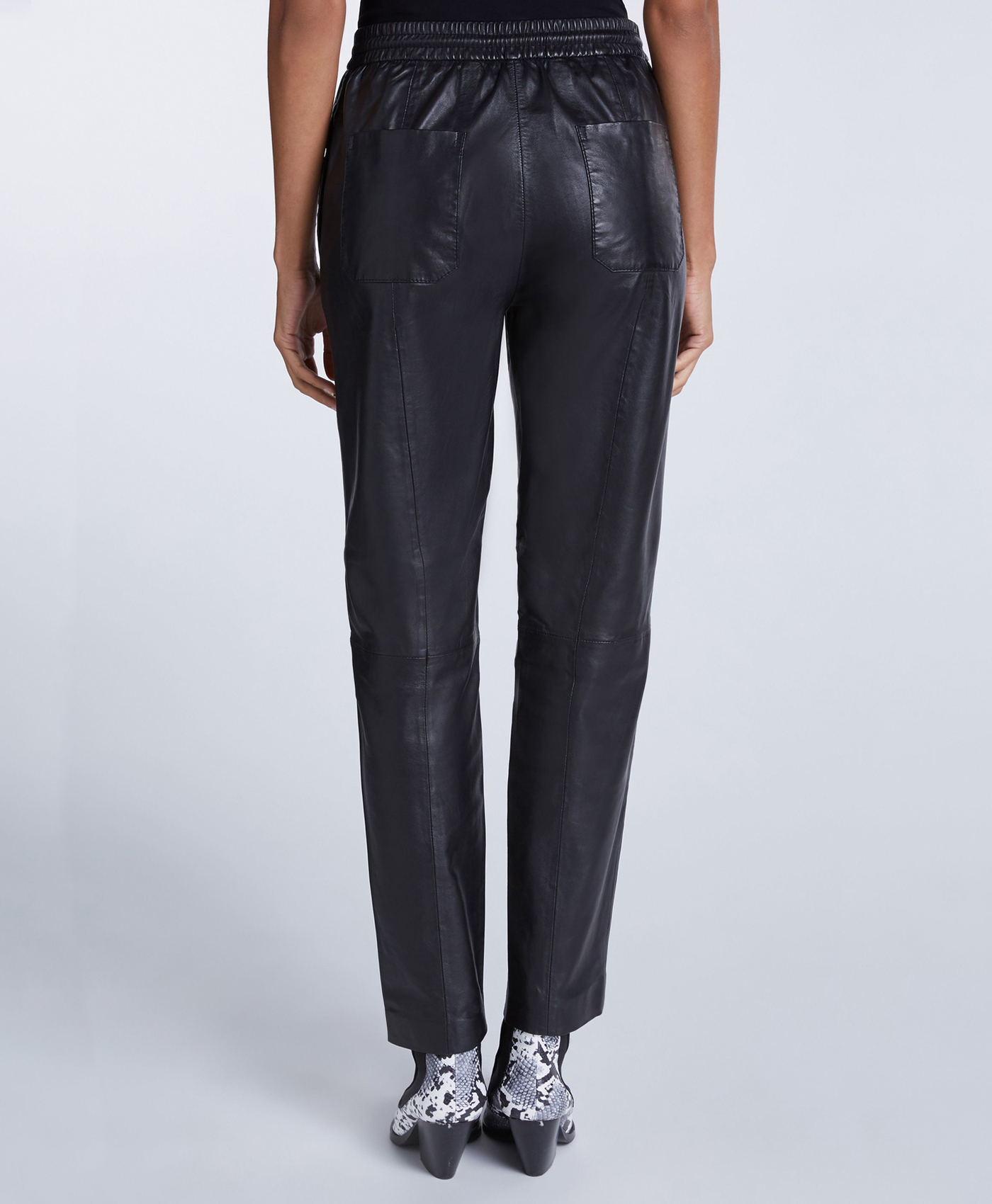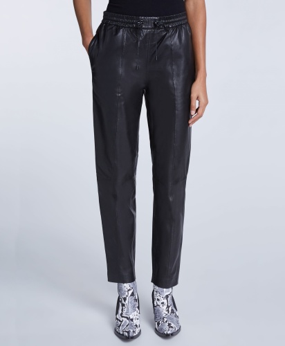 Укороченные брюки из экокожи в спортивном стиле. Эластичный пояс с кулиской обеспечивает комфортную посадку. Прорезные боковые карманы и накладные задние карманы. Шов спереди на штанинах.