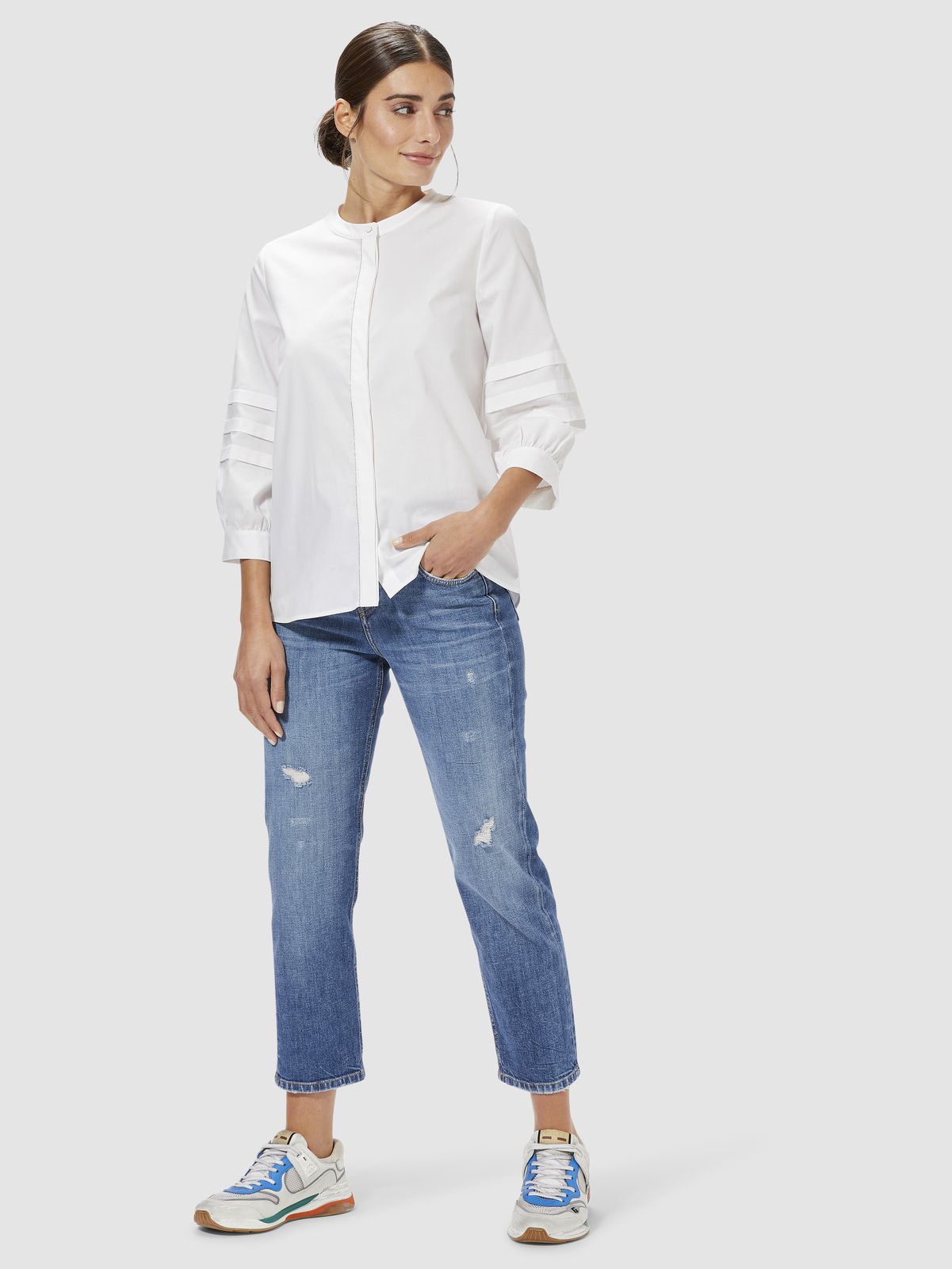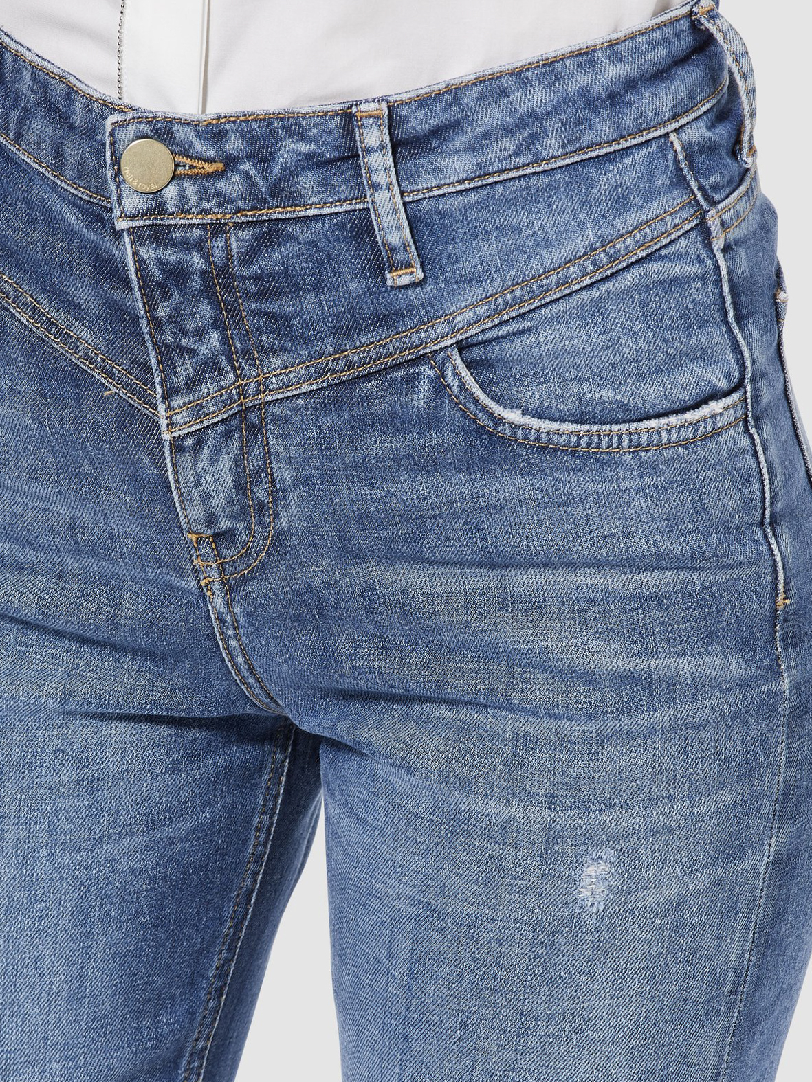 Укороченные джинсы с декоротивными потертостями. Комфортная средняя посадка, пояс со шлевками. Внутренние передние и задние накладные карманы.