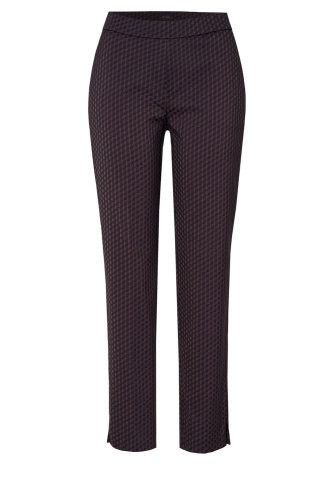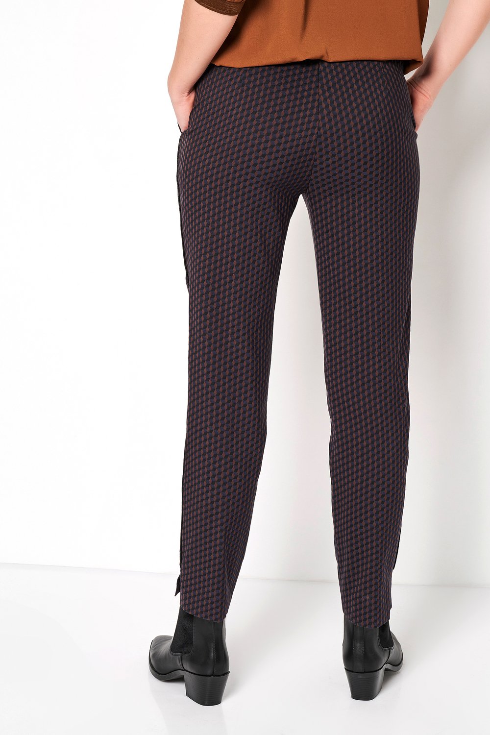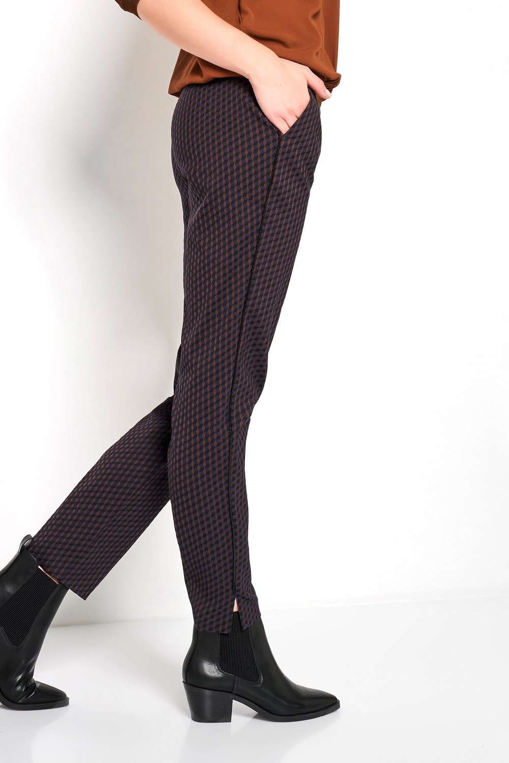 Брюки с геометрическим принтом освежают любой образ! Удобная средняя посадка, карманы спереди, небольшие разрезы по низу. Элегантный блеск материала оттеняется отделкой тесьмой по боковому шву. Приятный к телу материал из хлопковой смеси обеспечивает комфорт.