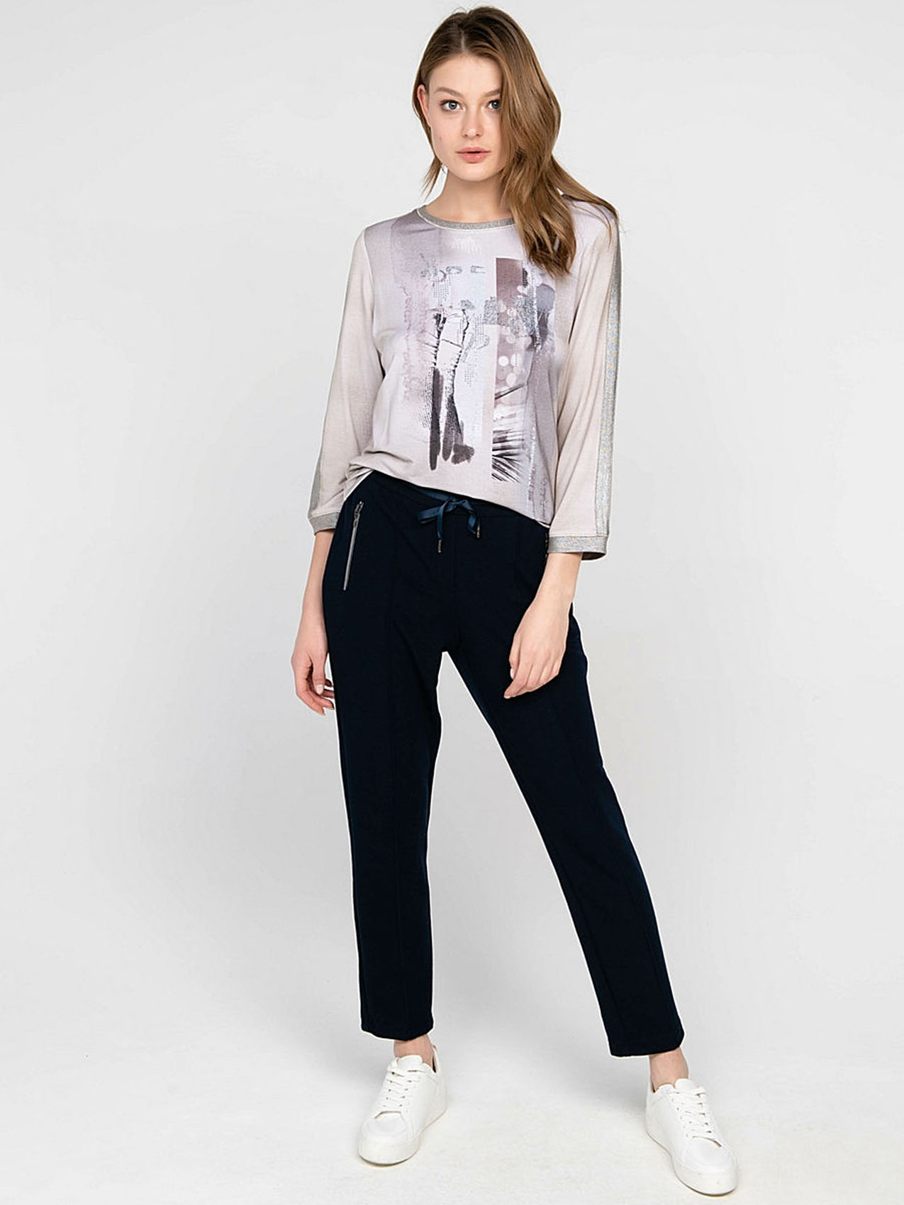 Темно-синие прямые брюки с продольной строчкой задают серьезный тон. Элегантная деталь - атласная лента на поясе. Материал из смеси полиэстера, вискозы и эластана приятен к телу и легок в уходе. Брюки отлично сочетаются с блузками и футболками, а с кроссовками у вас получится современный демократичный образ.