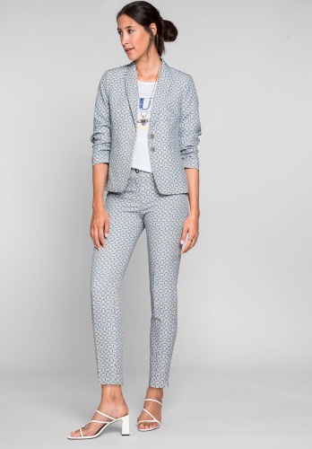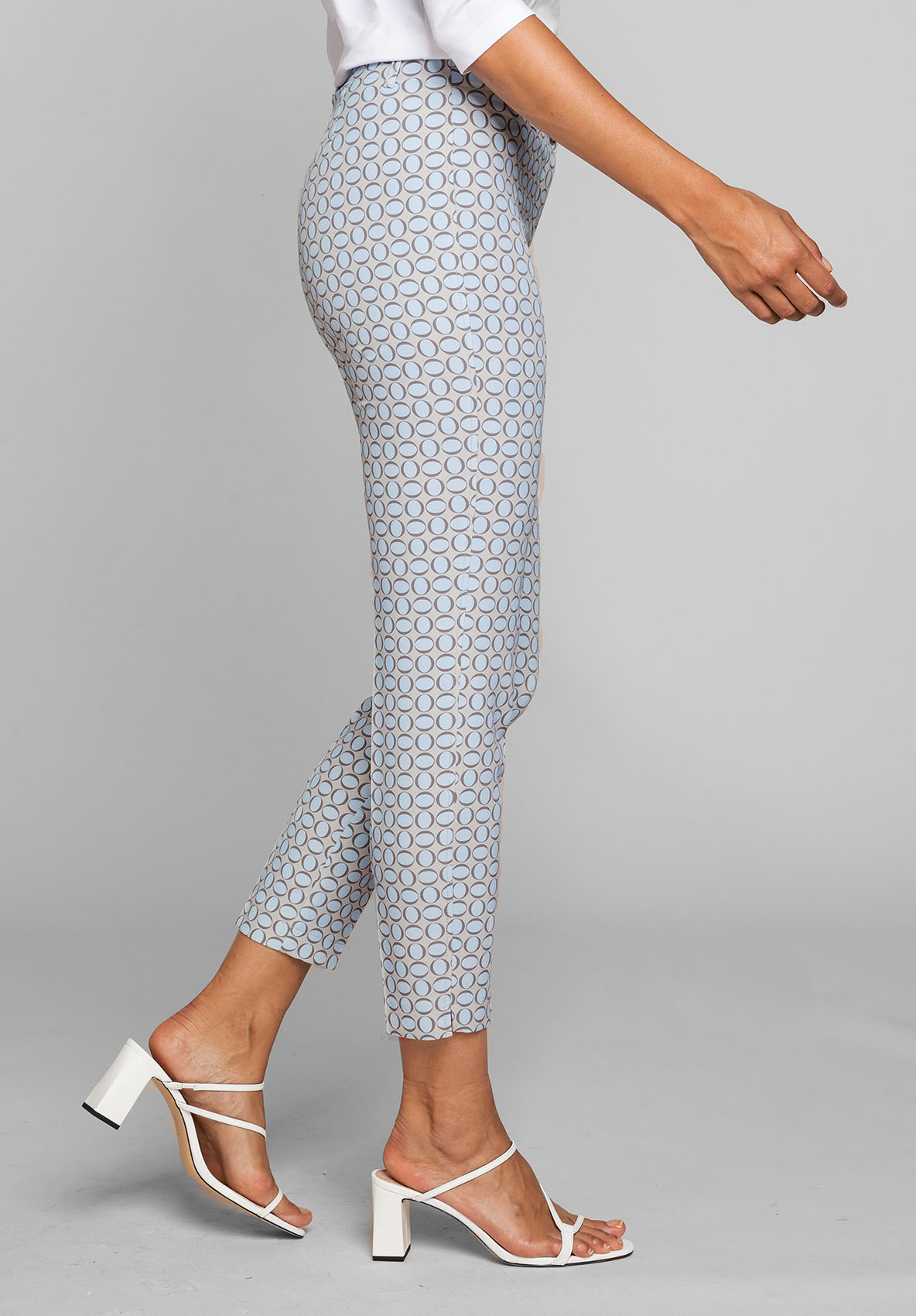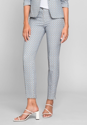 Эластичные брюки Siena с трендовым геометрическим принтом являются изюминкой коллекции марки Bianca. Эластичный материал повторяет движения тела и очень удобен в носке. Данная модель брюк имеет силуэт slim, среднюю посадку, длину 7/8 и пояс со шлевками. Брюки станут идеальной парой как для стильного образа. • брюки с голубым принтом в полоску • высококачественный материал • застежка-молния, небольшие разрезы по бокам • средняя посадка, силуэт slim • длина около 68 см, 7/8