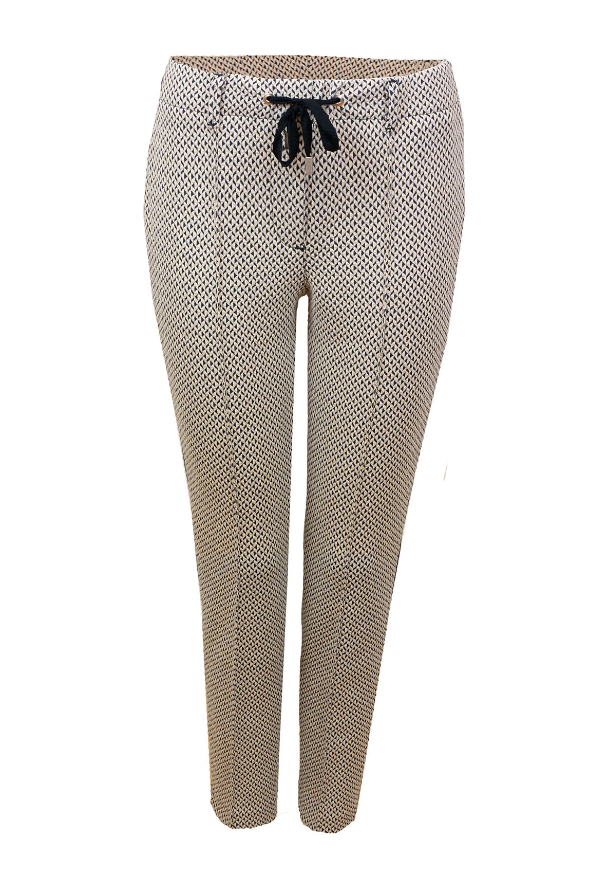 Бежевые джеггинсы Denver с геометрическим узором являются абсолютным законодателем моды. Благодаря высокому проценту эластичных материалов в составе и широкому поясу с декоративной лентой трикотажные брюки очень удобны и являются отличным выбором на каждый день. В сочетании с легкой толстовкой или футболкой брюки создают завершенный образ в стиле кэжуал. • трикотажные жаккардовые брюки с тонкими полосками по бокам • смесь хлопка, вискозы и эластана • широкий пояс с декоративной лентой • укороченные брюки 7/8, рост модели - 180 см • длина около 72 см