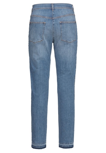 Данная модель джинсов создает оптимальную посадку благодаря прилеганию по линии ног. Модные потертости, полосы по бокам в спортивном стиле. Открытый нижний срез с бахромой придает брюкам демократичный вид. Неважно, спортивный или шикарный образ вы создаете, эти джинсы станут вашей модной изюминкой сезона. • джинсы с эффектом потертости и бахромой по низу • эластичная хлопковая джинсовая ткань • 5 карманов • яркие полосы по бокам • силуэт slim, средняя посадка • длина около 74 см