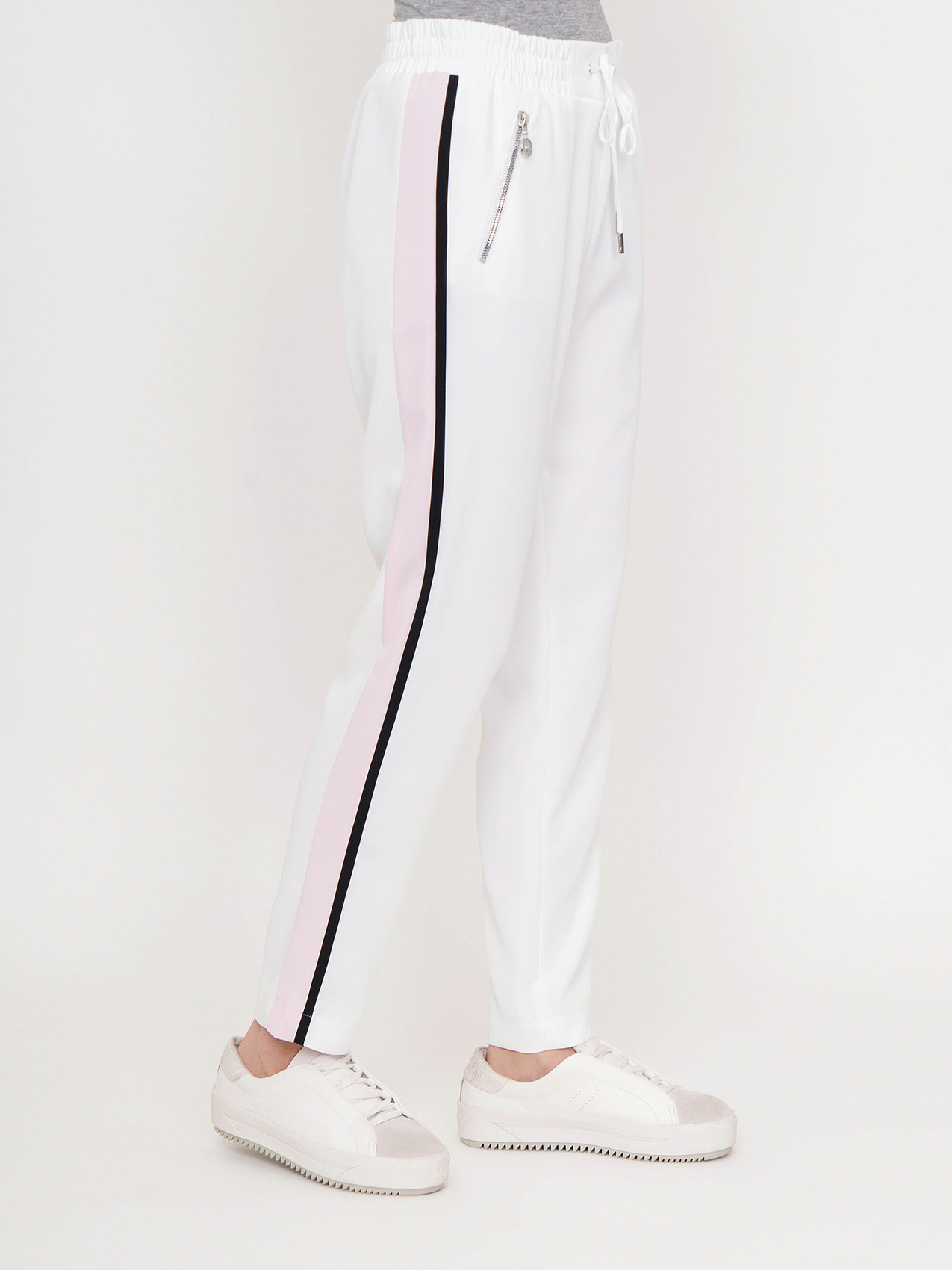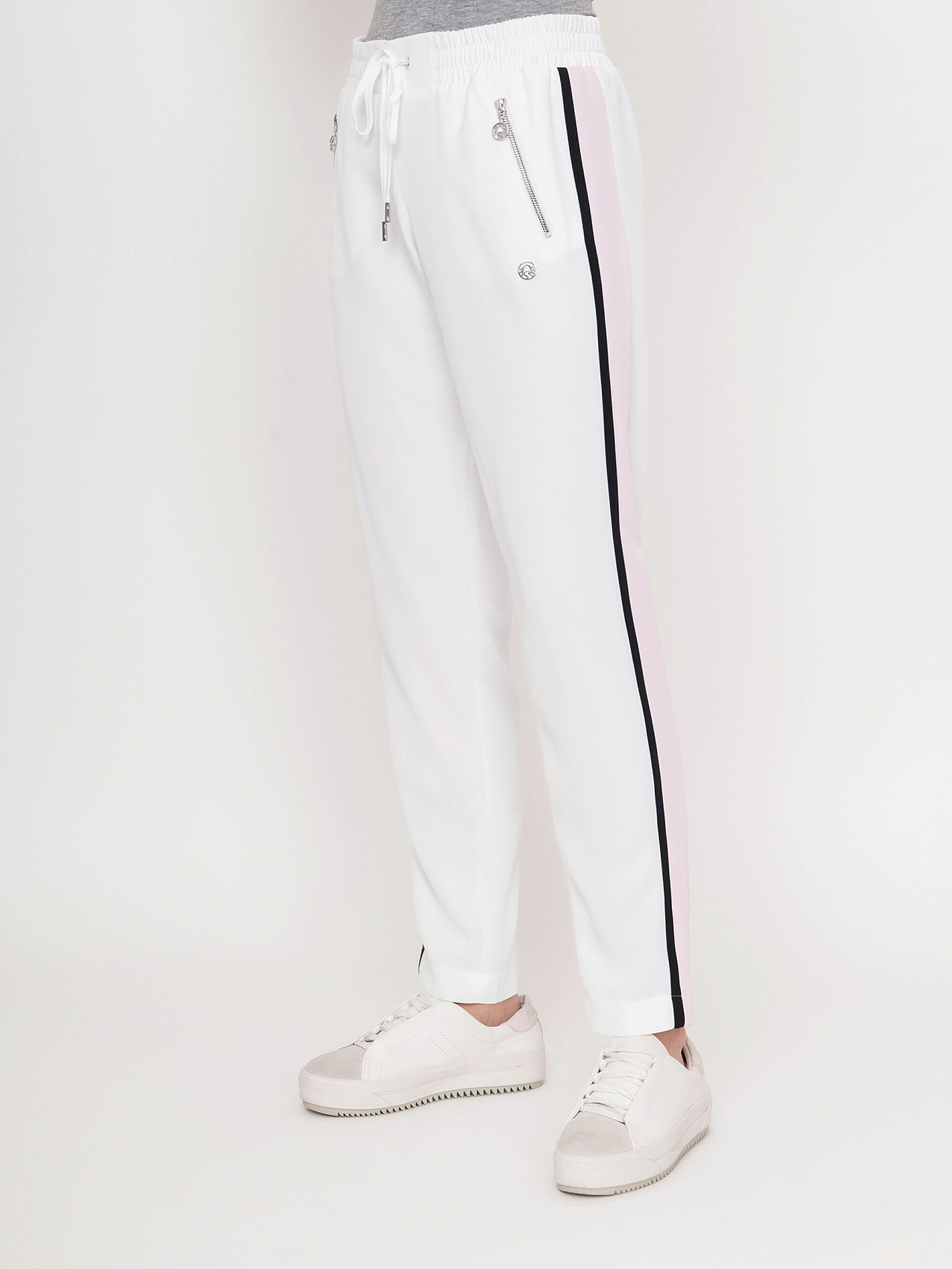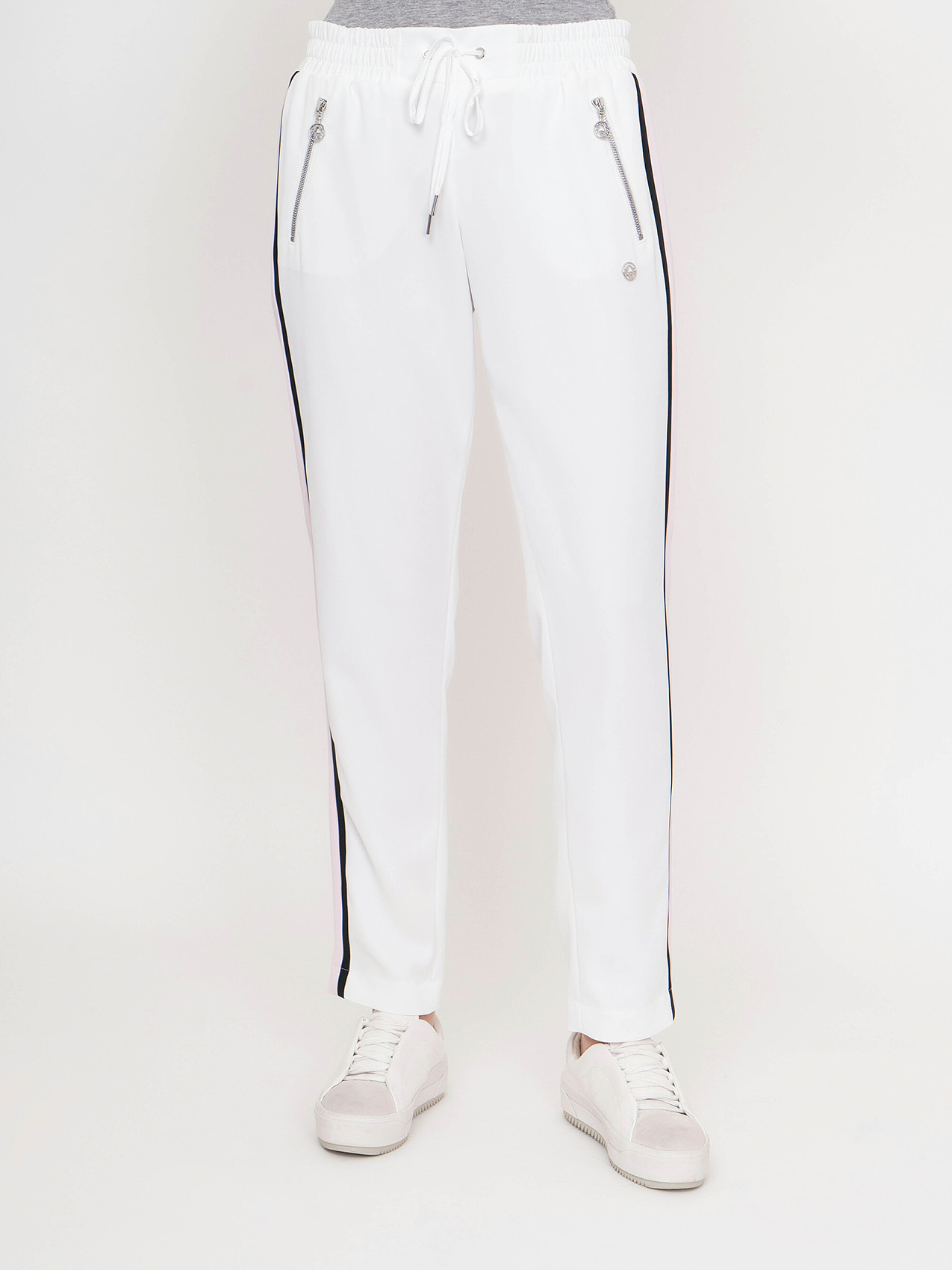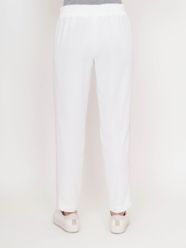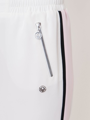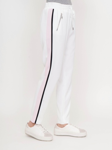 Стильные спортивные брюки. Прямой крой, средняя посадка, эластичная лента с кулиской на поясе, прорезные карманы на молниях, контрастные лампасы по бокам. Эта модель - отличный выбор для прогулок и занятий спортом.