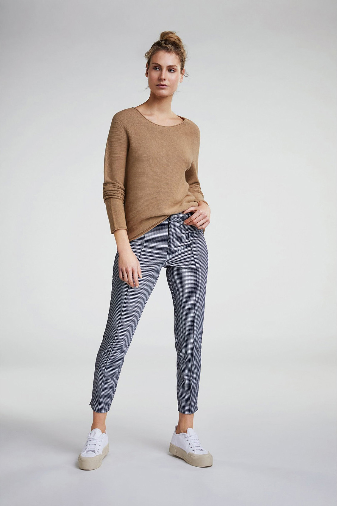 Прямые брюки средней посадки - совсем не скучная модель! Укороченная длина брюк позволяет продемонстрировать модную обувь. Стрелки делают образ более строгим. Классический клетчатый орнамент "гусиная лапка" является одним из современных трендов. В сочетании с лаконичным верхом эти брюки станут модным акцентом в вашем образе.