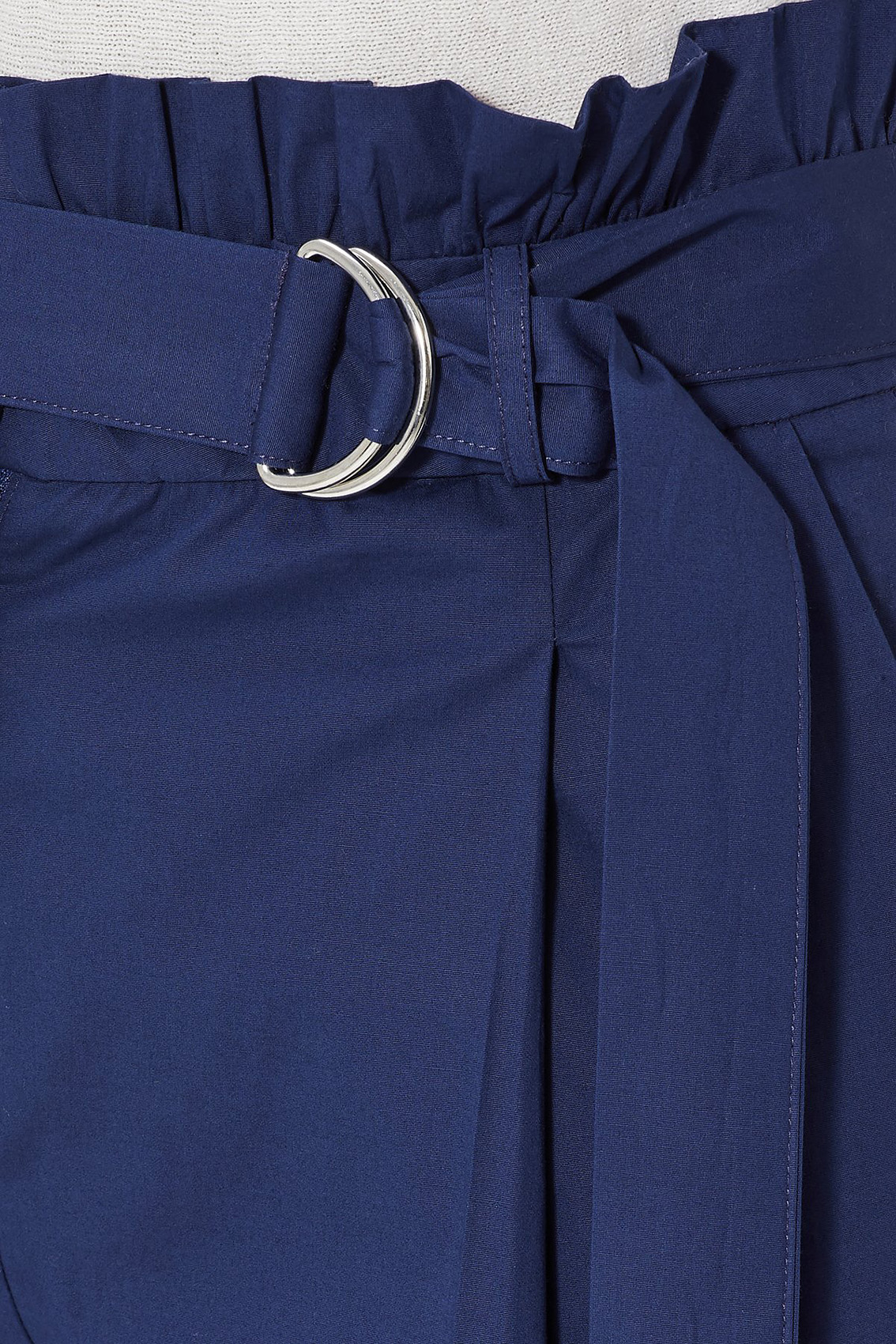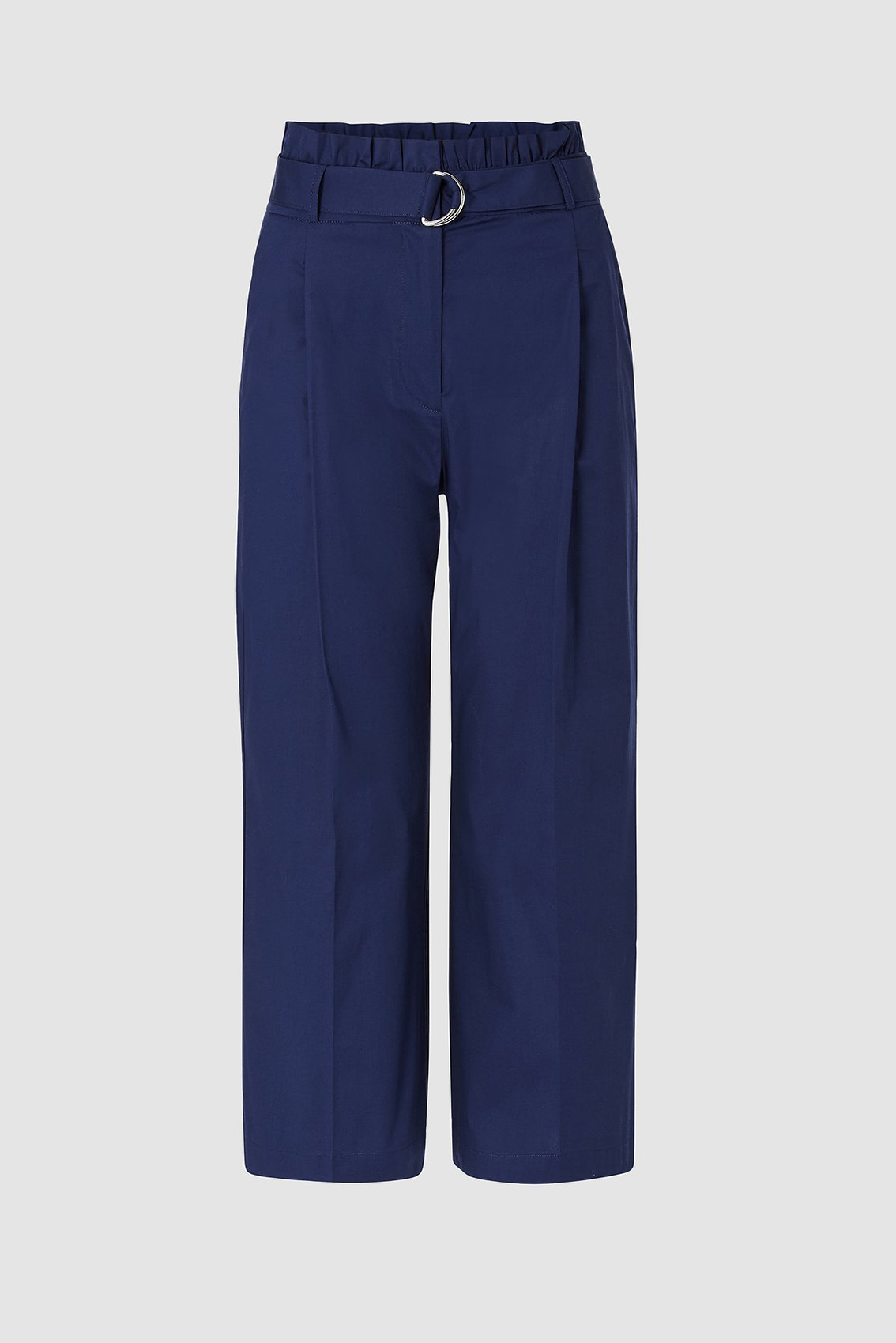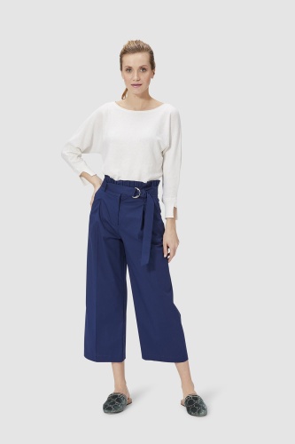 Кюлоты из легкого хлопкового поплина подчеркивают женственный силуэт. Их укороченная длина и отделка на поясе делает образ стильным и современным. Высокая талия, защипы, два боковых и два прорезных кармана. С белыми кроссовками и футболкой создается безупречный наряд на каждый день.
