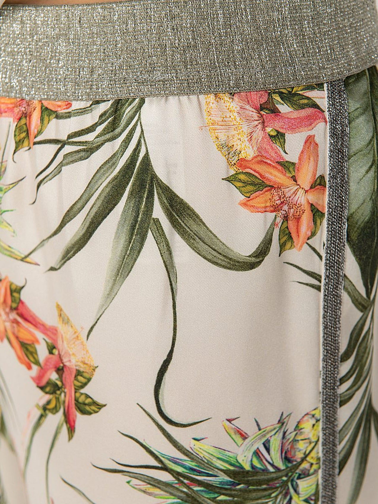 Широкие прямые брюки с трендовым тропическим принтом. Модный свободный силуэт. Эластичная лента на поясе. Без карманов. Декоративная лента по бокам. Приятный к телу материал из смеси хлопка и эластана.