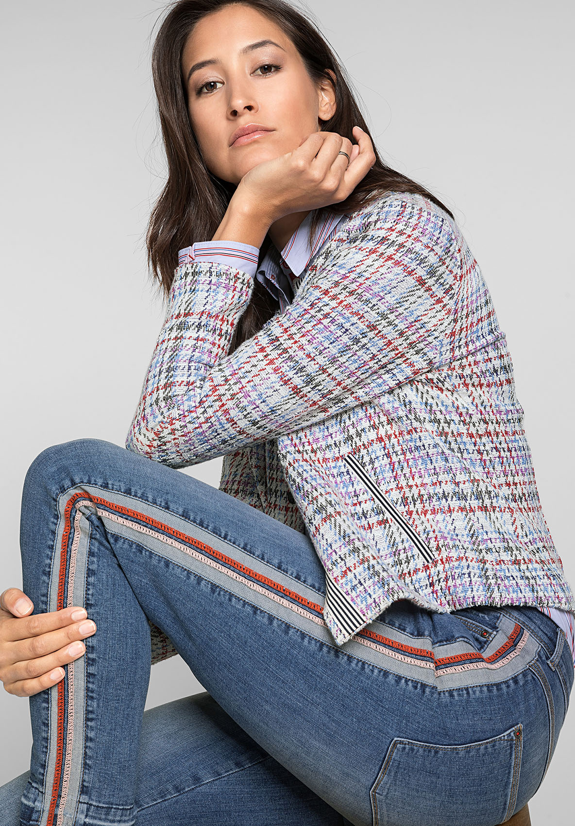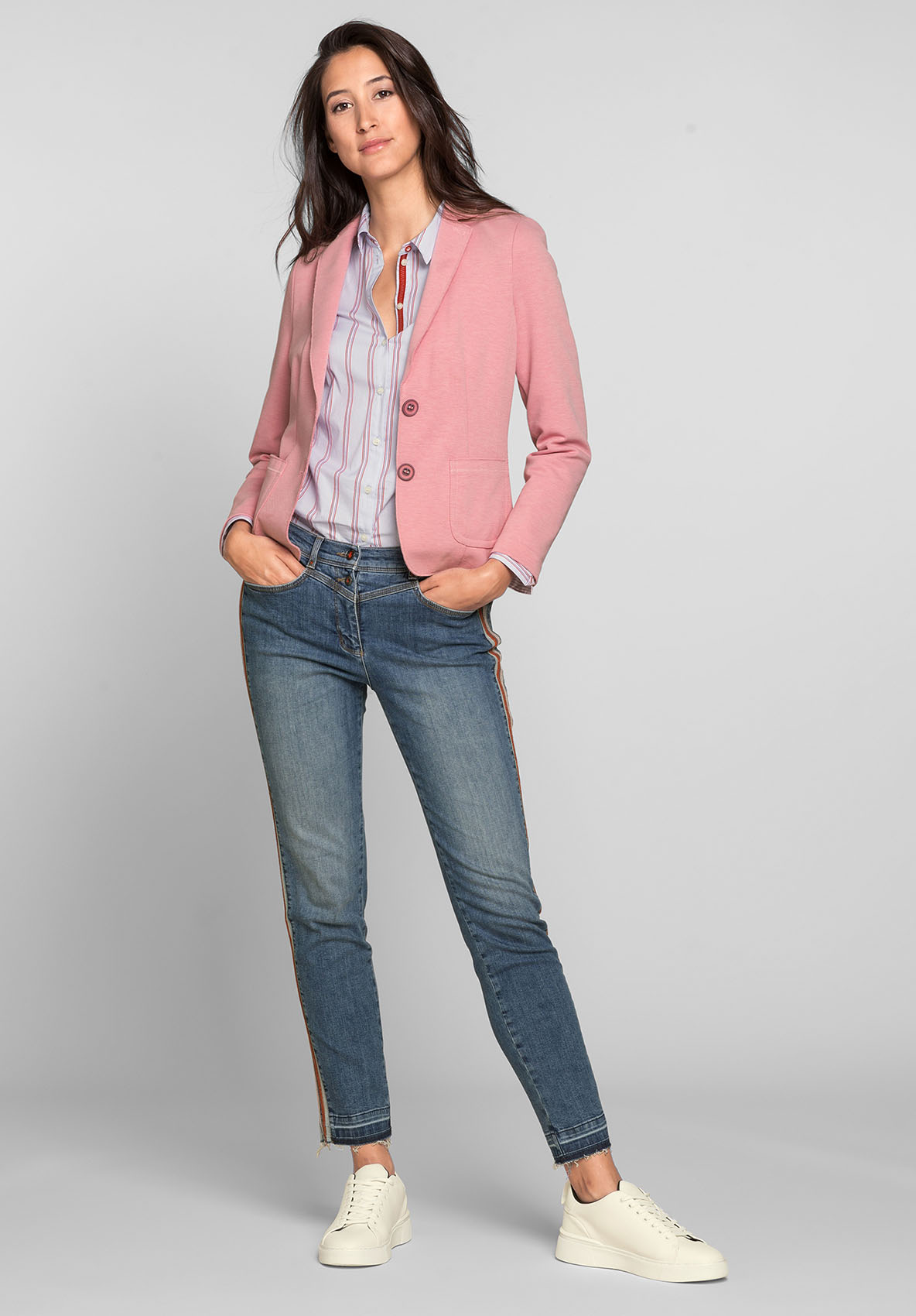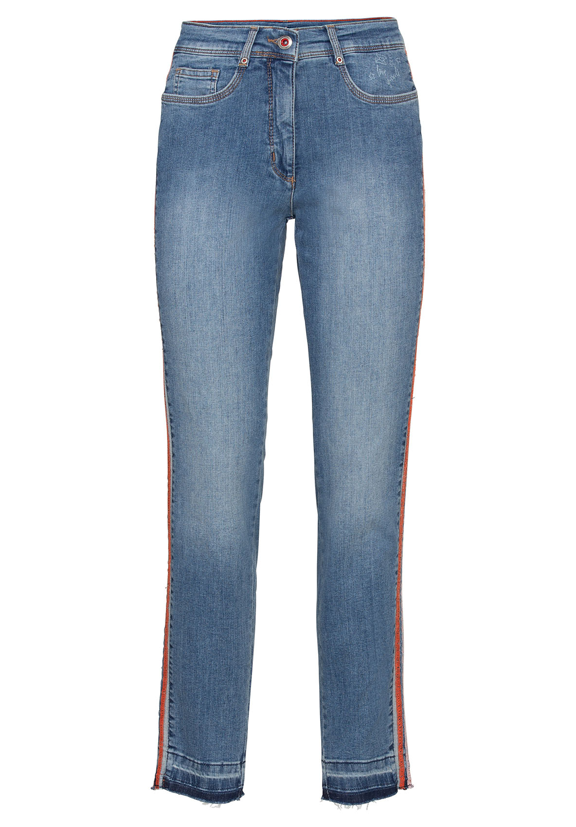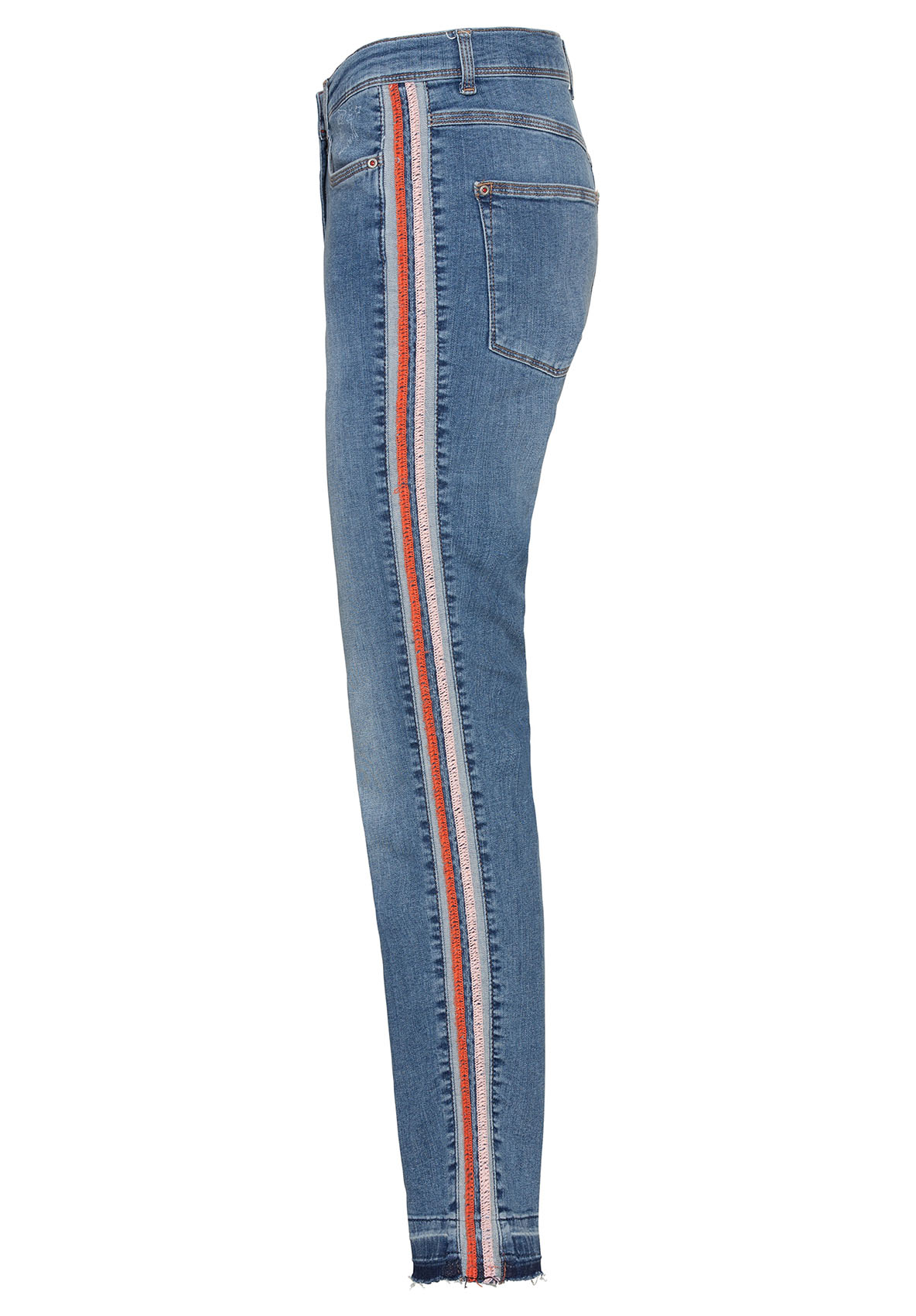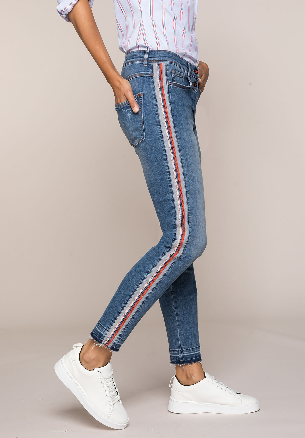 Джинсы Shape благодаря прилегающему силуэту подчеркивают линию ног. Модные потертости, полосы по бокам в спортивном стиле и открытый нижний срез с бахромой придают брюкам демократичный вид. Неважно, спортивный или шикарный образ вы создаете, эти джинсы станут вашей модной изюминкой сезона. • джинсы с эффектом потертости и бахромой по низу • эластичная хлопковая джинсовая ткань • 5 карманов • яркие полосы по бокам • силуэт slim, средняя посадка • длина около 74 см