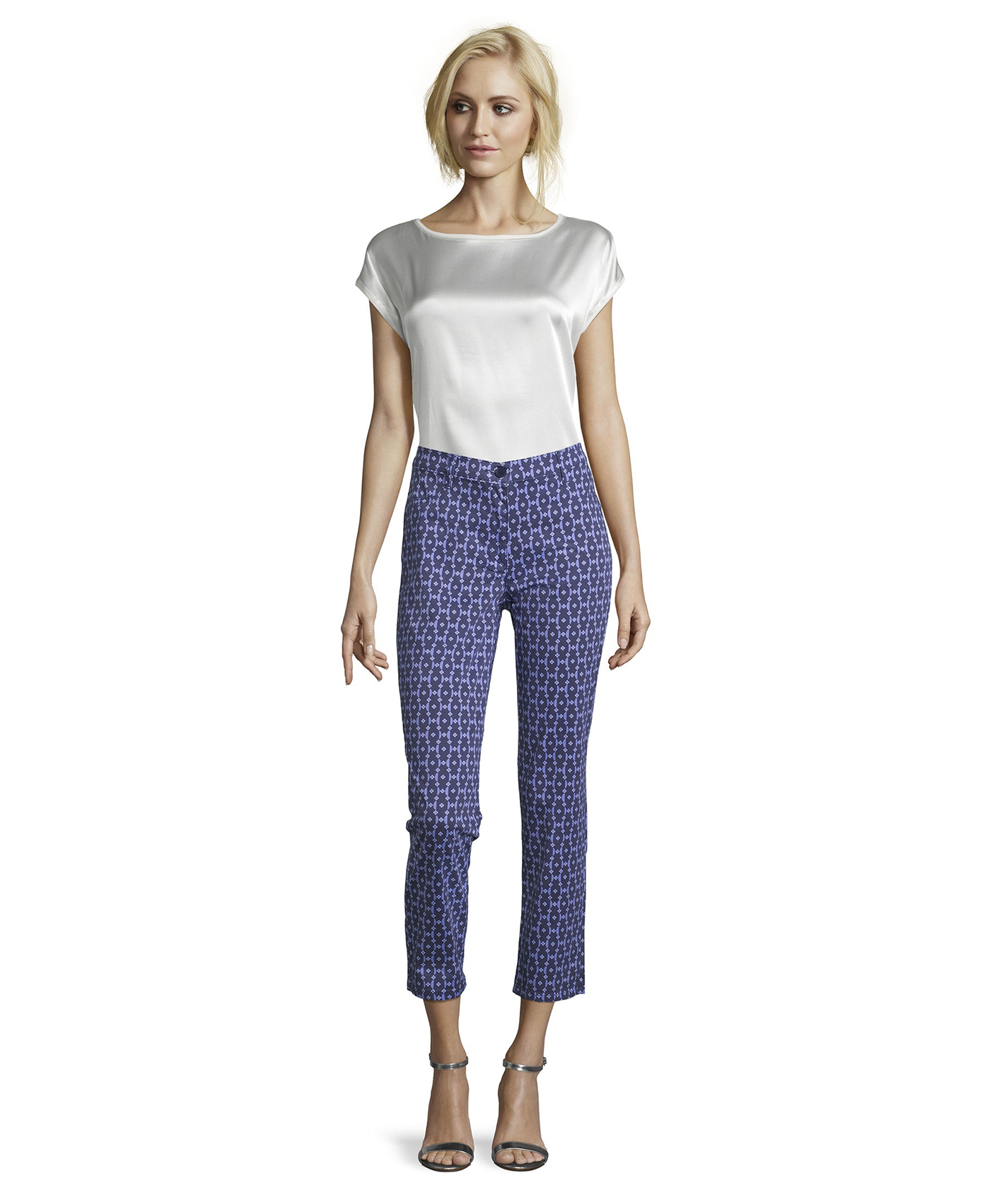 Графические принты в тренде! Брюки прямого кроя, средней посадки. Укороченная длина позволяет подчеркнуть модную обувь. Материал из хлопковой смеси приятен к телу и обеспечивает комфорт. Эти брюки великолепно смотрятся с любым лаконичным вариантом верха.