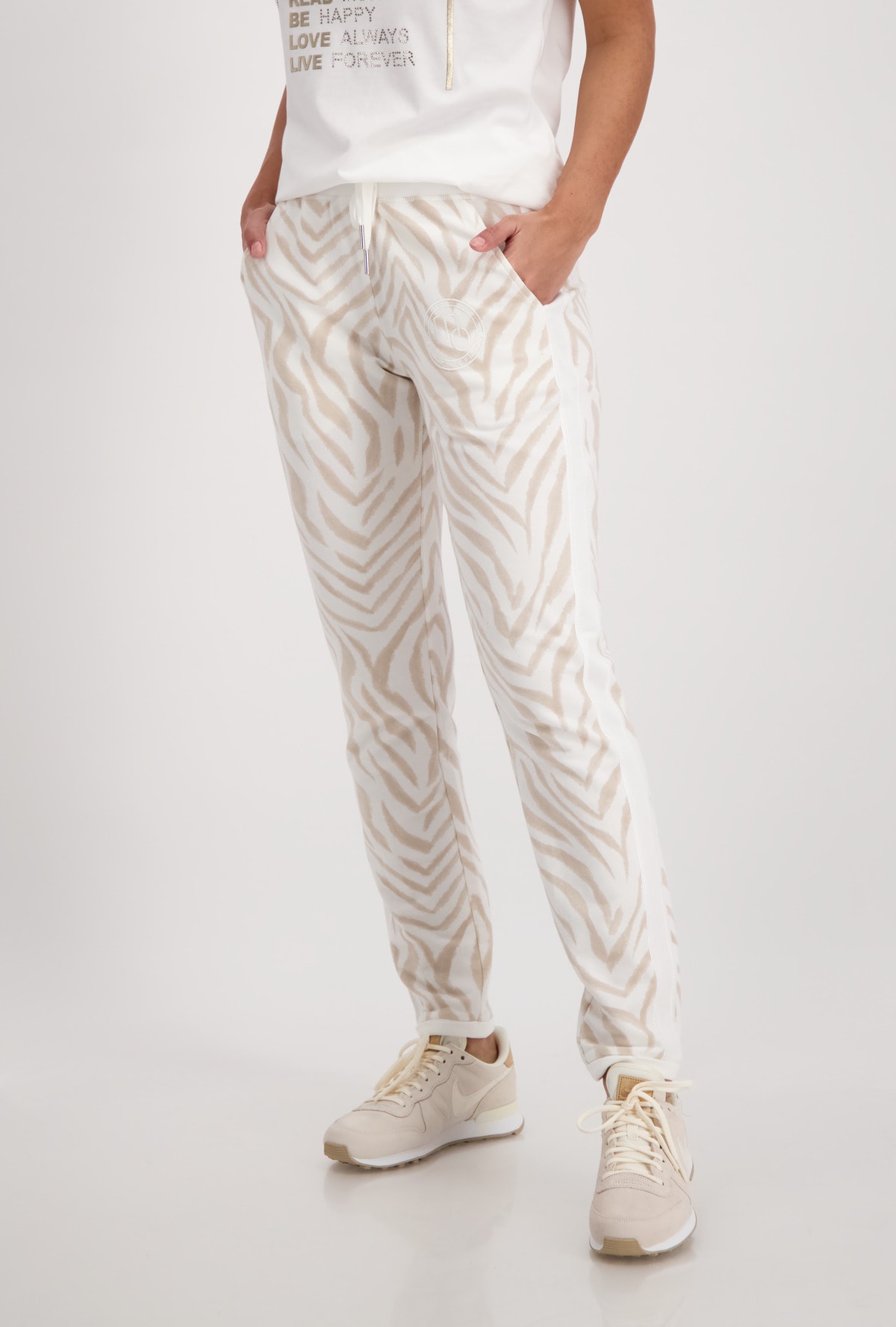 На сайте указаны Российские размеры. Спортивные джоггеры Monari с животным принтом. Сплошной рисунок под зебру дополняется однотонным поясом с блестящими оверлочными швами, однотонной тканевой вставкой с блестящими оверлочными швами по бокам и подвернутыми однотонными штанинами. Боковые карманы и накладные карманы на ягодицах завершают вид спортивных штанов с нормальной посадкой. Параметры модели: 42 размер, рост 179 см