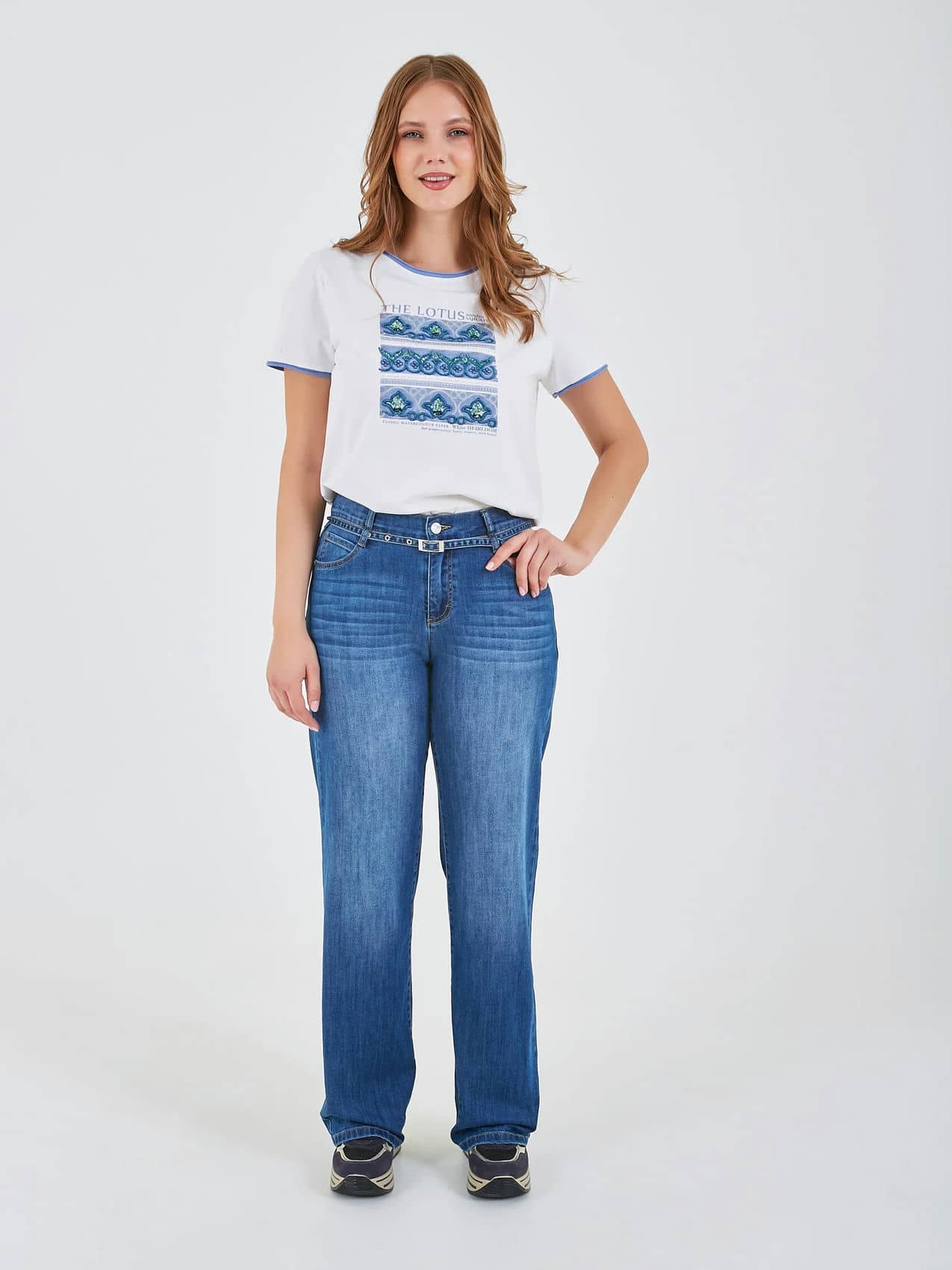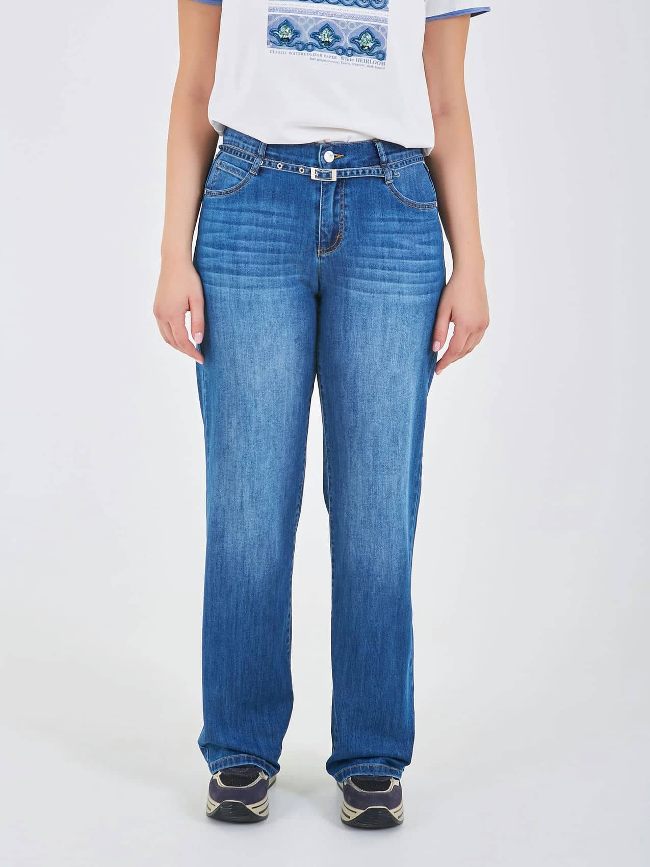 Джинсы прямого кроя на средней посадке с акцентным декоративным ремнем спереди. Коллекция Весна-Лето 2025-2026. Капсула "Сен-Тропе". Параметры модели: 95-64-101, рост 175, размер 44-46