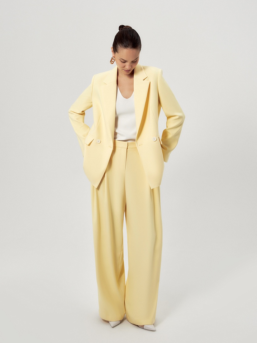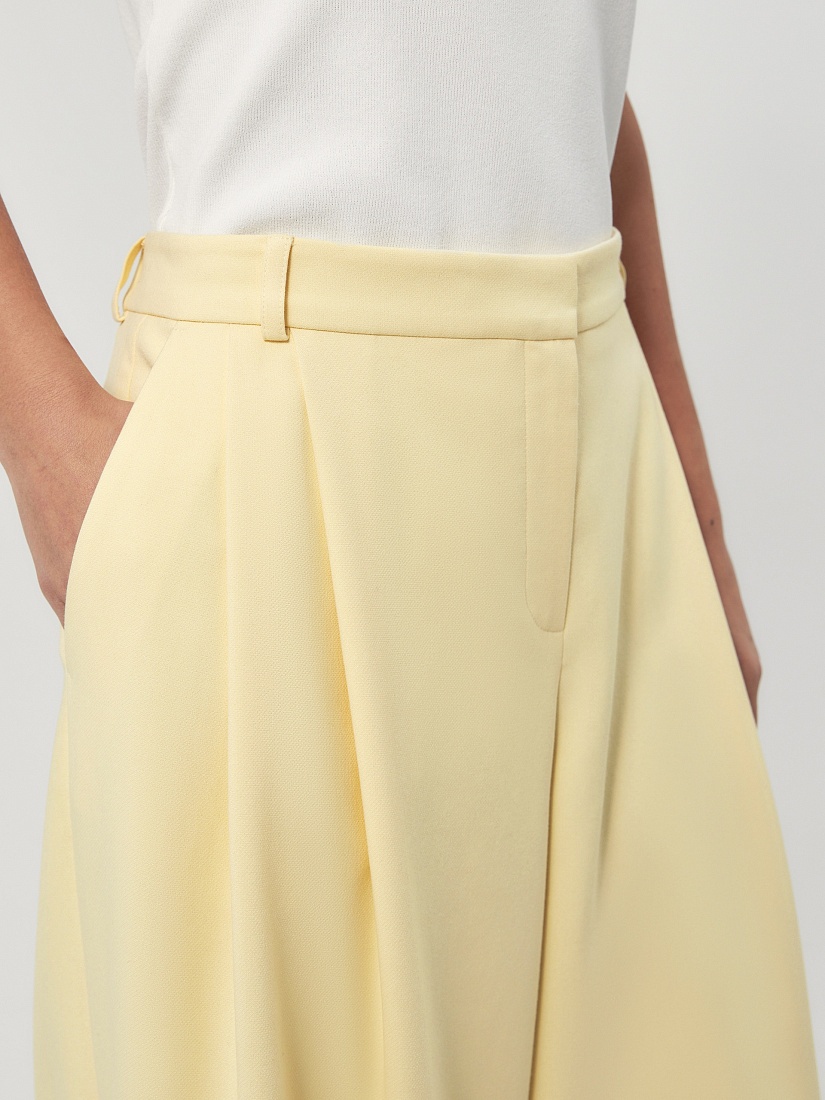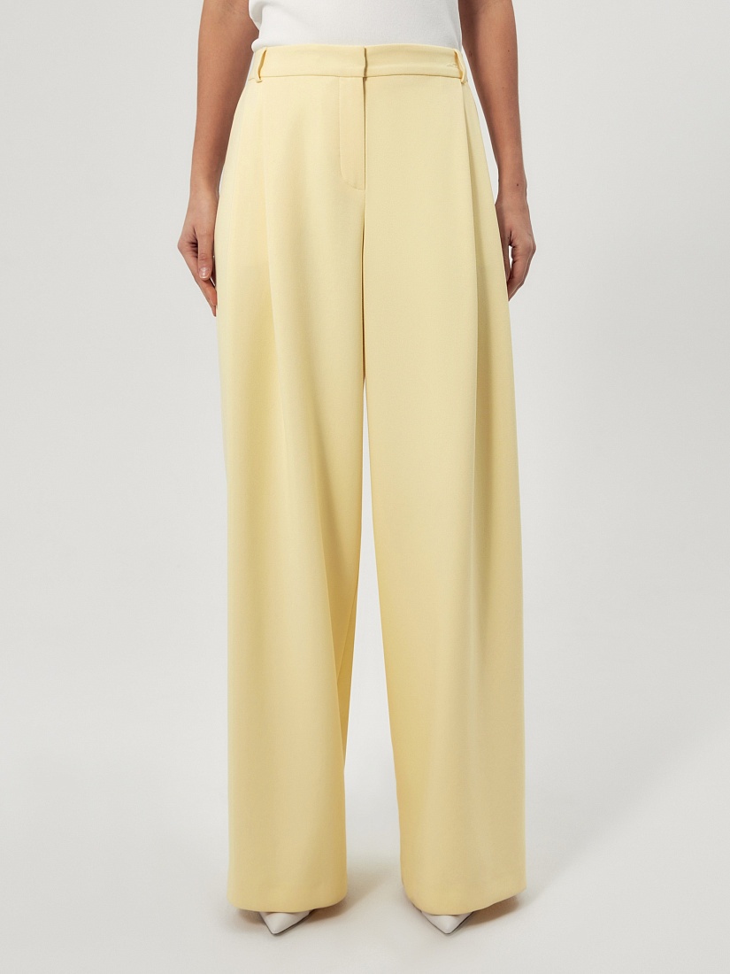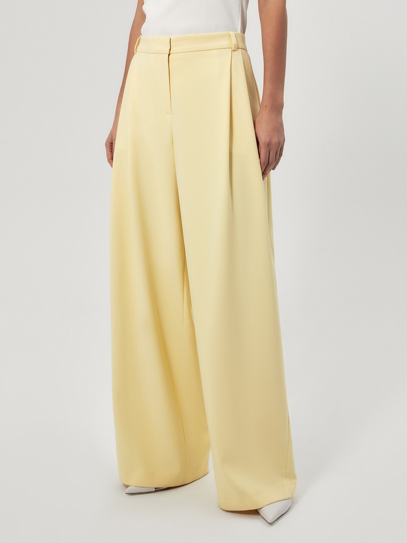 Широкие брюки со складками на приточном поясе из костюмной ткани молочного цвета со шлевками. Спереди боковые карманы и застежка на молнию и крючок, на спинке резинка в поясе для лучшей посадки брюк.