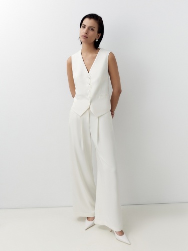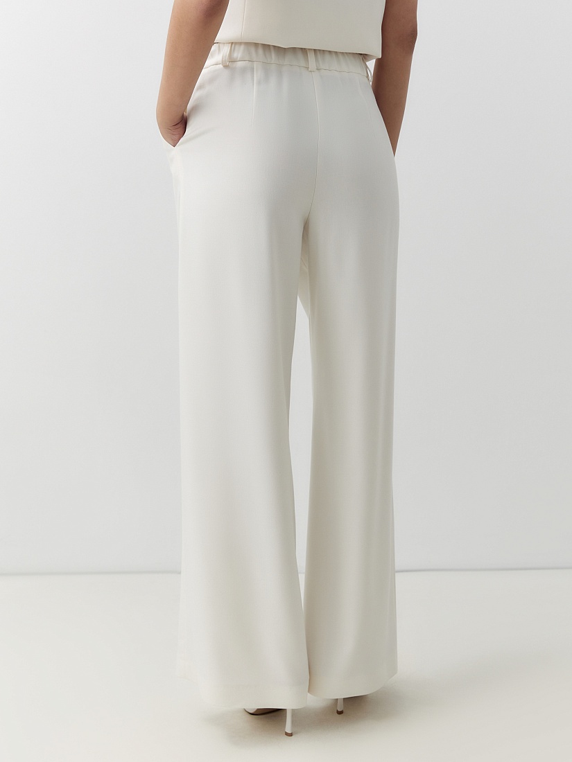 Прямые широкие брюки со складками на высокой посадке с притачным поясом. Брюки выполнены из костюмной ткани с добавлением вискозы молочного цвета. Имеют два функциональных кармана по бокам. На спинке есть резинка.
