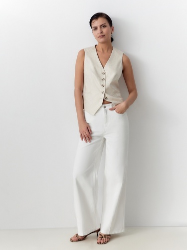 Широкие прямые джинсы из 100% молочного хлопка с твиловым переплетением для лучшей формоустойчивости. Полная длина позволяет носить их с обувью на каблуке. Застежка молния и болт.