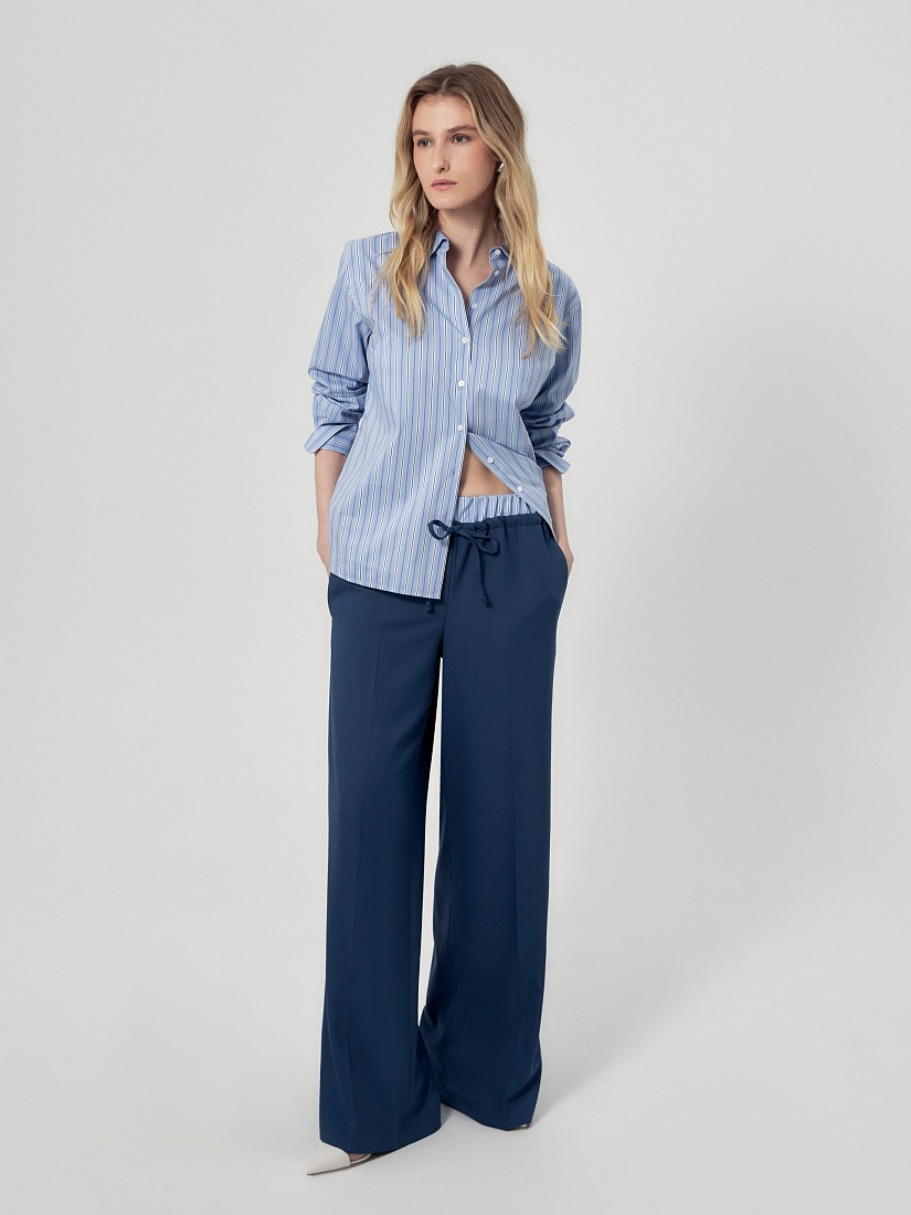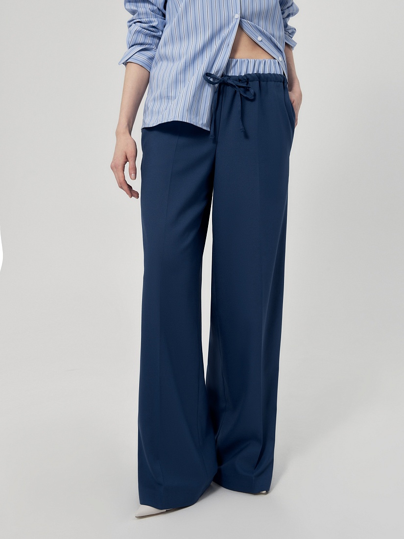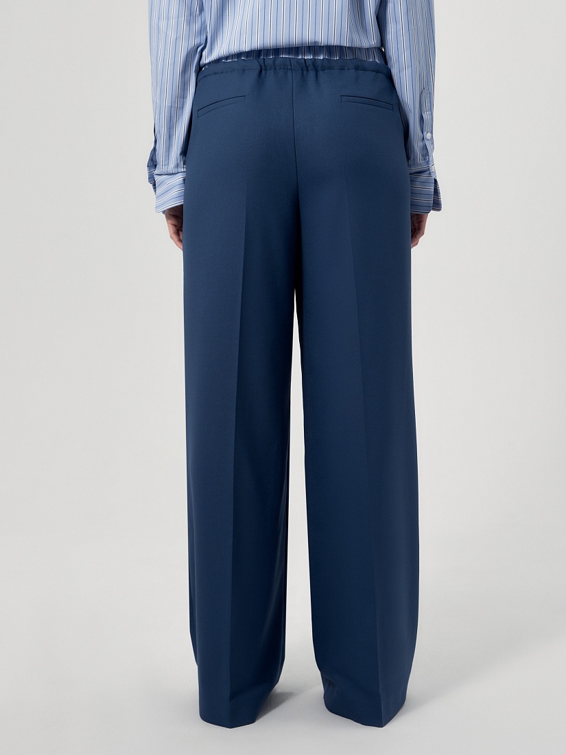 Широкие брюки на резинке и кулисе из костюмной ткани темно-синего цвета. Составит идеальный комплект с укорочённым жилетом из одной ткани.